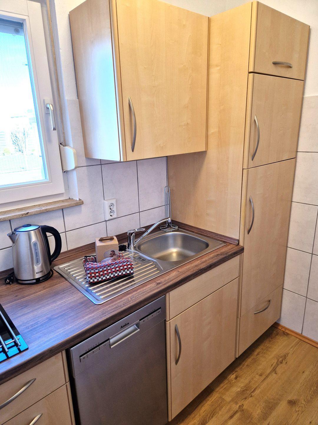Die Küche ist ausgestattet mit einem 2 Platten Ceranfeld, Spülmaschine und Kühlschrank.