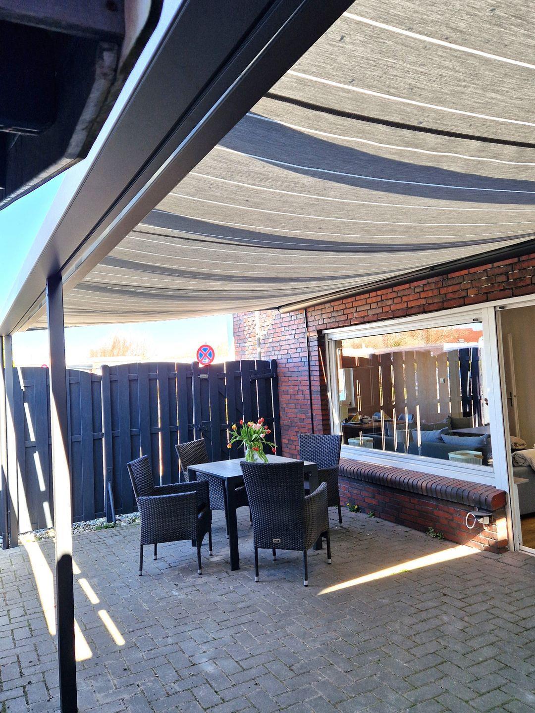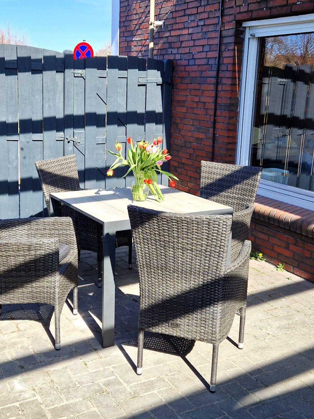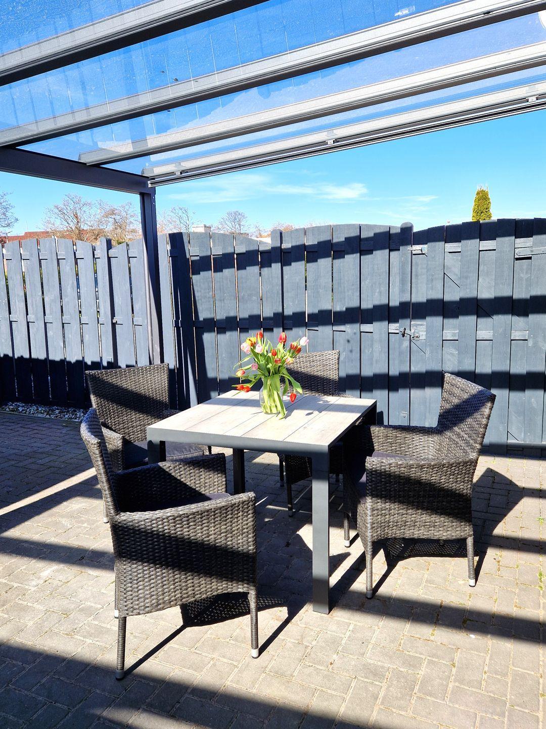 Die Terrasse ist mit Sitzmöbel ausgestattet und komplett geschlossen. Hier wurde Privatsphäre geschaffen.