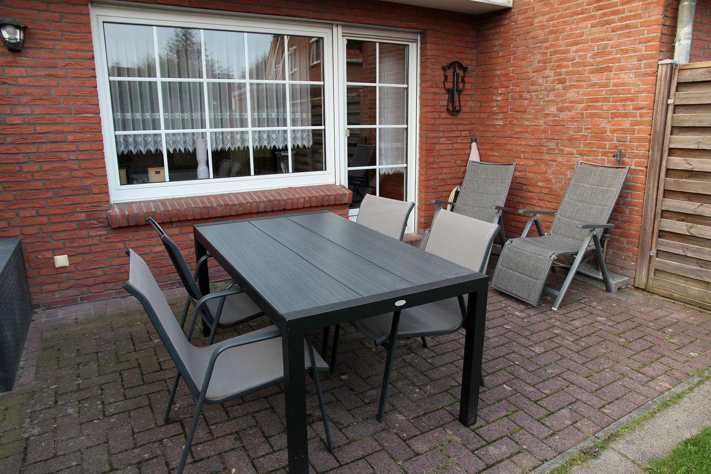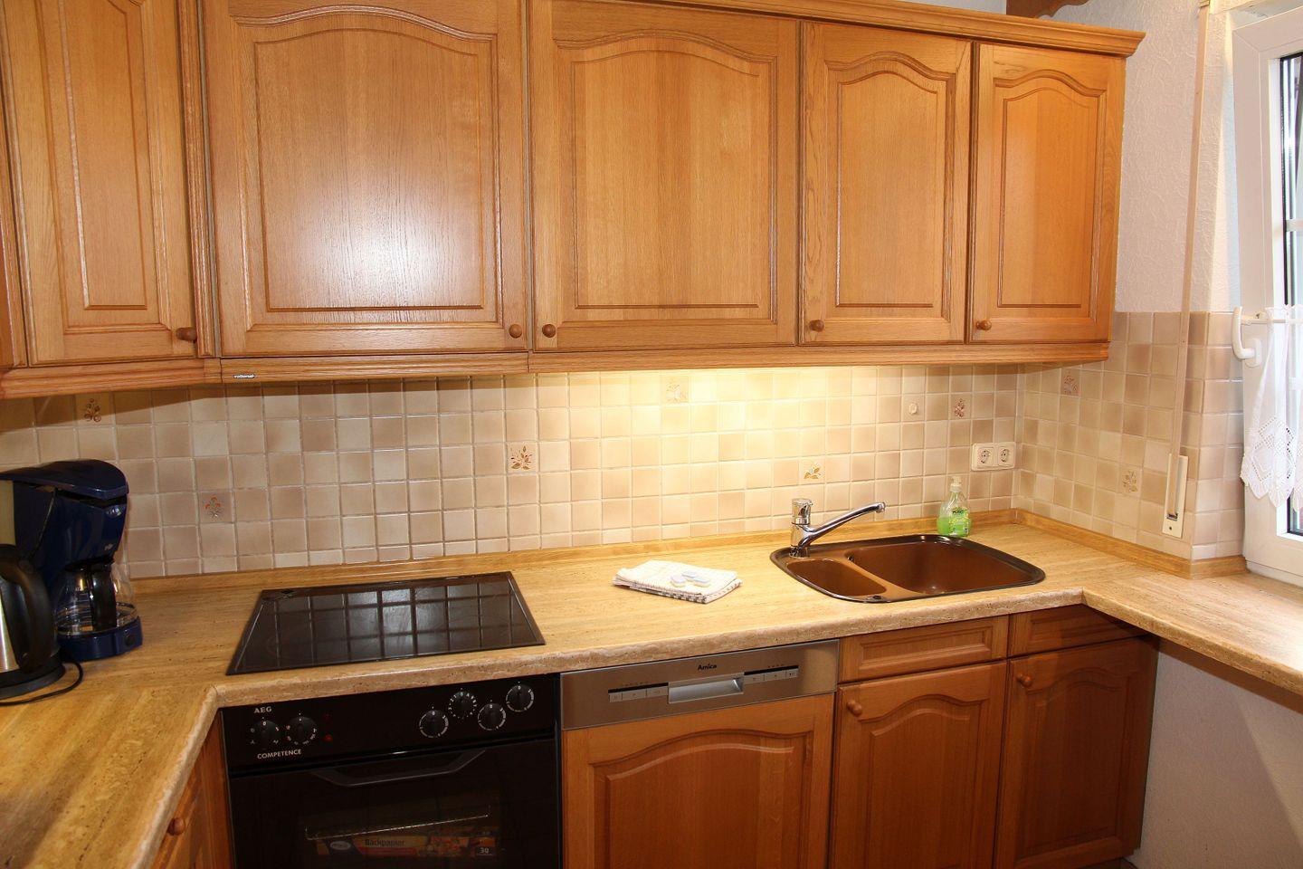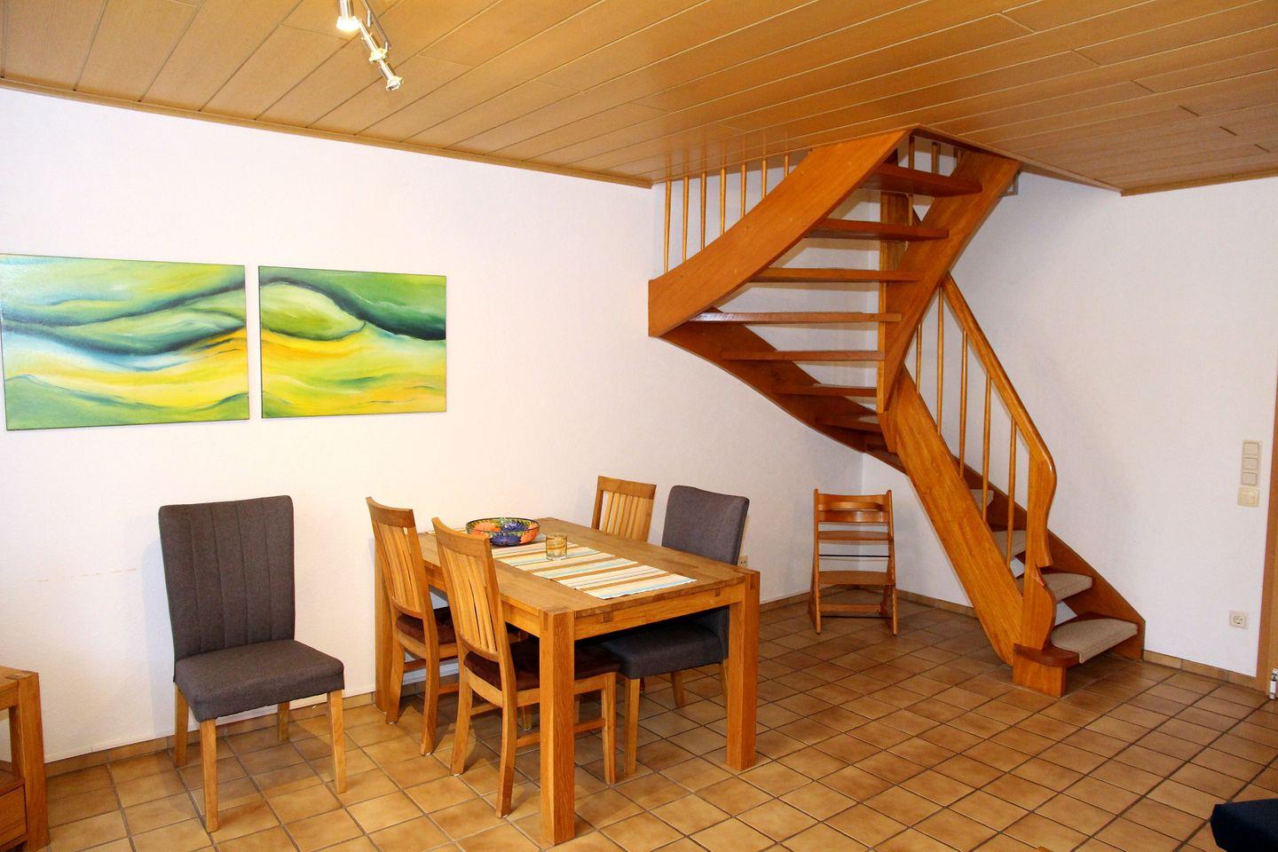 Im Erdgeschoss des Hauses befinden sich direkt vom Eingangsbereich ausgehend ein Badezimmer mit ebenerdiger Dusche und Fenster, sowie die Küche, die mit ihrer Ausstattung (u.a. Kühlschrank mit Gefrierfach, Backofen, Cerankochfeld, Spülmaschine, Mikrowelle, Kaffeemaschine, Wasserkocher, Toaster) nahezu keine Wünsche offen lässt. Weiter geht es in den großzügigen Wohn- und Essbereich mit Sofa und Sessel mit Blick auf den Fernseher. Hier finden Sie auch eine Musikanlage und den Esstisch mit fünf Stühlen und einem Hochstuhl für die kleinen Gäste. Weiterhin gelangen Sie in den kleinen Garten mit möblierter Terrasse (Tisch, 4 Stühle, Sonnenschirm, 2 Sonnenstühle).