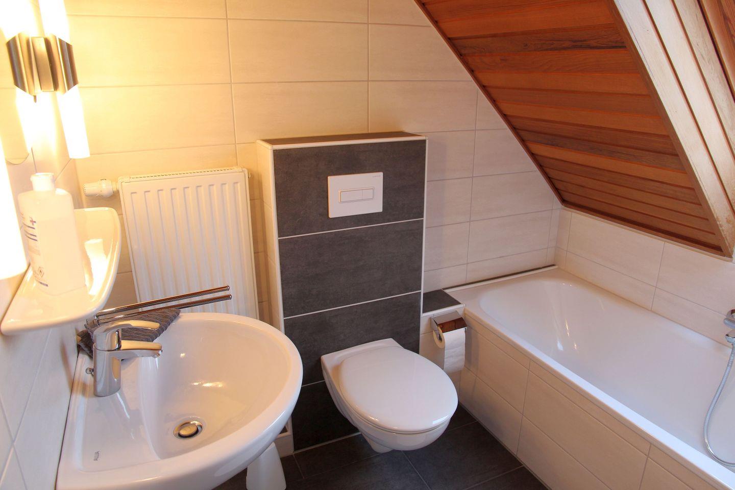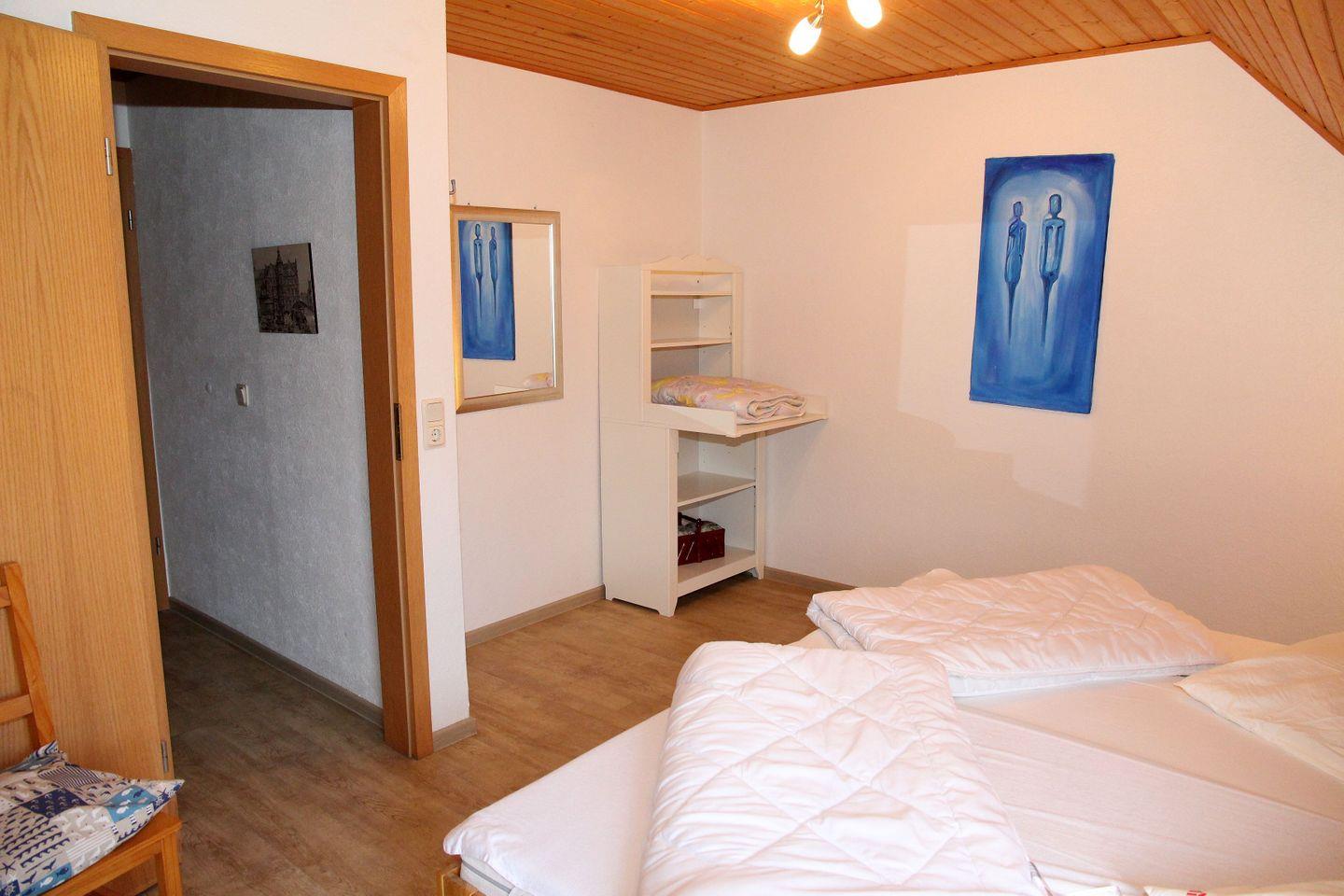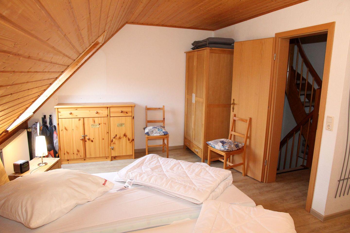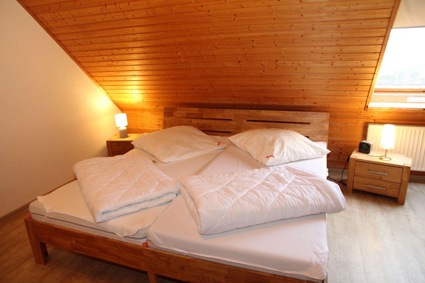 Im Obergeschoss befindet sich ein Schlafzimmer mit Doppelbett (2 x 0,90 m Matratzen), Kleiderschrank, Radio, Wickelkommode, Babybett und optionalem Rausfallschutz. Das zweite Badezimmer verfügt über eine Badewanne und ein Dachflächenfenster. In einem weiteren Raum finden Sie zwei gemütliche Sessel und ausreichend Lesematerial. Das zweite Schlafzimmer mit zwei Einzelbetten befindet sich im ausgebauten Dachgeschoss.