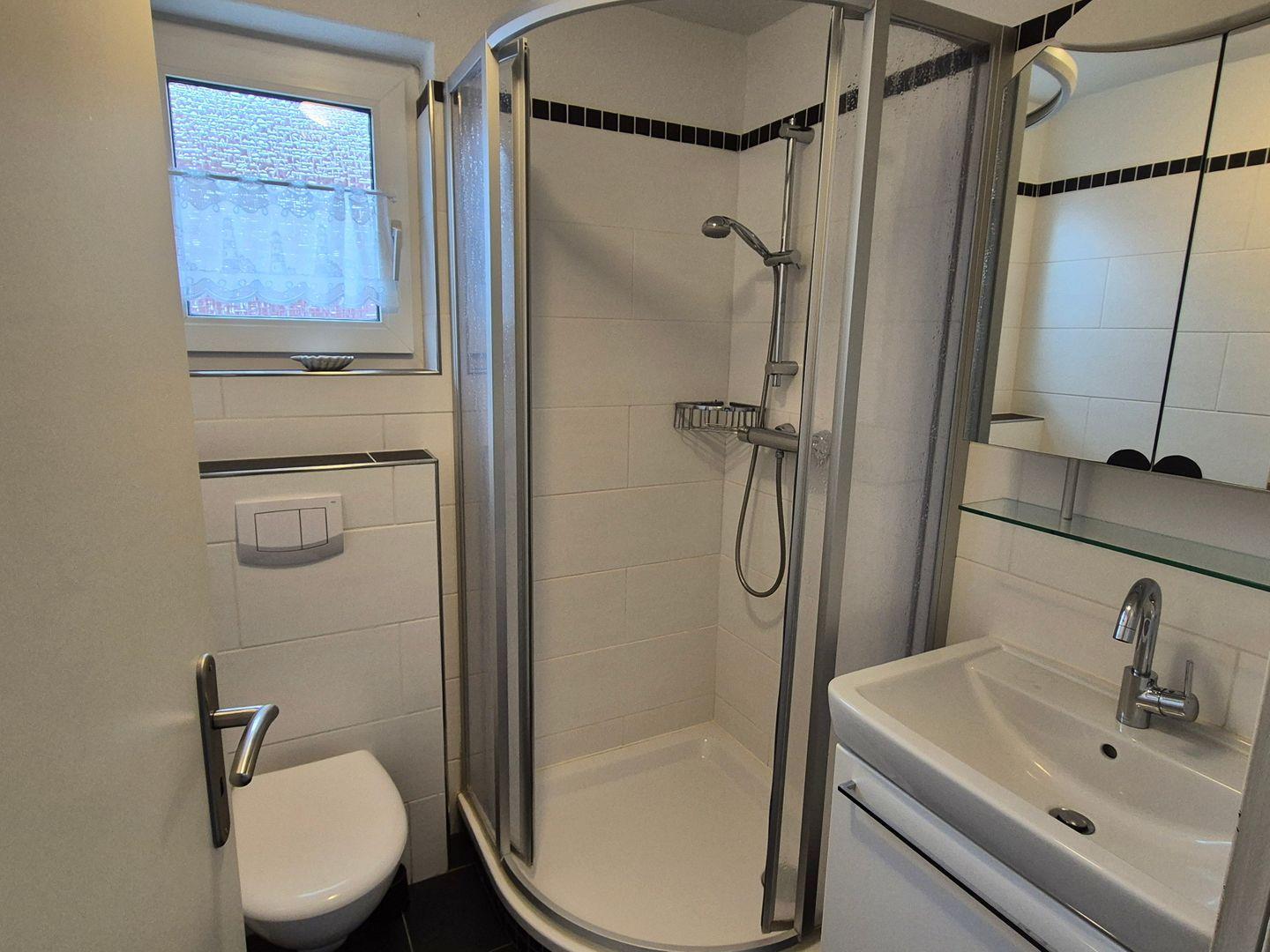 Im Inneren stehen Ihnen im 1 OG. ein kombinierter Wohn- und Essbereich mit toller Küchenzeile zur Verfügung; auch eine Diele, ein modernes Bad mit Dusche, sowie ein gemütliches Schlafzimmer. Ein weiteres Schlafzimmer finden Sie im ausgebauten Spitzboden, dieses erreichen Sie über eine offene Treppe.