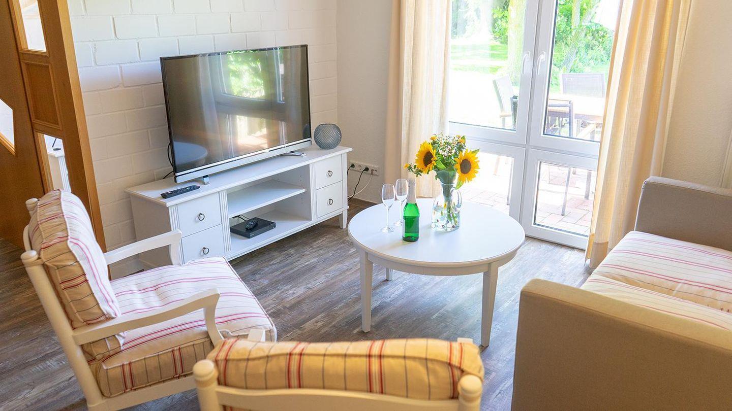 Drei liebevoll eingerichtete Schlafzimmer sorgen für erholsame Nächte, während der helle Wohn- und Essbereich zum Verweilen einlädt. Genieße gemeinsame Mahlzeiten am Esstisch oder mach es dir auf dem Sofa gemütlich – TV und DVD-Player stehen für entspannte Abende bereit.