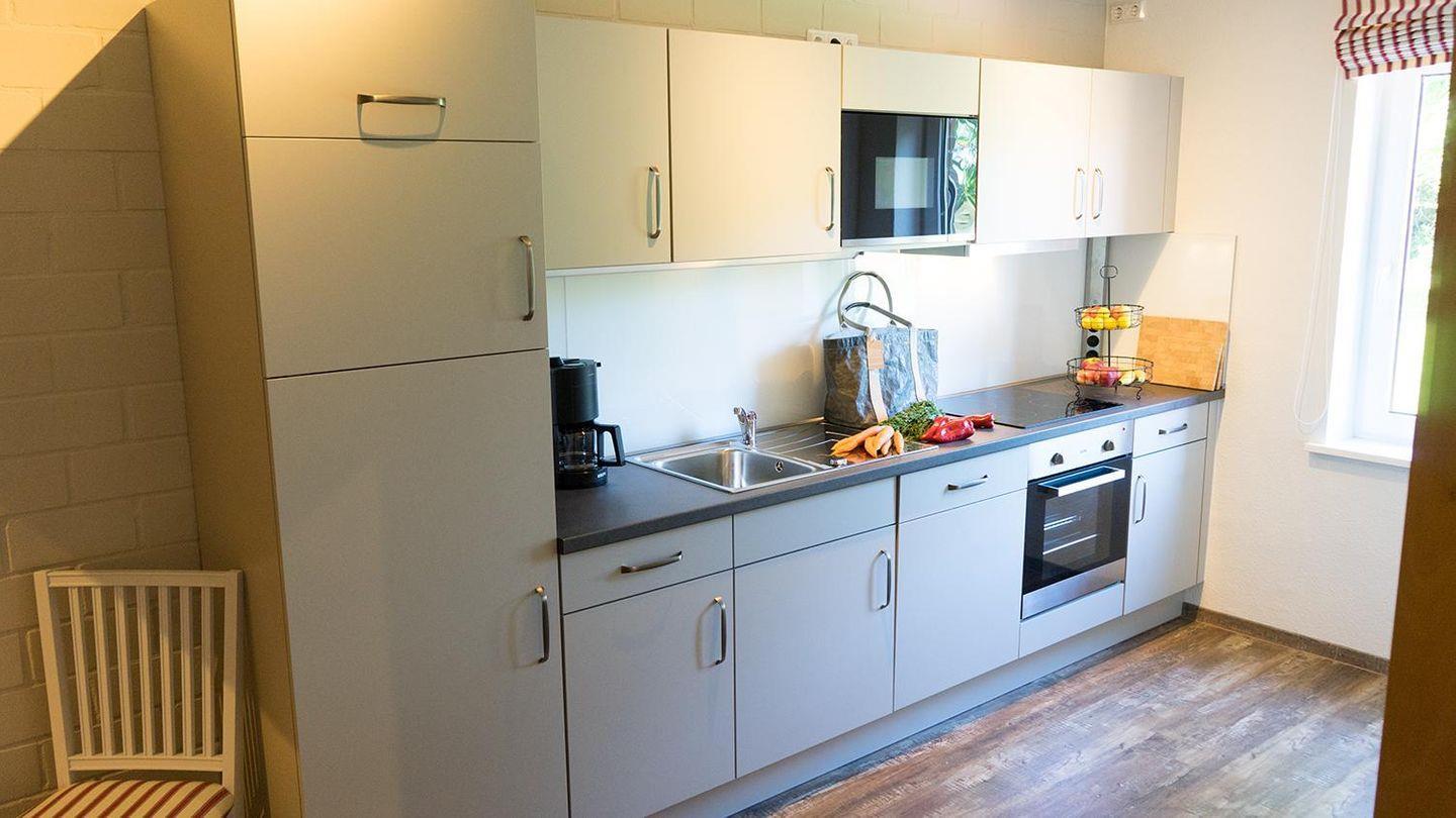 Die voll ausgestattete Kochnische bietet alles, was du brauchst: Herd, Backofen, Spülmaschine, Mikrowelle, Kaffeemaschine, Toaster und Wasserkocher. Für entspannte Stunden im Freien lädt die private Terrasse mit Gartenmöbeln ein.