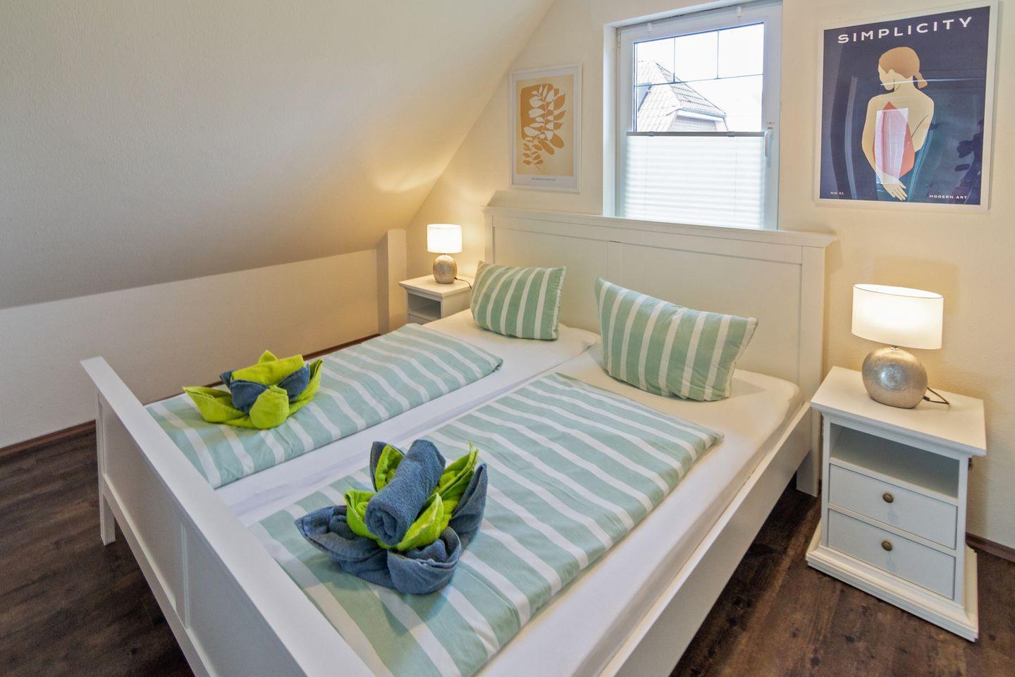 Im Erdgeschoss Schlafzimmer steht ein Doppelbett (160 × 200) und zwei kleine Nachttische mit je einer Nachttischlampe. Eine Kommode und ein großes Fenster mit Plissee und elektr. Außenjalousien und TV.