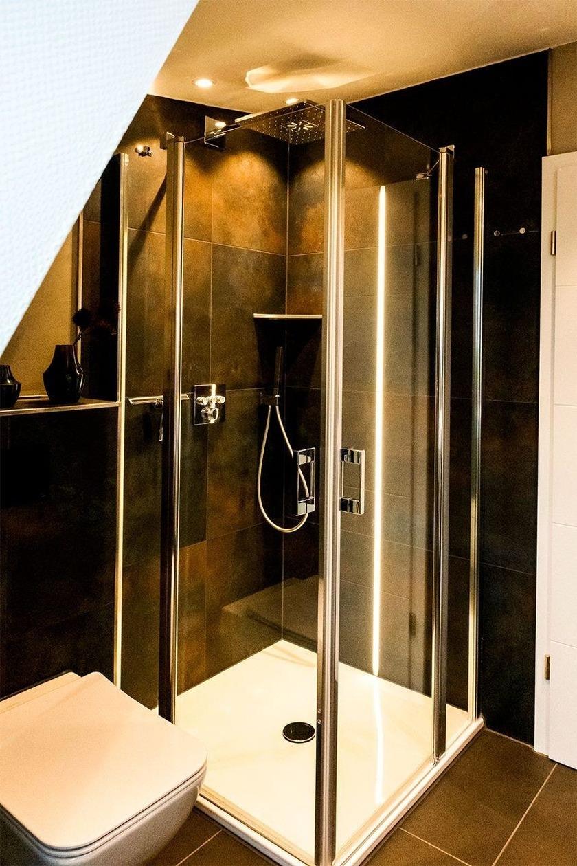 bodenebene Dusche mit Glasabtrennung, Hänge-WC, Waschkombination mit großem Spiegel und Unterschrank.