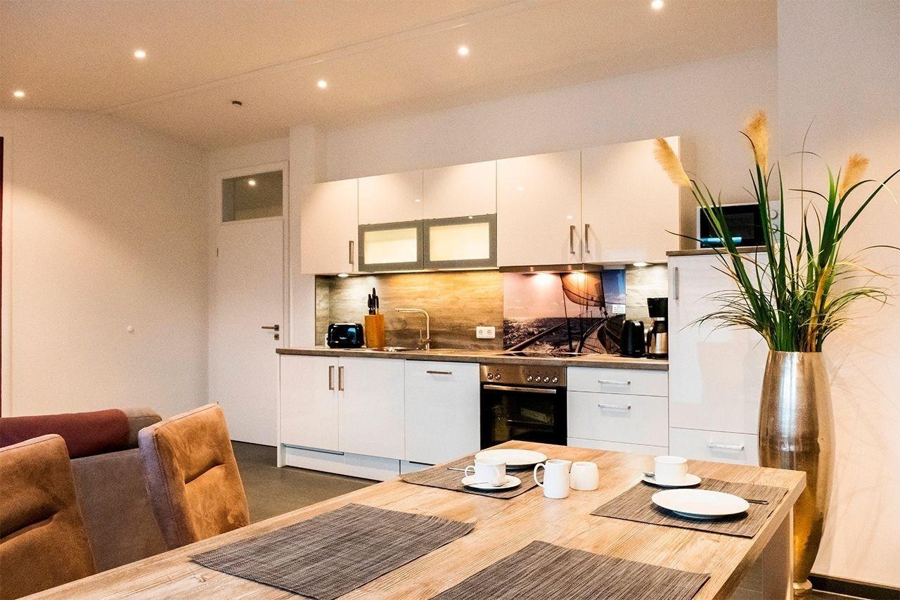 Eine helle Küchenzeile mit Ceranfeld lädt zum Kochen ein. Es ist alles vorhanden, was zur Küchenausstattung gehört: Backofen, Herd, Abzugshaube, Kaffeemaschine, Kühlschrank, Geschirrspüler in der Küchenzeile, Mikrowelle,Toaster, alle erforderlichen Küchengeräte, Geschirr, Gläser, Becher etc. Auch eine Waschmaschine ist dort eingebaut und kann gegen eine geringe Gebühr genutzt werden. Der Essbereich mit großem Tisch steht direkt bei der Küche und bietet Platz für 4 Personen und einen Hochstuhl fürs Kleinkind.