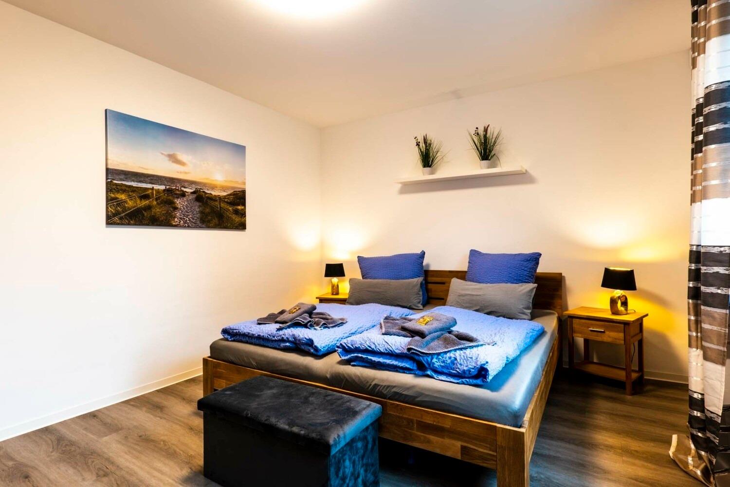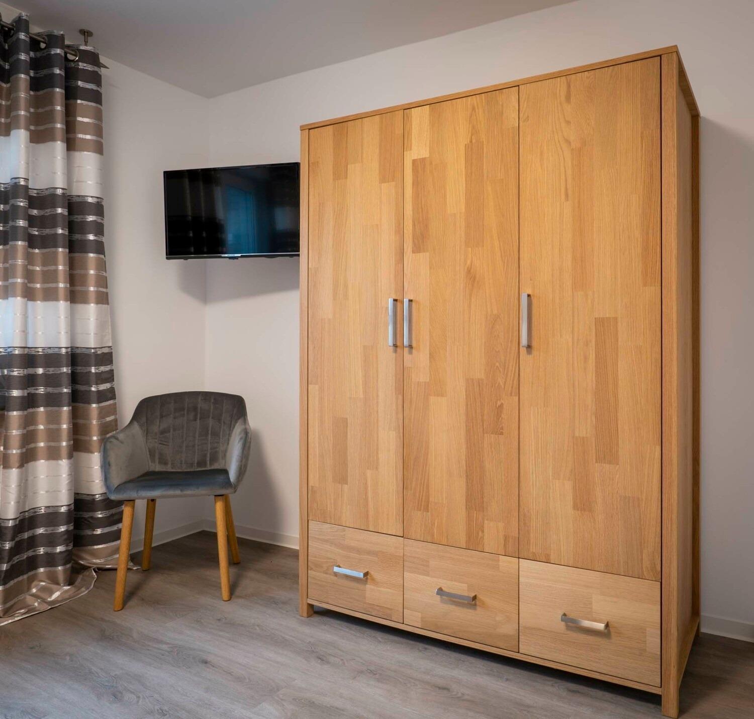 Im Schlafzimmer befindet sich ein Ehebett, Schrank und TV Gerät
