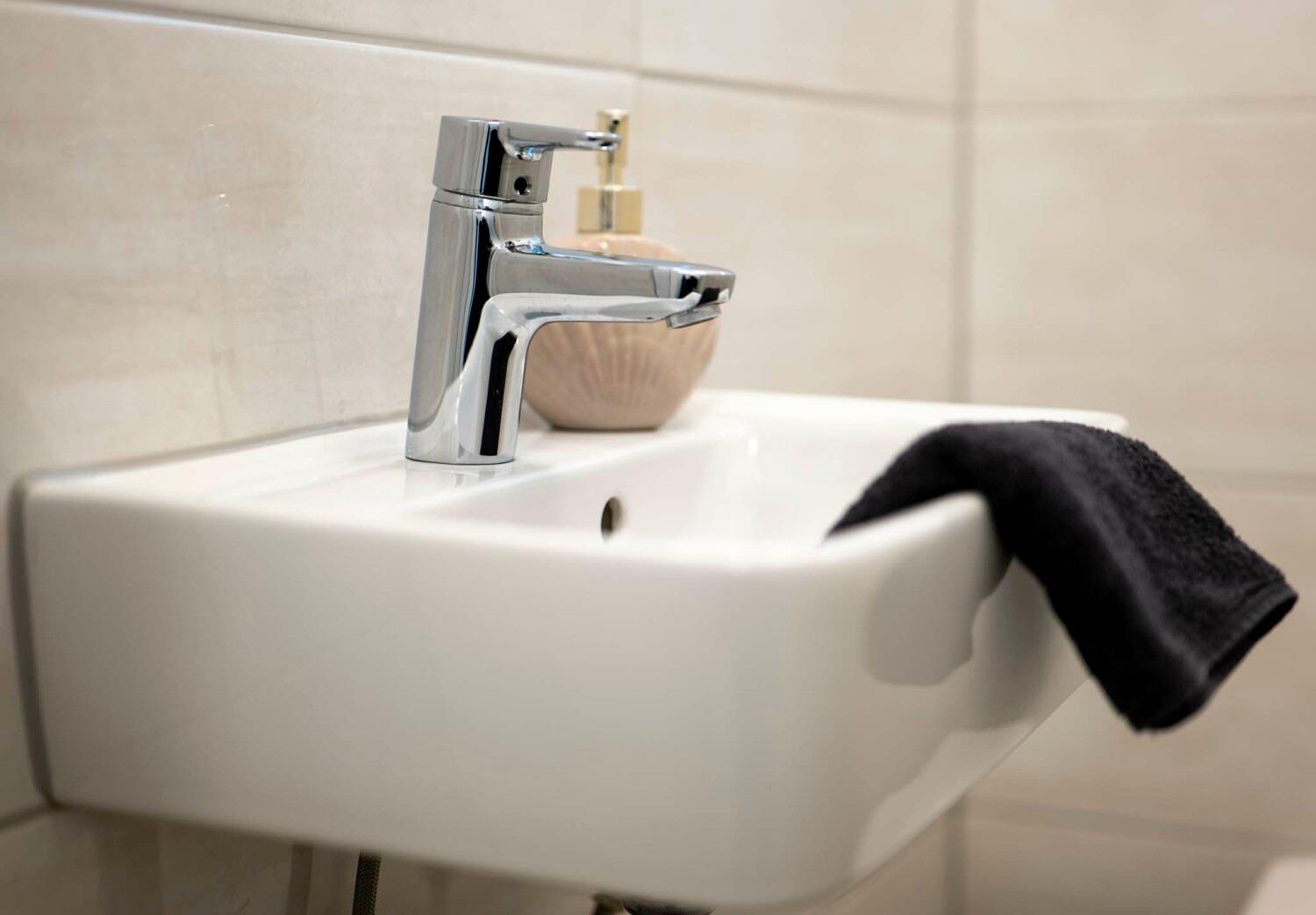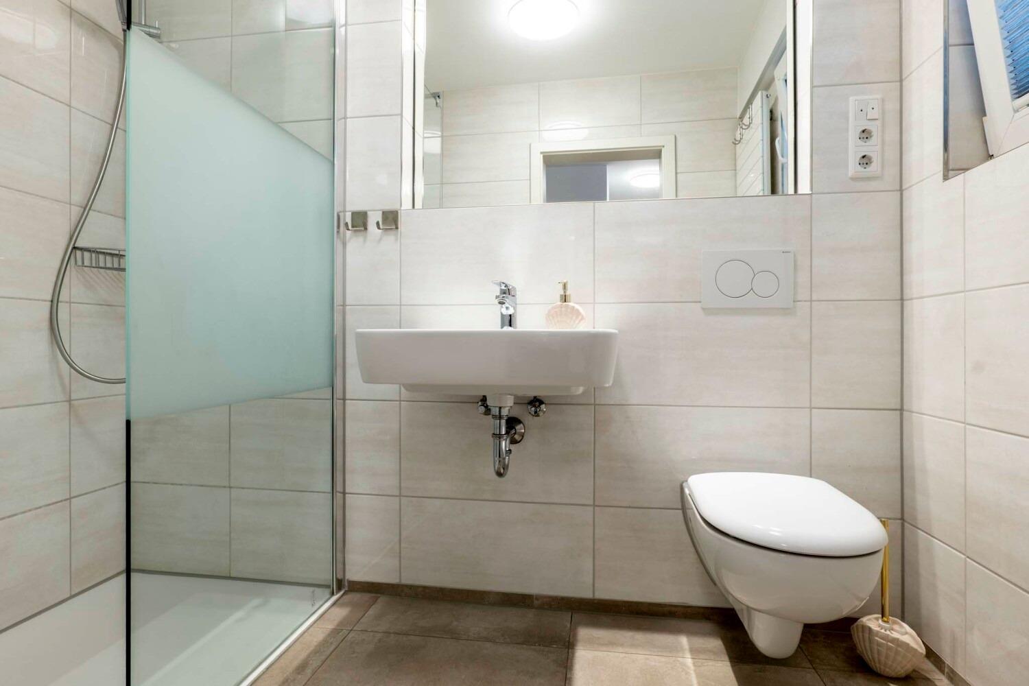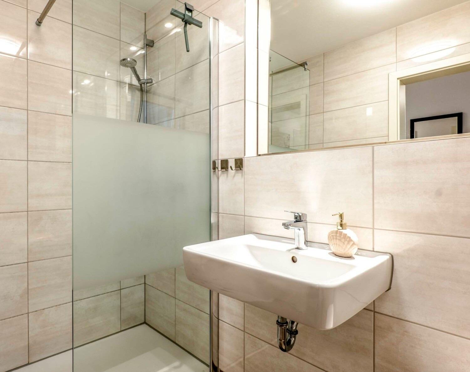 Das Badezimmer ist modern ausgestattet und verfügt über eine Dusche.