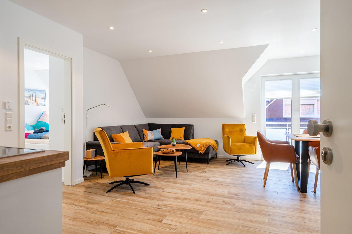 Die Maisonette-Ferienwohnung von 62qm befindet sich in einem neu erbauten Haus unweit des Strandes. Nur wenige Meter müssen zurückgelegt werden bis zum Deich und der Strandpromenade. Hier finden bis zu sechs Personen und ein Kleinkind (unter 2 Jahre) Platz. Der großzügige Wohn- und Essbereich ist strahlend hell und mit allen Annehmlichkeiten wie Couchgarnitur, Esstisch mit 6 Stühlen, großes Smart-TV und WLAN ausgestattet.