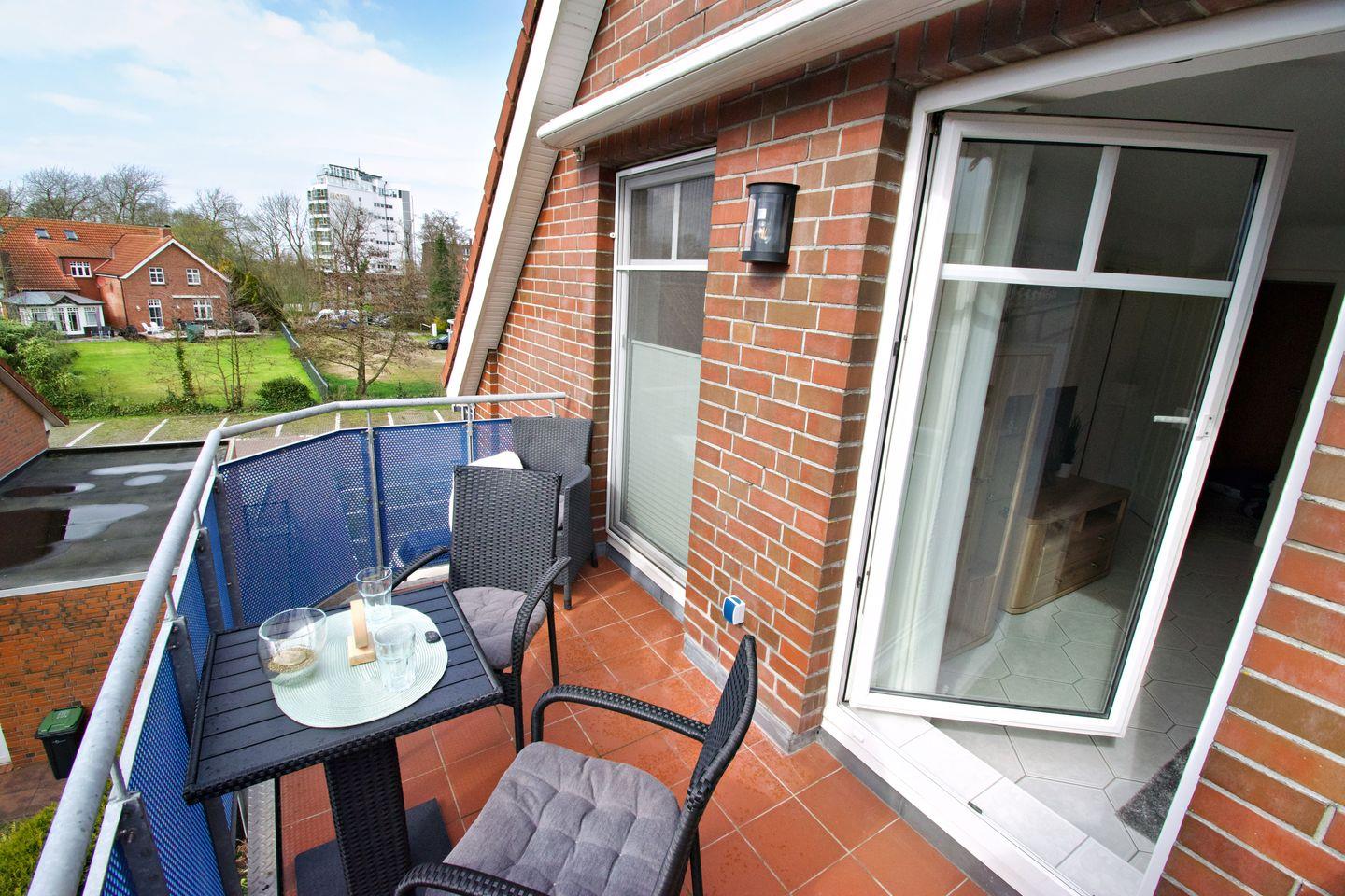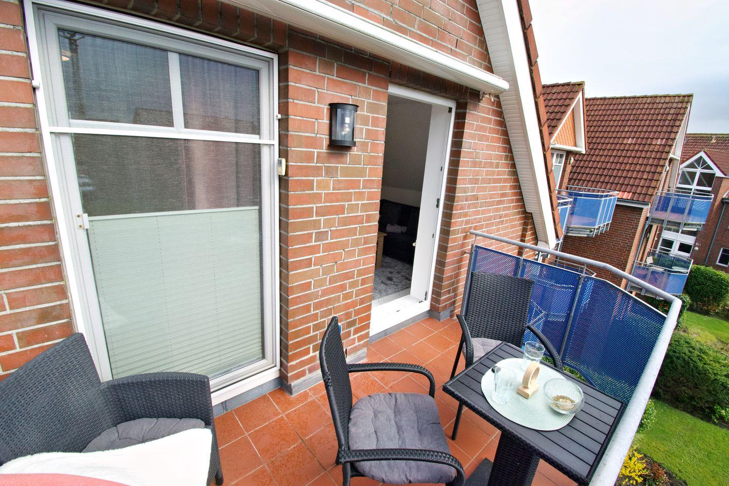 Ein besonderes Highlight der Ferienwohnung ist der Balkon mit direktem Blick auf einen gepflegten Teich – eine wahre Oase der Ruhe. Hochwertige Gartenmöbel und eine ausfahrbare Markise laden zum Verweilen ein. Genießen Sie hier entspannte Stunden bei einem Glas Wein oder beobachten Sie den Sonnenuntergang über Norddeich.