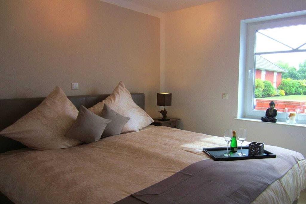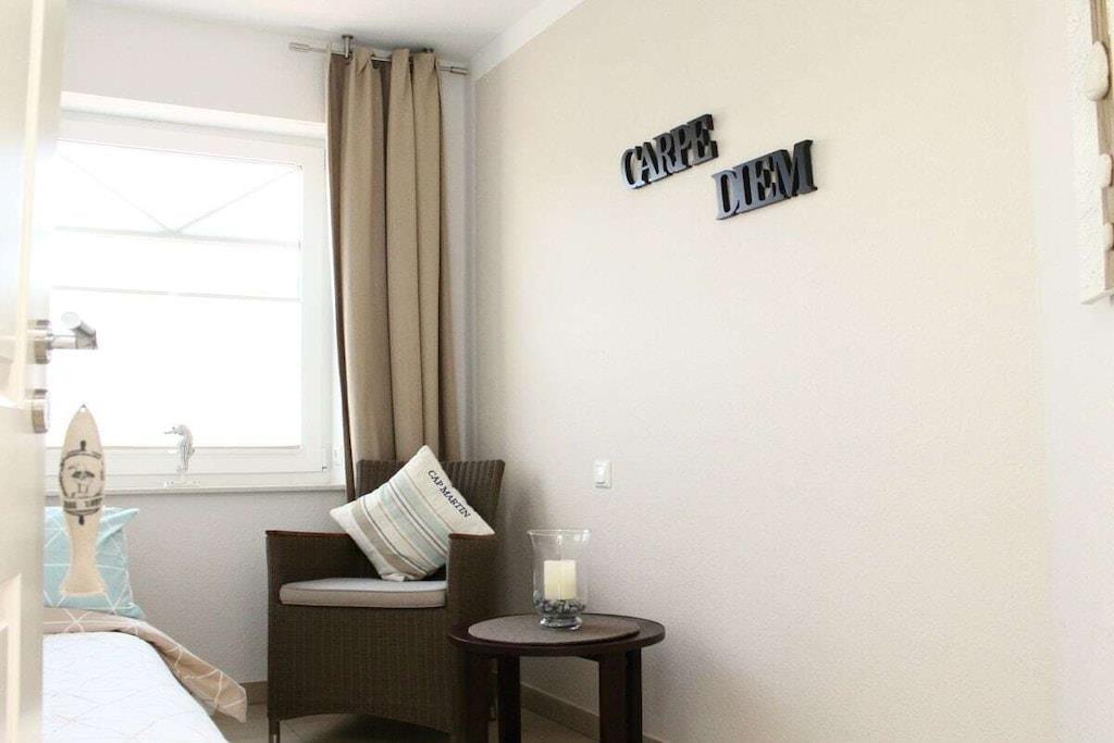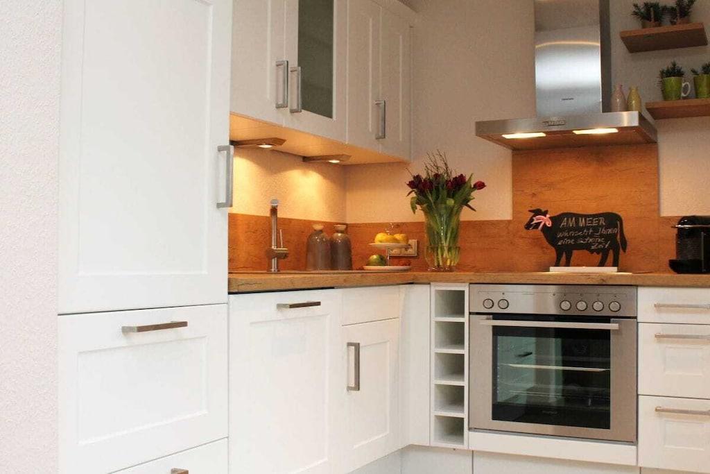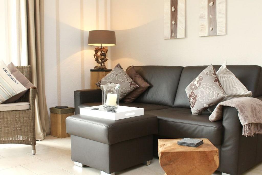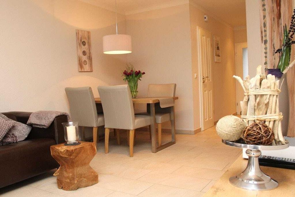 Modern vacation apartment with a contemporary feel You'll feel at home here! The natural tones of white, sand, and brown dominate the "modern country" decor. Old style elements combined with modern furnishings give the apartment an exclusive flair. The cozy living area invites you to linger with its brown leather couch (3-seater), flat-screen TV, and Blu-ray player. Experience sleeping comfort like in a luxury hotel; a box spring bed guarantees restful sleep. Another highlight of the bed is its comfortable bed height and the electrically adjustable head and footboard. In the second bedroom, a cozy single bed and a lovely reading nook offer a great place to retreat. The apartment is designed for 2 to 3 small or large guests and a baby and is fully equipped with high-quality tiles and underfloor heating in all rooms. All windows have electric shutters. A modern bathroom with a large walk-in shower completes the feel-good concept. Especially important was the light-filled design. A large sunny terrace with comfortable garden furniture, a parasol, and a deckchair invites you to relax. And there's also a large beach chair on our sun terrace! The apartment is furnished with great attention to detail. A parking space and an outdoor storage room are also included. As this is an allergy-friendly vacation rental, pets and smoking are not allowed. The garden is fully fenced and has its own storage room, for example, for bicycles. By the Sea is located in a cul-de-sac and has a large south-facing garden. The beach and OceanWave, the spa gardens, and the seal sanctuary are just a few minutes' walk away via the beach paddock. Many inclusive services such as Nespresso capsules and tea, etc., round out this wonderful vacation package.