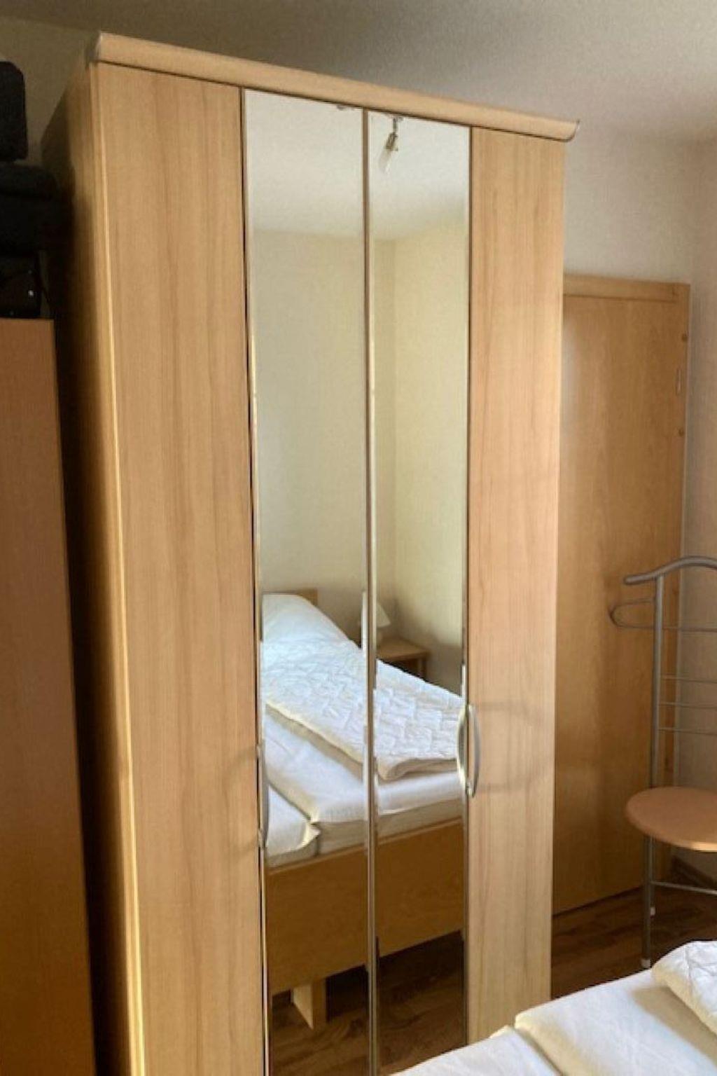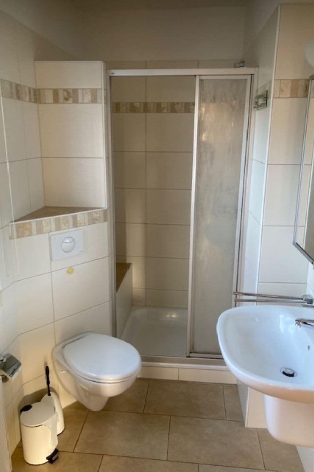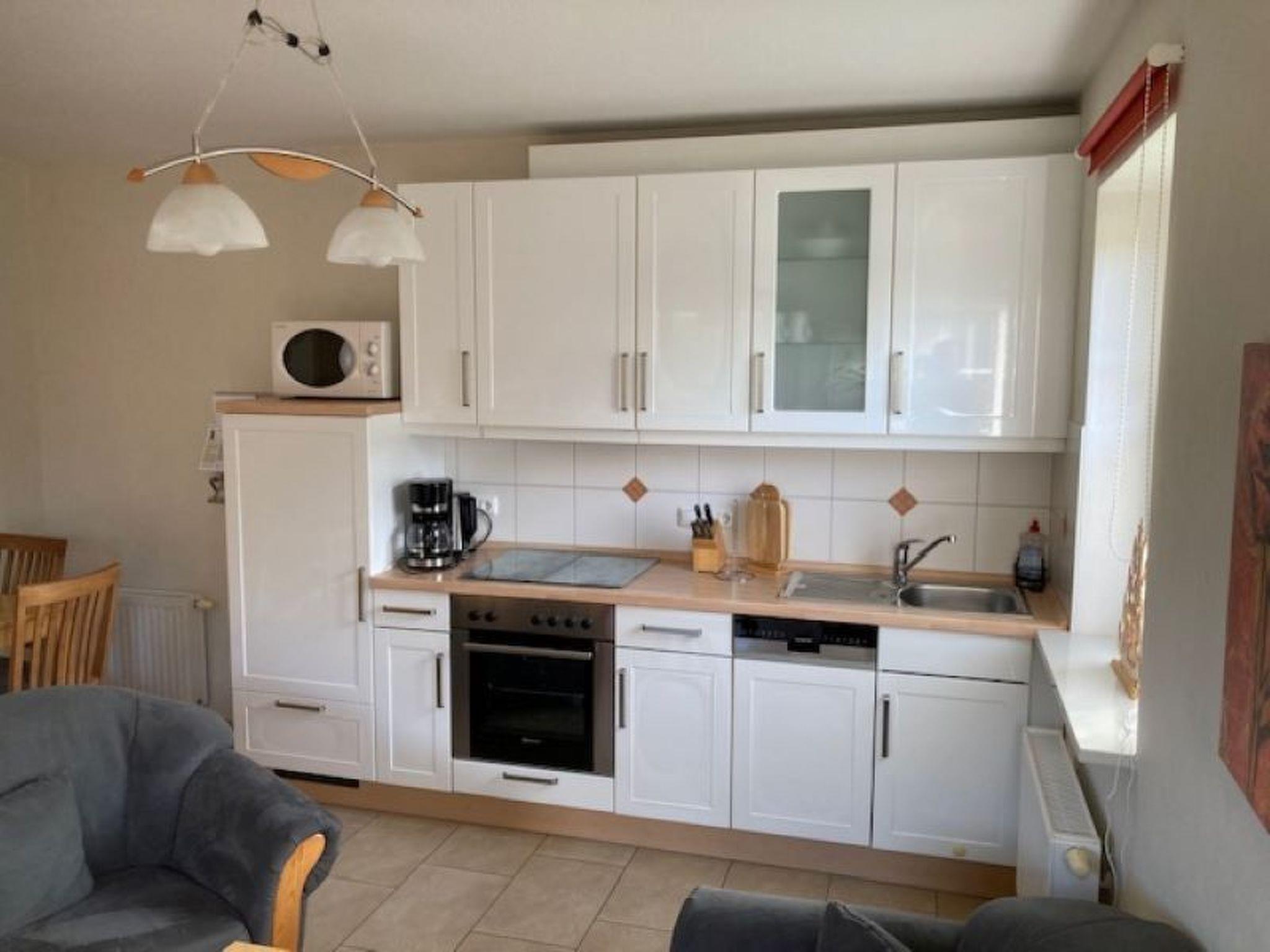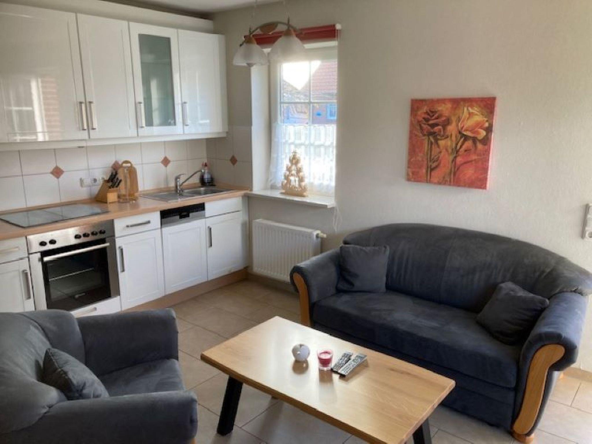 For rent is a small holiday flat with a bedroom, a shower room and a living area.the bedroom is equipped with a 1,80x2,00m bed as well as a wardrobe and two bedside tables.in the bathroom there is a shower, a toilet, a washbasin, underfloor heating and radiators.the larger living area offers a fully equipped kitchen with dining area, seating area and TV corner.outside the flat still offers a sitting area with garden chairs and also a nice wooden bench.parking is directly at the property.
