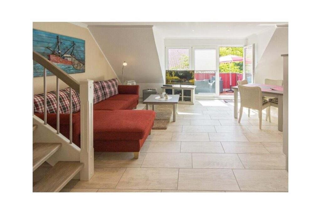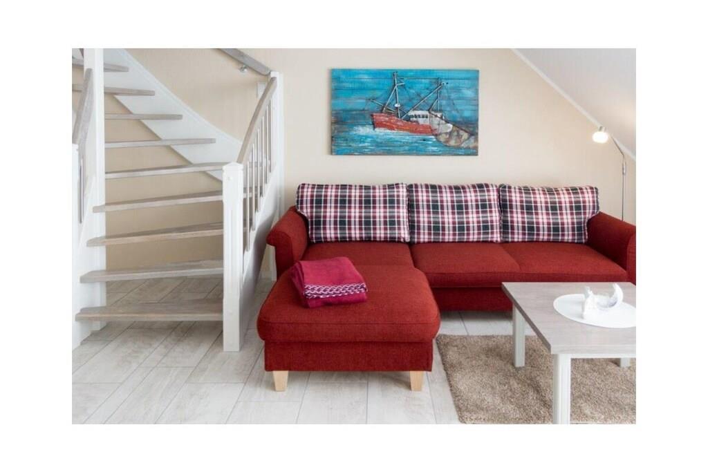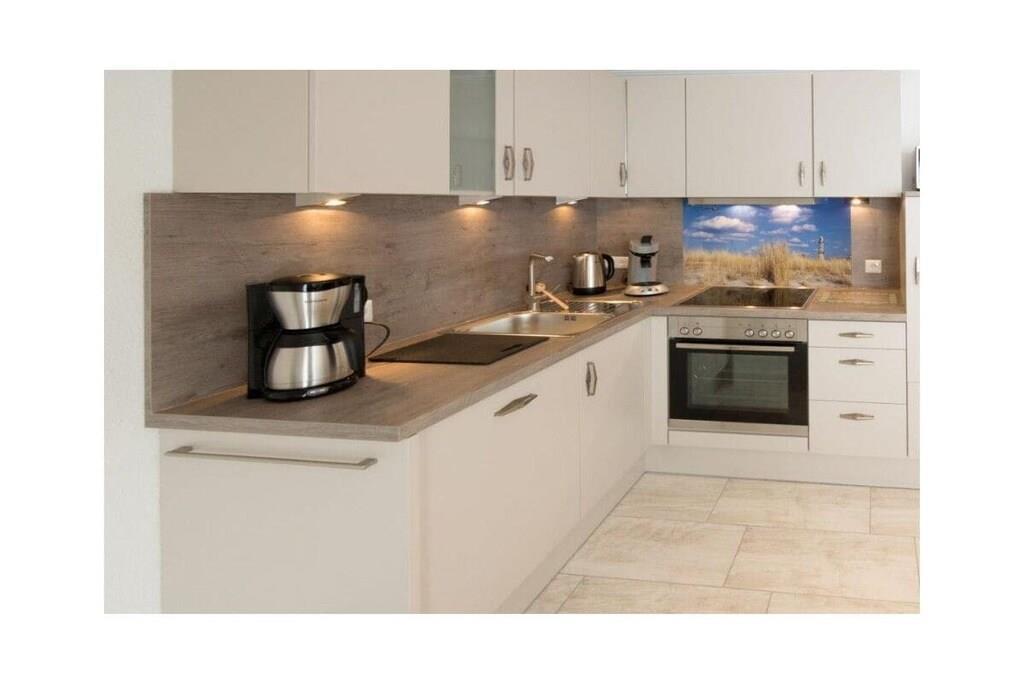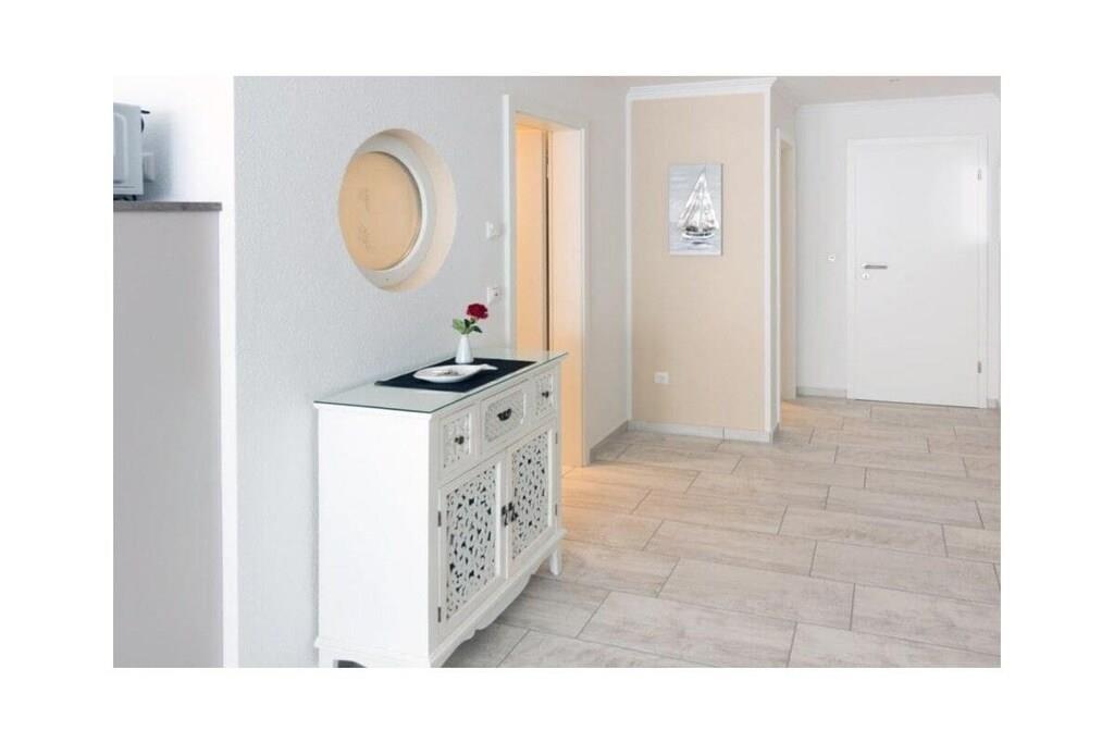 Holiday apartment Ankerplatz D7 Ankerplatz D7 is a holiday apartment for guests who love comfort and class even on holiday. Only completed in 2016, this property is particularly modern and luxurious. The interior was chosen with care and good taste. The maritime charm is noticeable everywhere, but is completely subtle. With the double room including a comfortable electrically adjustable box spring bed and the youth room with a single bed, the holiday apartment Ankerplatz D7 is ideal for 2 people with a child aged 5 and over. You can cook to your heart's content in the large, cozy kitchen. Amenities such as an oven with ceramic hob, a refrigerator with freezer compartment, a microwave, a dishwasher, a Senseo coffee machine, a filter coffee machine, a toaster, an egg cooker, a kettle and a blender are available. Full entertainment awaits guests in the cozy living area. Flat-screen TV with Internet functions such as Netflix, U-Tube and media library, plus a Blu-Ray DVD player and a CD player leave nothing to be desired. All shutters can be controlled electronically. You can also electronically adjust the underfloor heating to the desired temperature. The holiday apartment also has a storage room in which you can use a washing machine free of charge, a vacuum cleaner, dustpan & broom, clothes rack with clothespins, ironing board and iron. There is a storage room outside where you can safely park your bicycles. For a carefree start to your vacation, book our linen package. This consists of bed linen, towels, shower mats, tea towels and a service set (toilet paper, dishwasher tablets, garbage bags, dish brush, cleaning cloths and other small helpers) for a carefree start to your vacation.