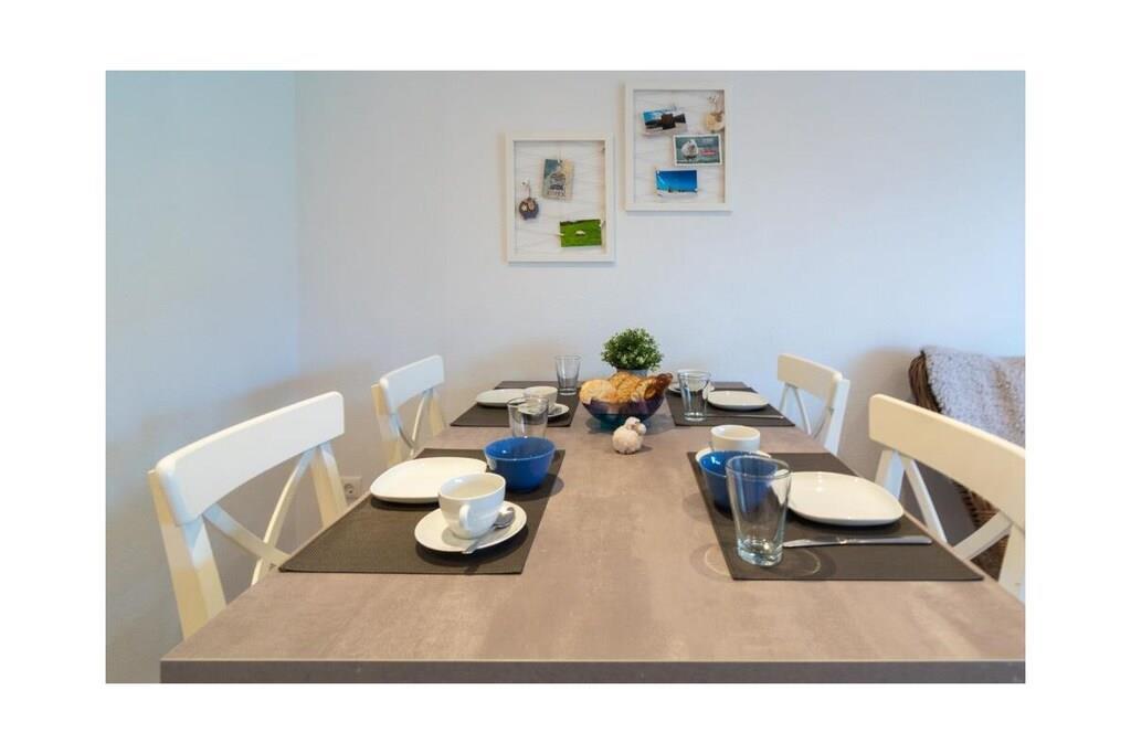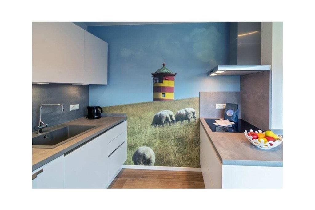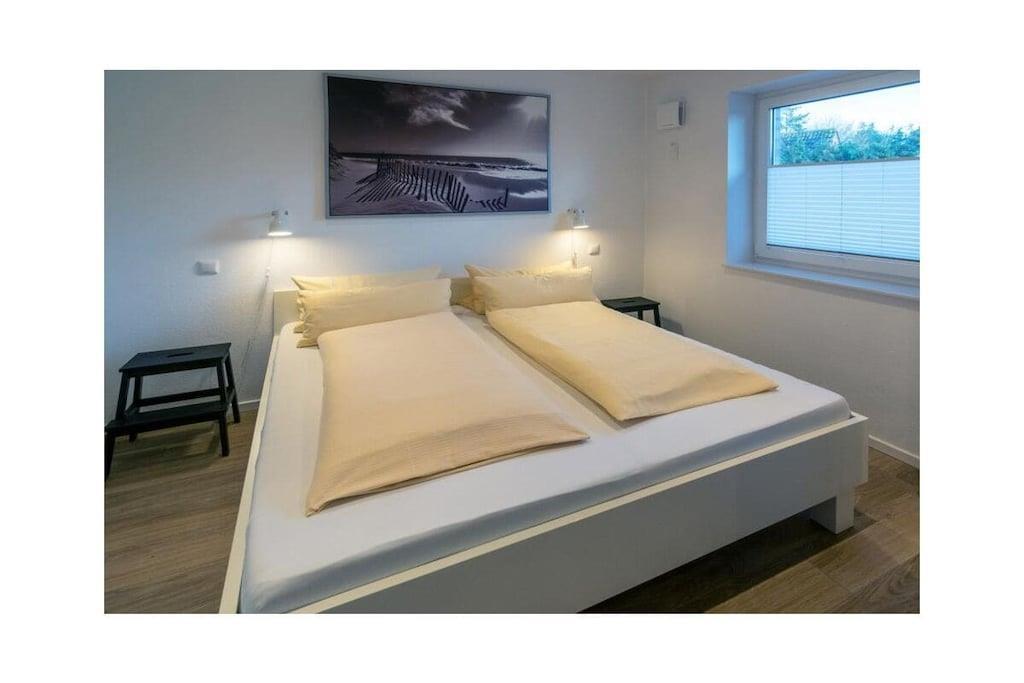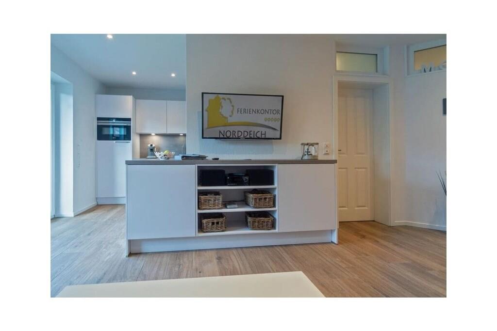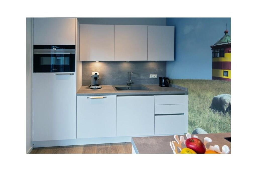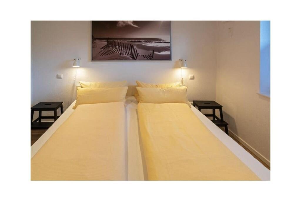 Holiday apartment Deichschaf, Westlinteler Weg 22 b, Norden The holiday apartment Deichschaf is located on the ground floor of a middle terraced house. The apartment has a small fenced garden and there is also a parking space for bicycles. The parking space for your car is in front of the house. This holiday home has been furnished in a modern way and with attention to detail. Shops for everyday needs can be reached on foot in just a few minutes and the beach in Norddeich or the popular Dörper Weg with its numerous shops and varied restaurants are only a few kilometers away. The combined living room with dining area and adjoining kitchen area offers enough space for cooking, eating and, last but not least, for cozy TV evenings. You can relax and enjoy meals together at the dining table. The couch with chaise longue and a small armchair with coffee table make up the living area. From the living room you can look and walk directly onto the terrace. On sunny and warm days you can enjoy the terrace and the adjacent garden in a southeasterly direction. A seating area with table and chairs is available for you outside. The entire garden is fenced and is therefore also suitable for small children. The holiday apartment has two comfortably furnished bedrooms. The right bedroom has a 200 x 200 cm double bed with separate mattresses. A closet offers enough space for your wardrobe and a TV and a bench complete the furnishings. The left bedroom is inside and has a 90 x 200 cm single bed, which can be extended to create another 90 x 200 cm bed. The kitchen is modern and functional. The kitchenette has been equipped with everything you need for cooking. This makes cooking fun even on vacation. This includes an oven with a combined microwave, a stove, a coffee machine, a coffee pad machine, a refrigerator, a dishwasher, a microwave and a toaster.