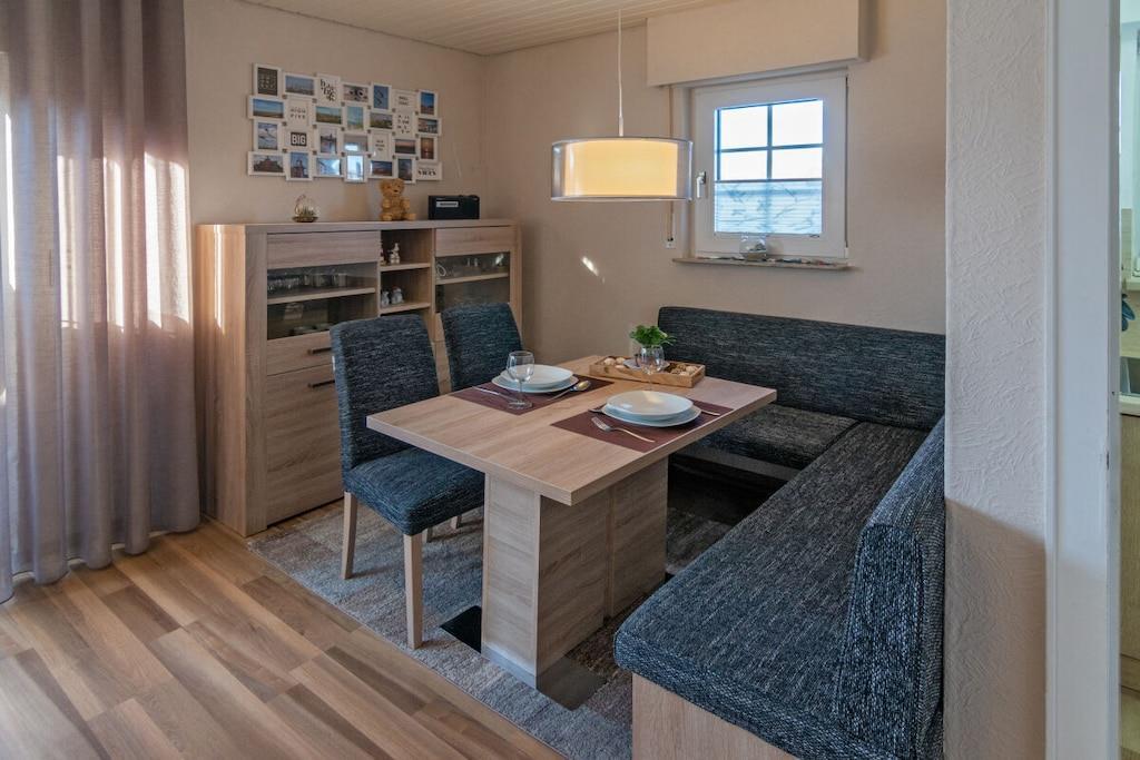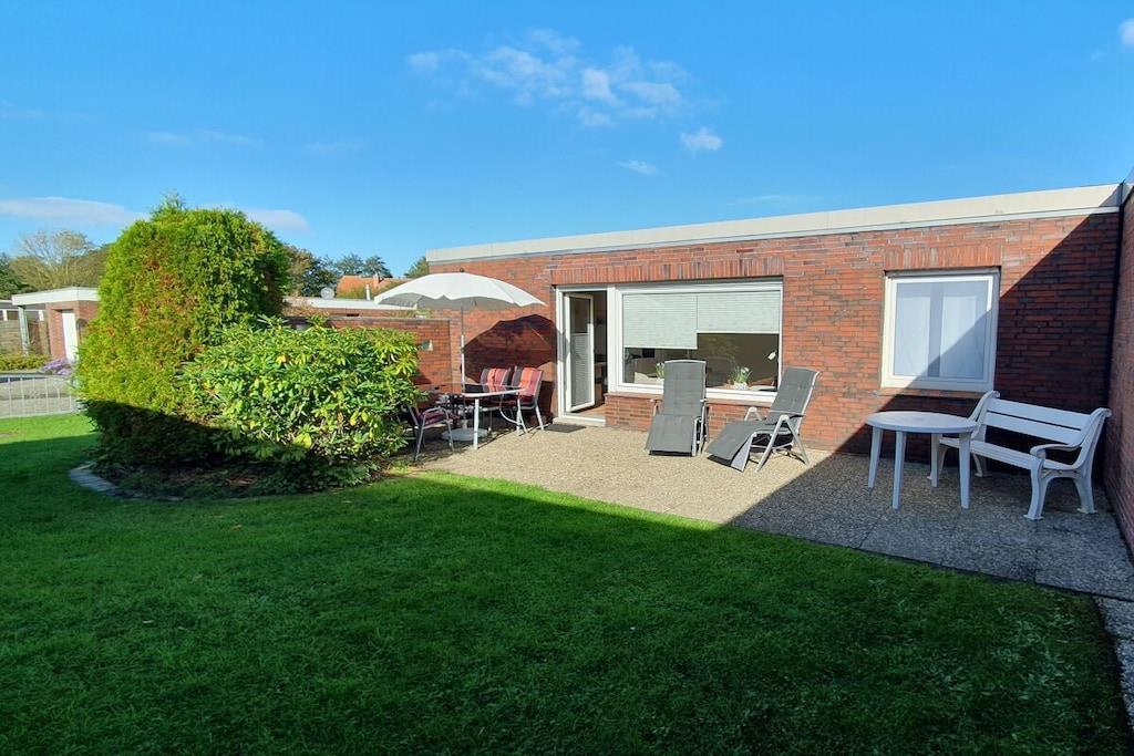 The spacious and bright holiday bungalow features a generous living/dining area with access to the terrace. The separate kitchen is fully equipped. Furthermore, the bungalow has two bedrooms (one with a double bed measuring 180x200cm, two single beds measuring 90x200cm) and a shower room. In sunny weather, nothing stands in the way of a delicious barbecue evening in the sheltered garden area of the house. The terrace is sheltered from the wind and not overlooked. Here you can spend cozy evenings and unwind at the end of the day. A parking space and a place to store your bicycles are also available.