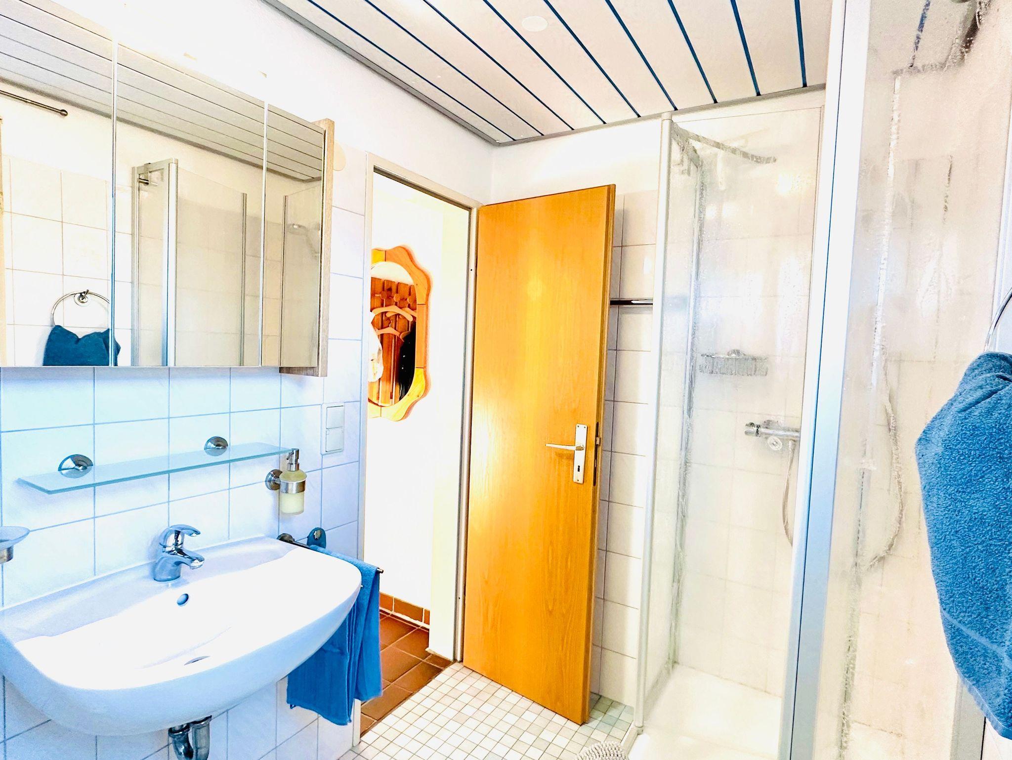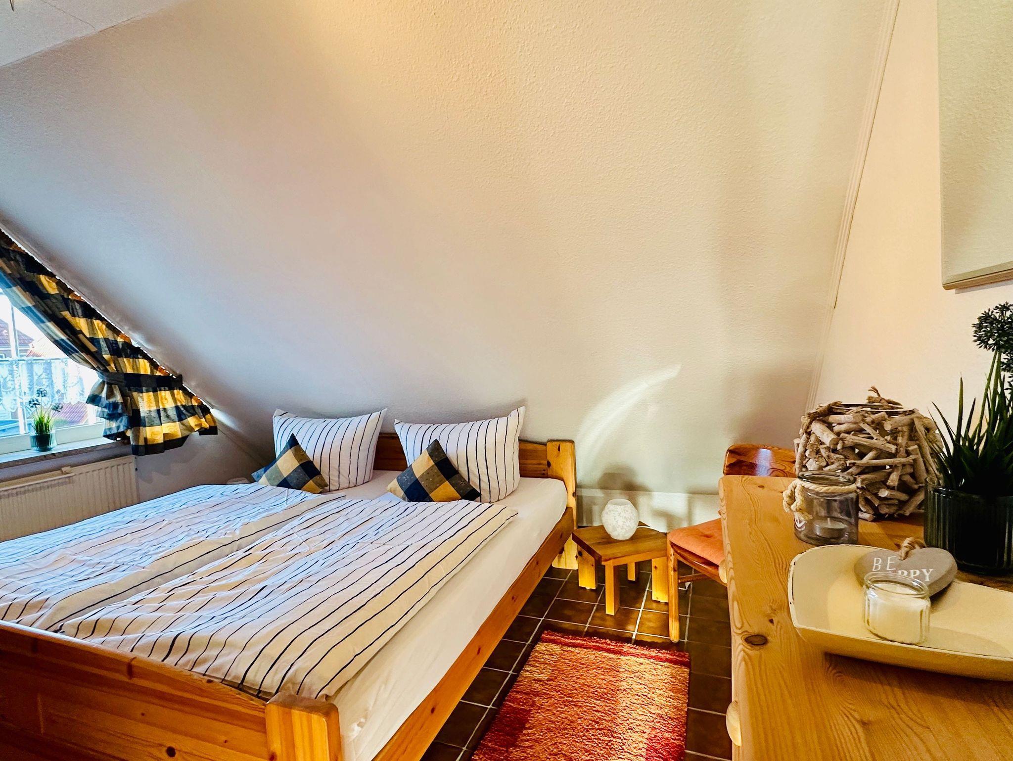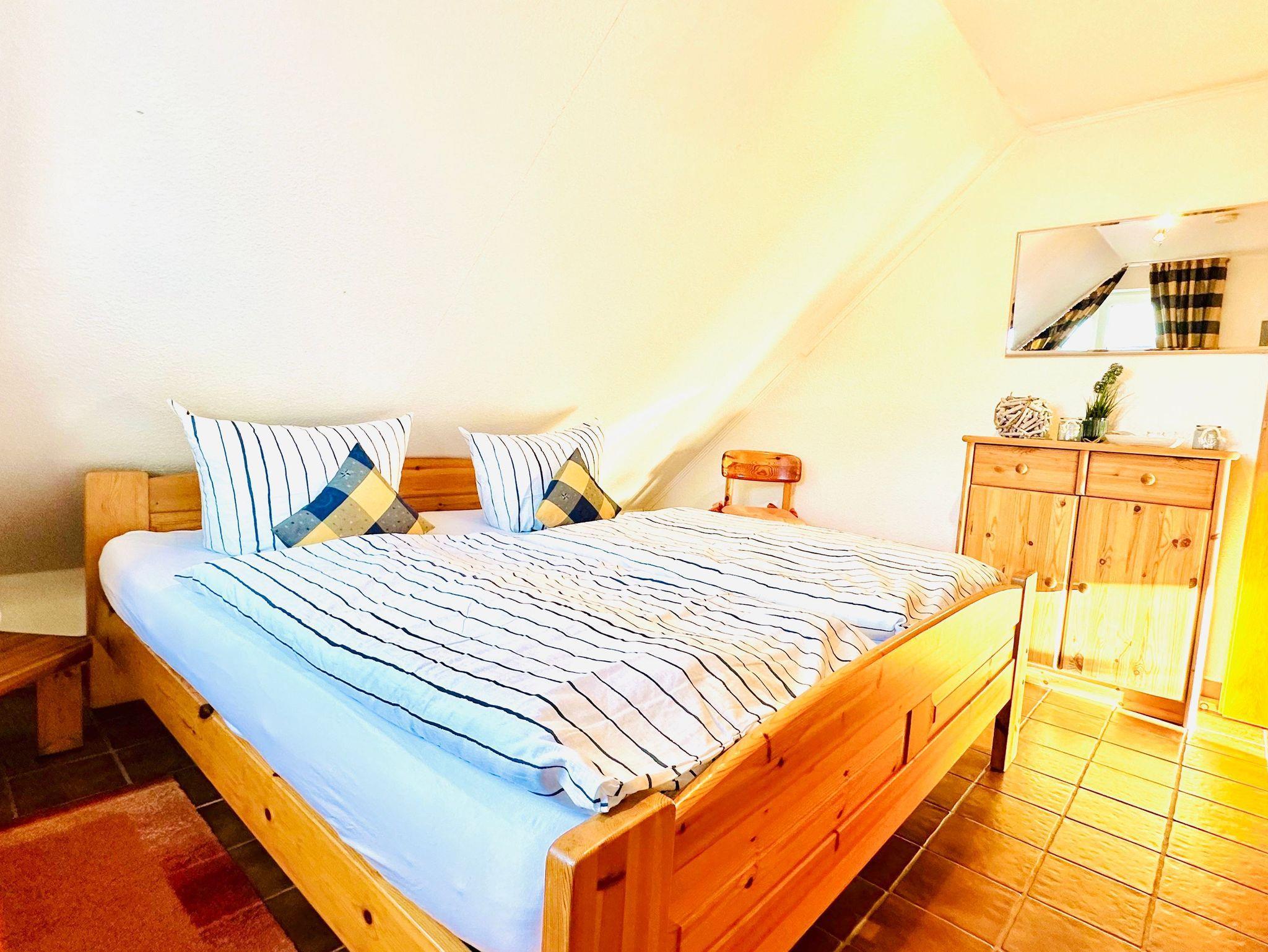 Aufgeteilt ist die Ferienwohnung in ein Schlafzimmer mit Doppelbett und großem Schrank. Das helle Badezimmer ist modern ausgestattet mit einer Dusche, Handwaschbecken und Toilette.