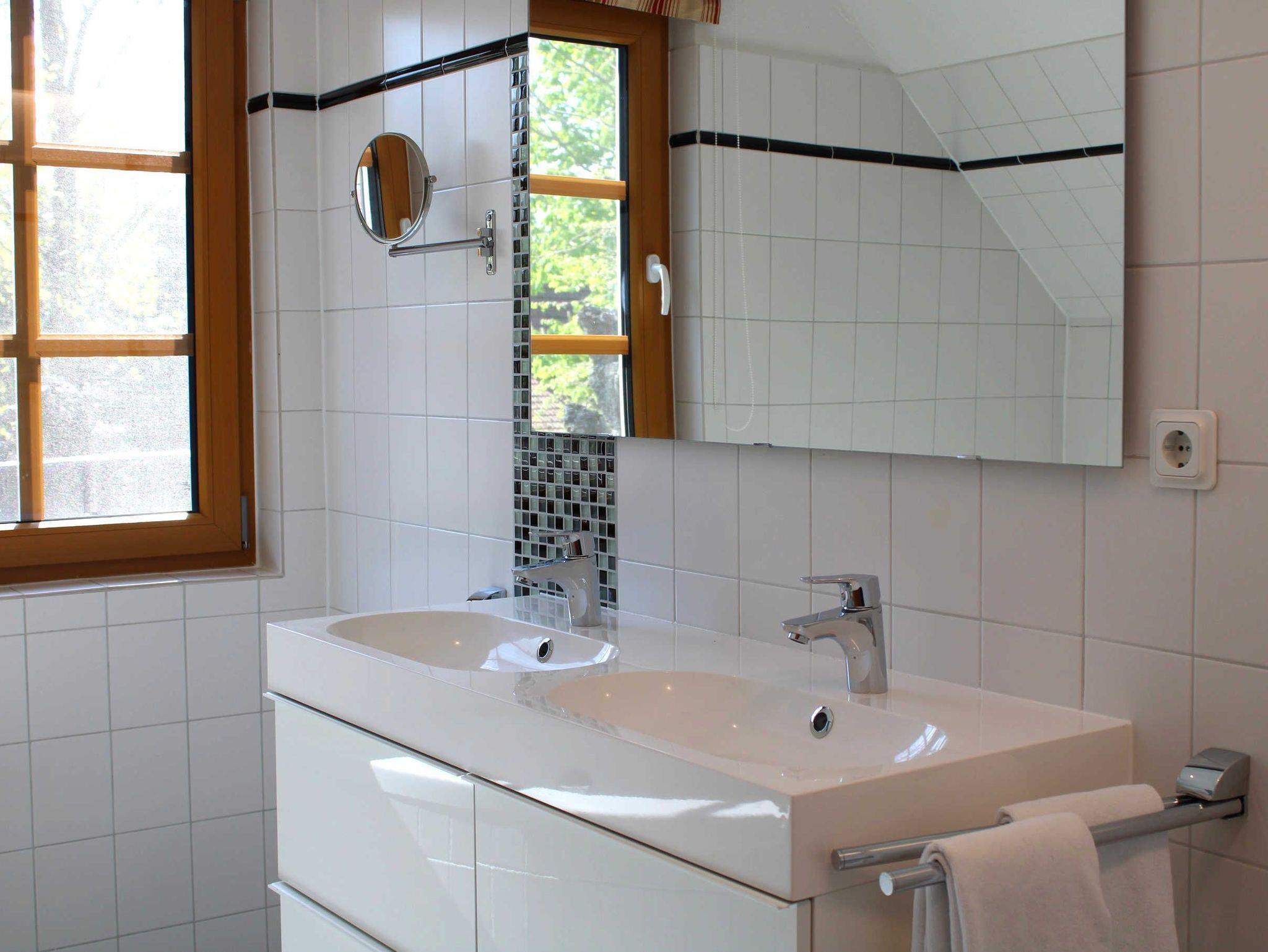 Die Badezimmer mit Dusche und WC, Fön, Kosmetikspiegel und Handtuchwärmer.