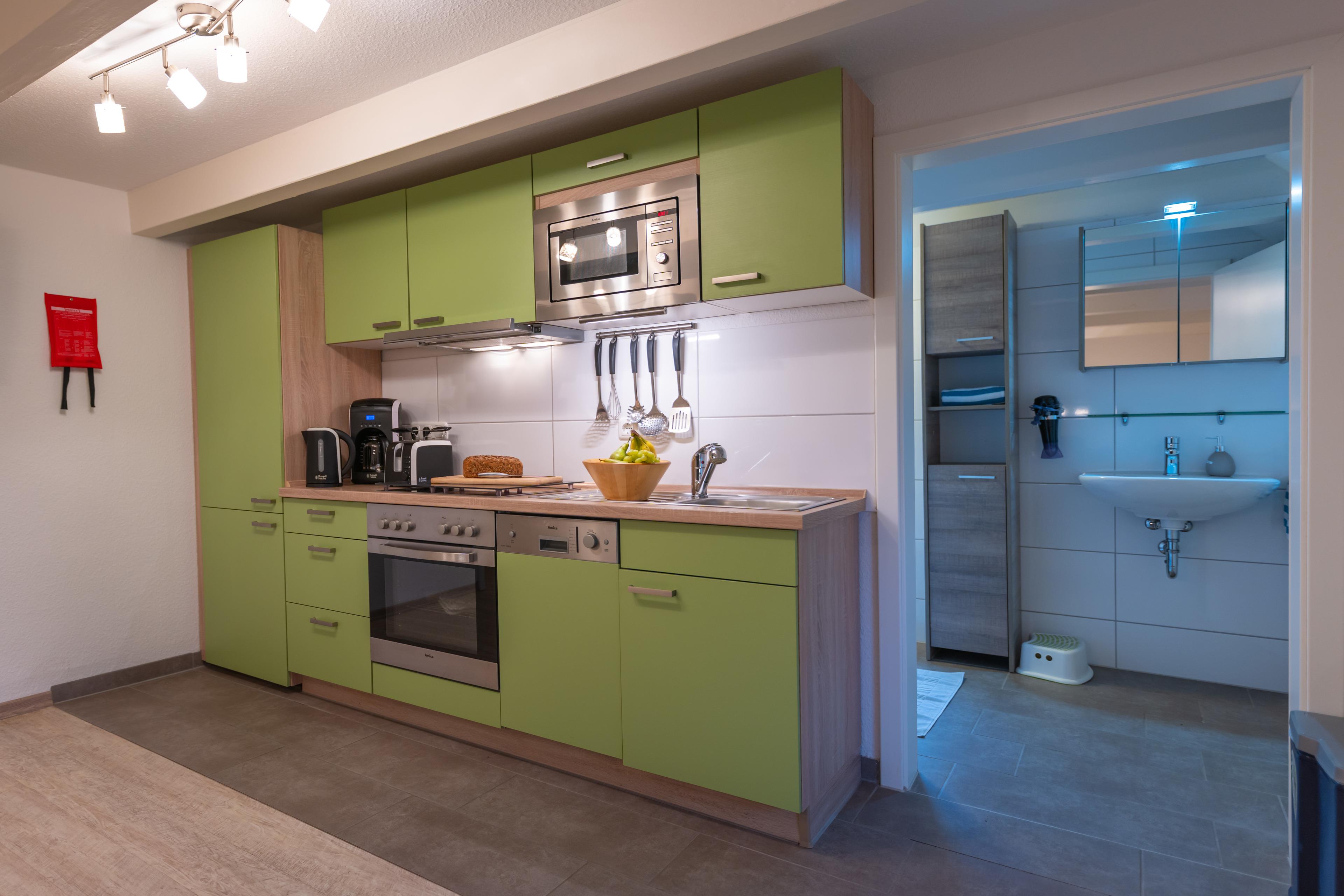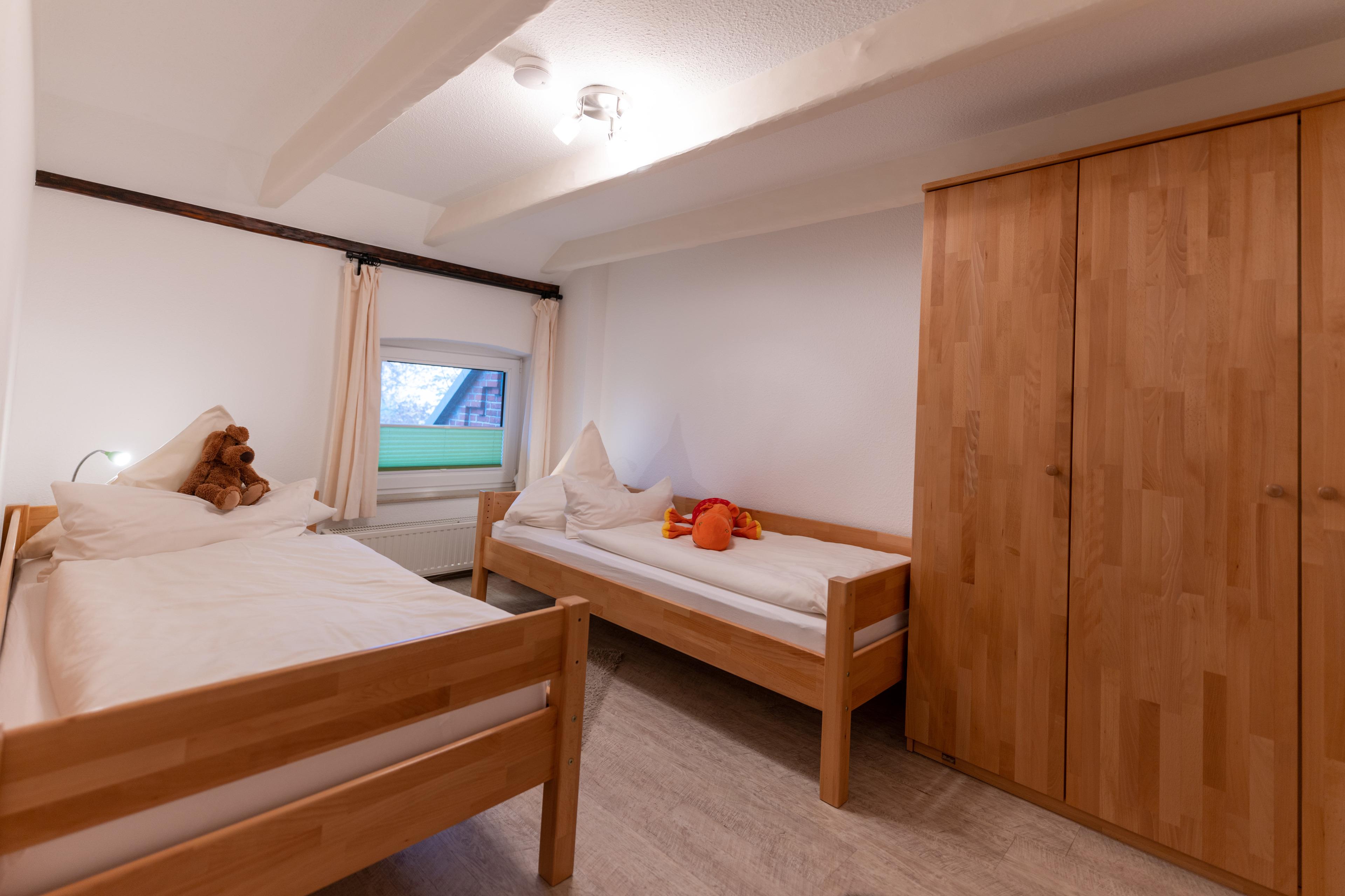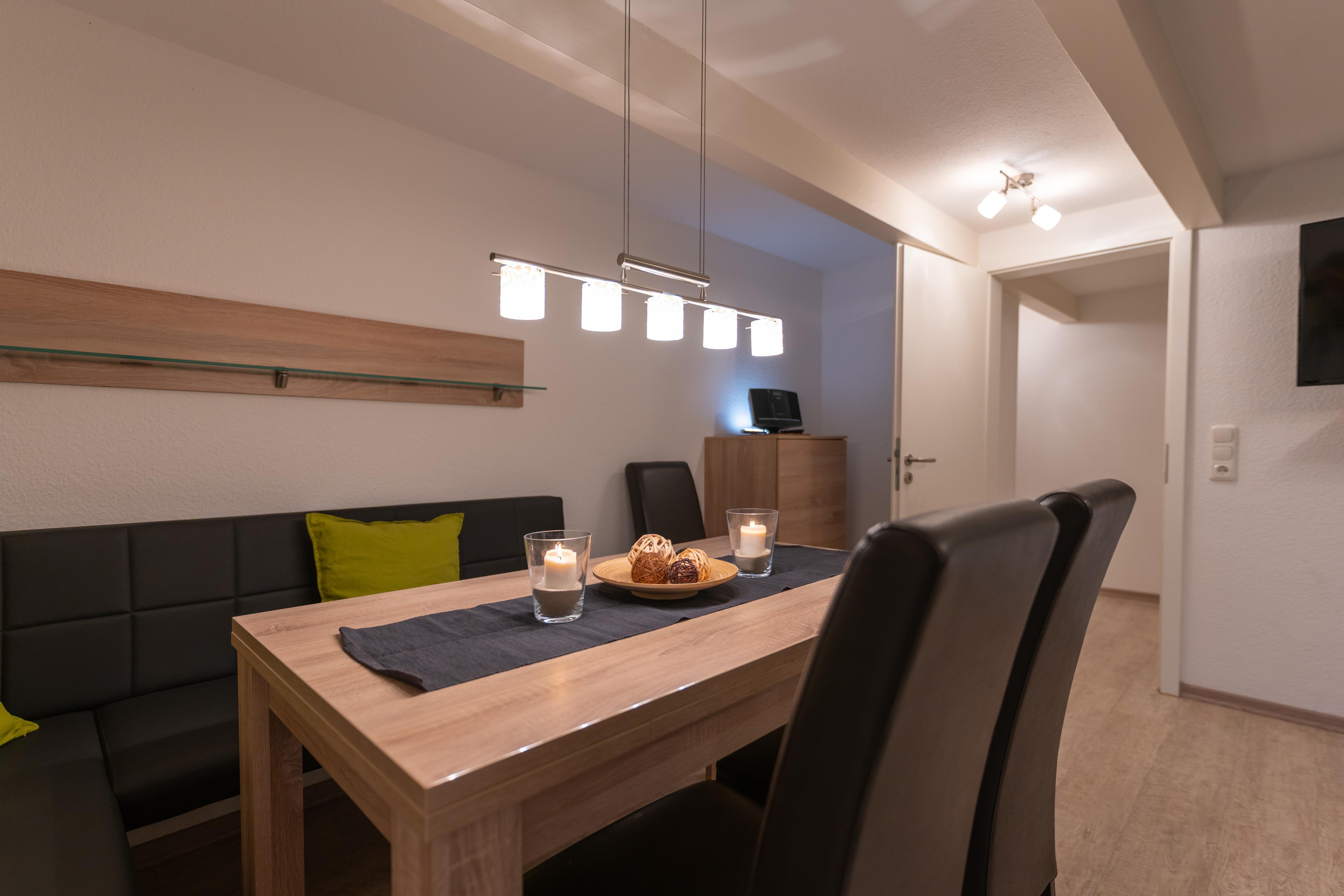 Unsere Wohnung 3 in der ersten Etage unseres Wohnhauses verfügt über zwei getrennte Schlafzimmer - eins mit Doppelbett; eines mit zwei Einzelbetten. Hier haben wir uns dazu entschieden, eine klassische Wohnküche einzurichten, die über eine gemütliche Sitzecke mit Eckbank verfügt und somit das gemütliche familiäre Zusammensein sowohl beim Kochen und Essen, als auch beim Fernsehen ermöglicht. Das vollausgestattete, moderne Badezimmer rundet diese Wohnung ab.