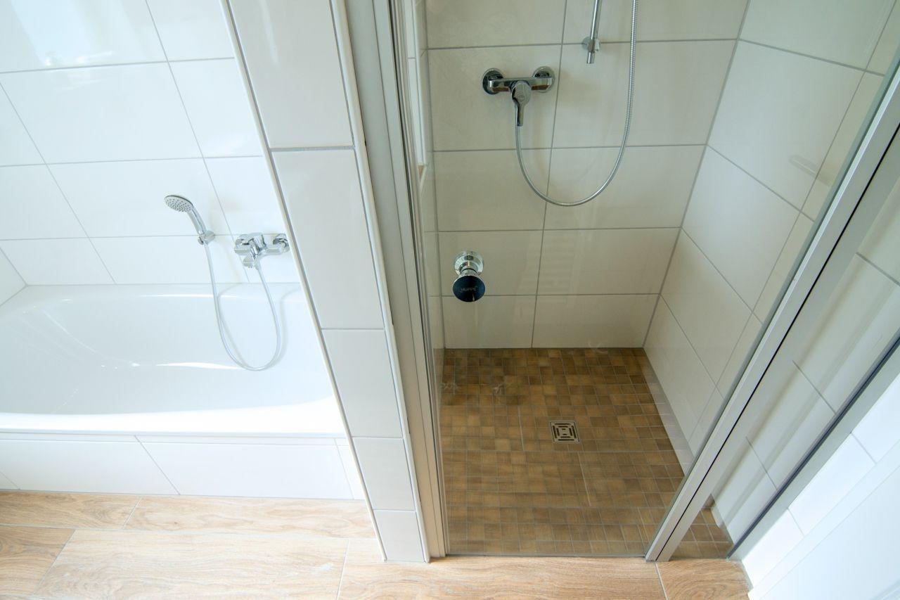 Das zweite Badezimmer ist das Hauptbad der Wohnung. Es handelt sich um ein Vollbad mit Badewanne und Dusche. Zusätzlich erwartet Sie hier eine Waschkombination mit großem, beleuchtetem Spiegel. Ein Haartrockner gehört zu den weiteren Vorzügen des Bades.