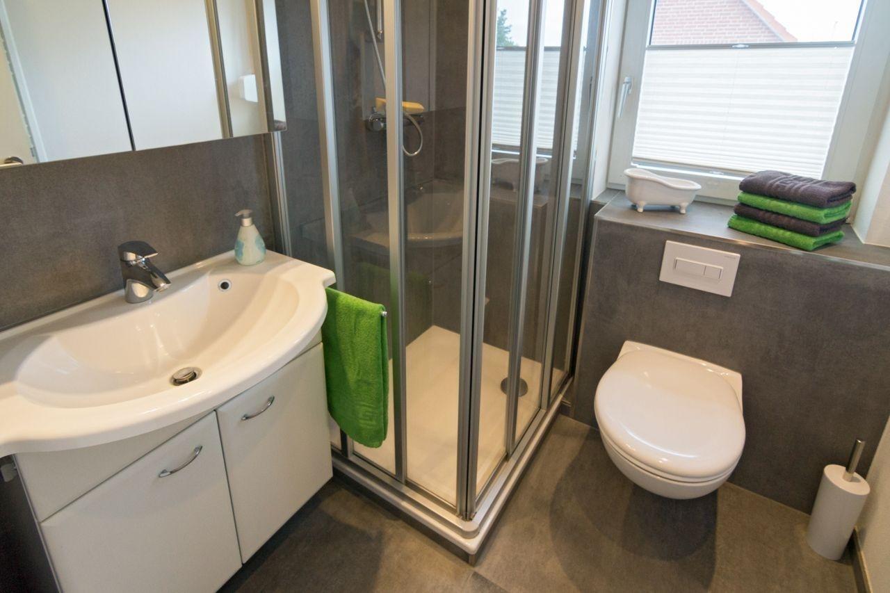 Das Badezimmer der Wohnung Norddeich befindet sich ebenso wie die beiden Schlafräume im Obergeschoss. Für besonderen Komfort sorgt hier die ebenerdige Glasdusche und der handtuchtrockner, welcher Ihre Duschtücher rasch auf Wohlfühltemperatur bringt.