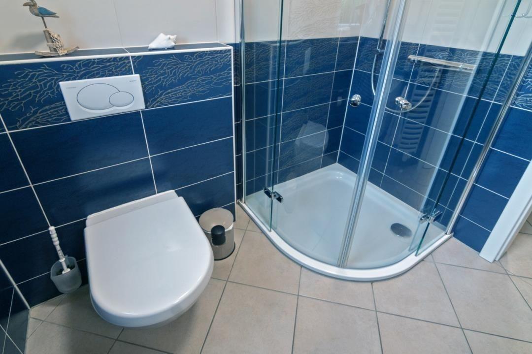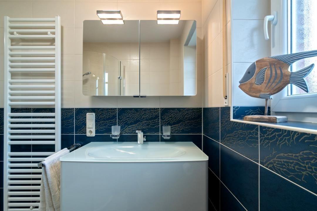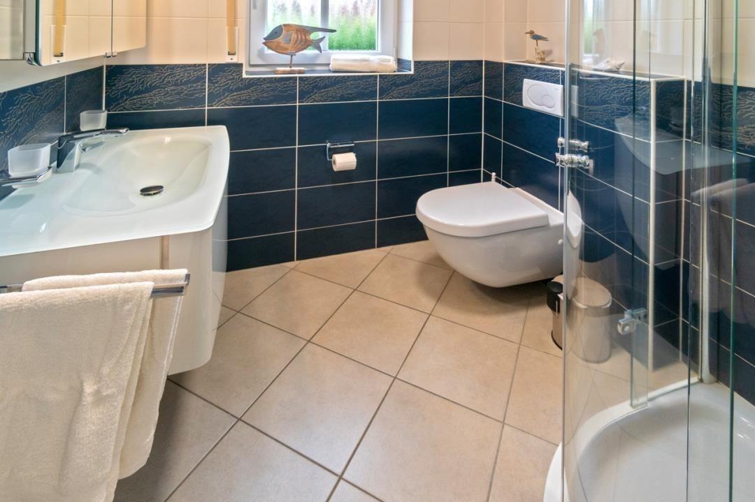 Die Ausstattung des Bades ist das I-Tüpfelchen im "Nörder Refugium". Neben einem großen Designerwaschbecken gibt es einen Spiegelschrank, eine bodentiefe Dusche mit Glasabtrennung und ein WC.