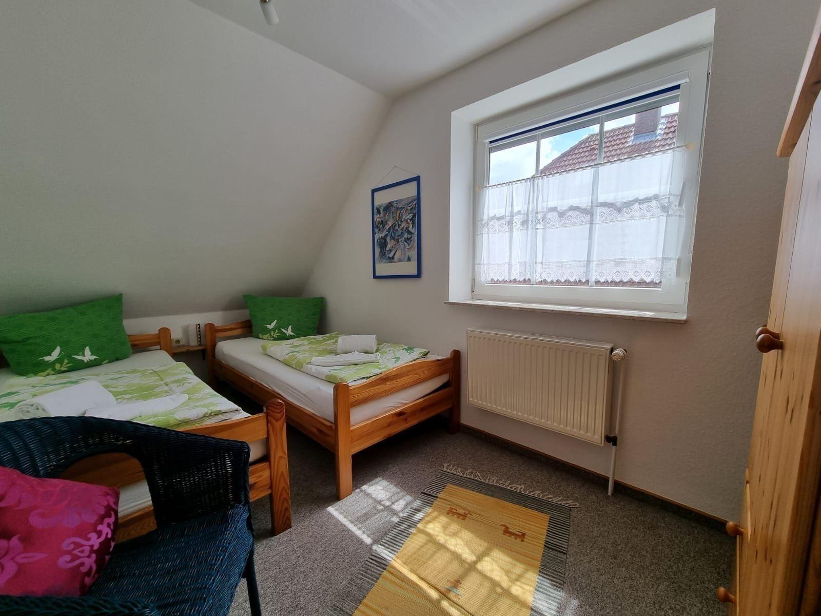 Zwei Schlafzimmer bieten optimale Schlafmöglichkeiten: ein Schlafzimmer mit Doppelbett und Kinderbett sowie ein weiteres mit zwei Einzelbetten. Ein Wohnschlafzimmer mit Schlafcouch ergänzt die Unterkunft. Das Badezimmer im Obergeschoss ist mit Badewanne und Dusche ausgestattet, zudem steht ein Gäste-WC im Erdgeschoss zur Verfügung. Weitere Annehmlichkeiten wie WLAN, Parkplatz und ein Starterset sorgen für zusätzlichen Komfort. Die Wohnung ist allergikergeeignet und ausgestattet mit verschiedenen Haushaltsgeräten.