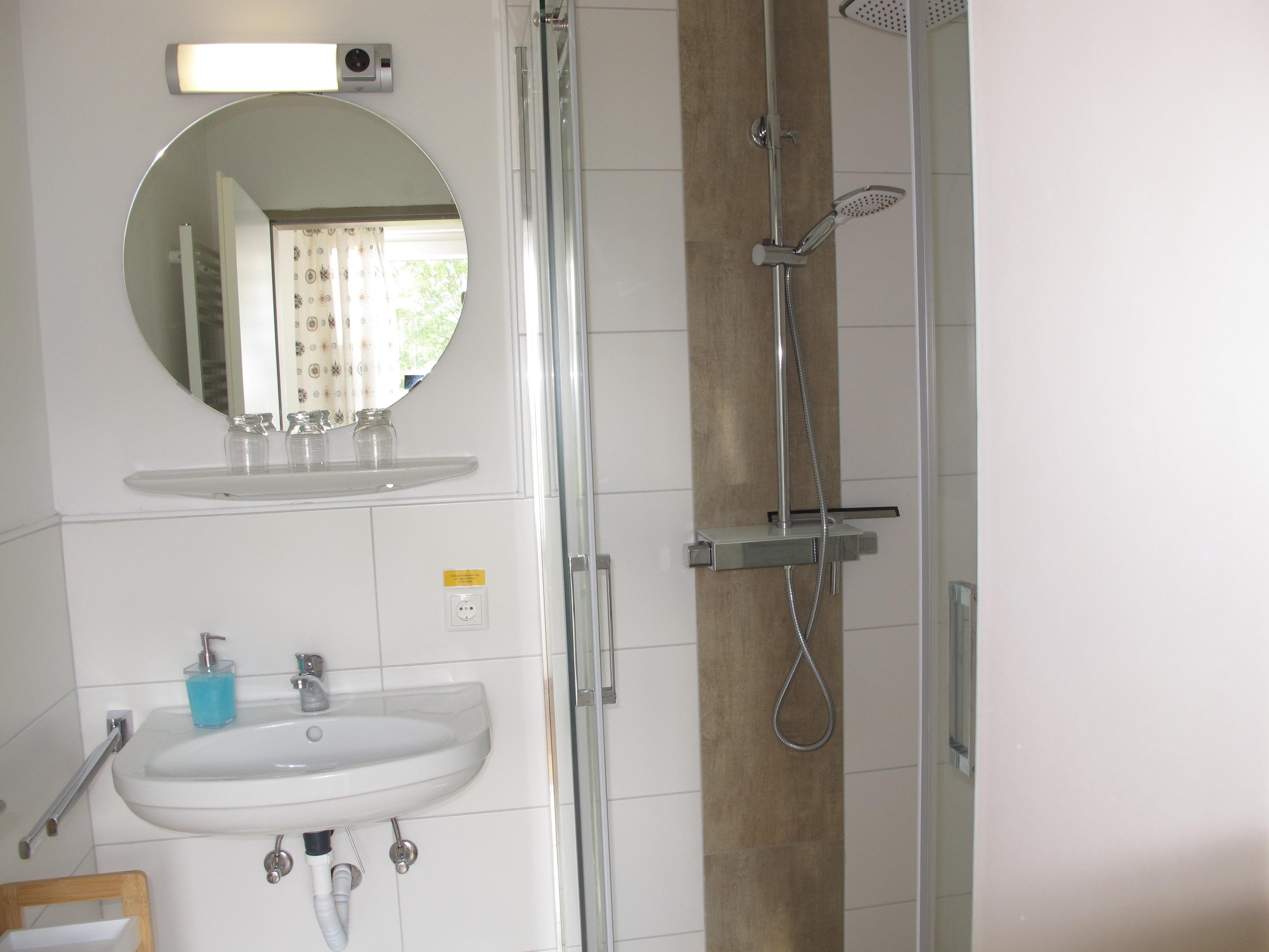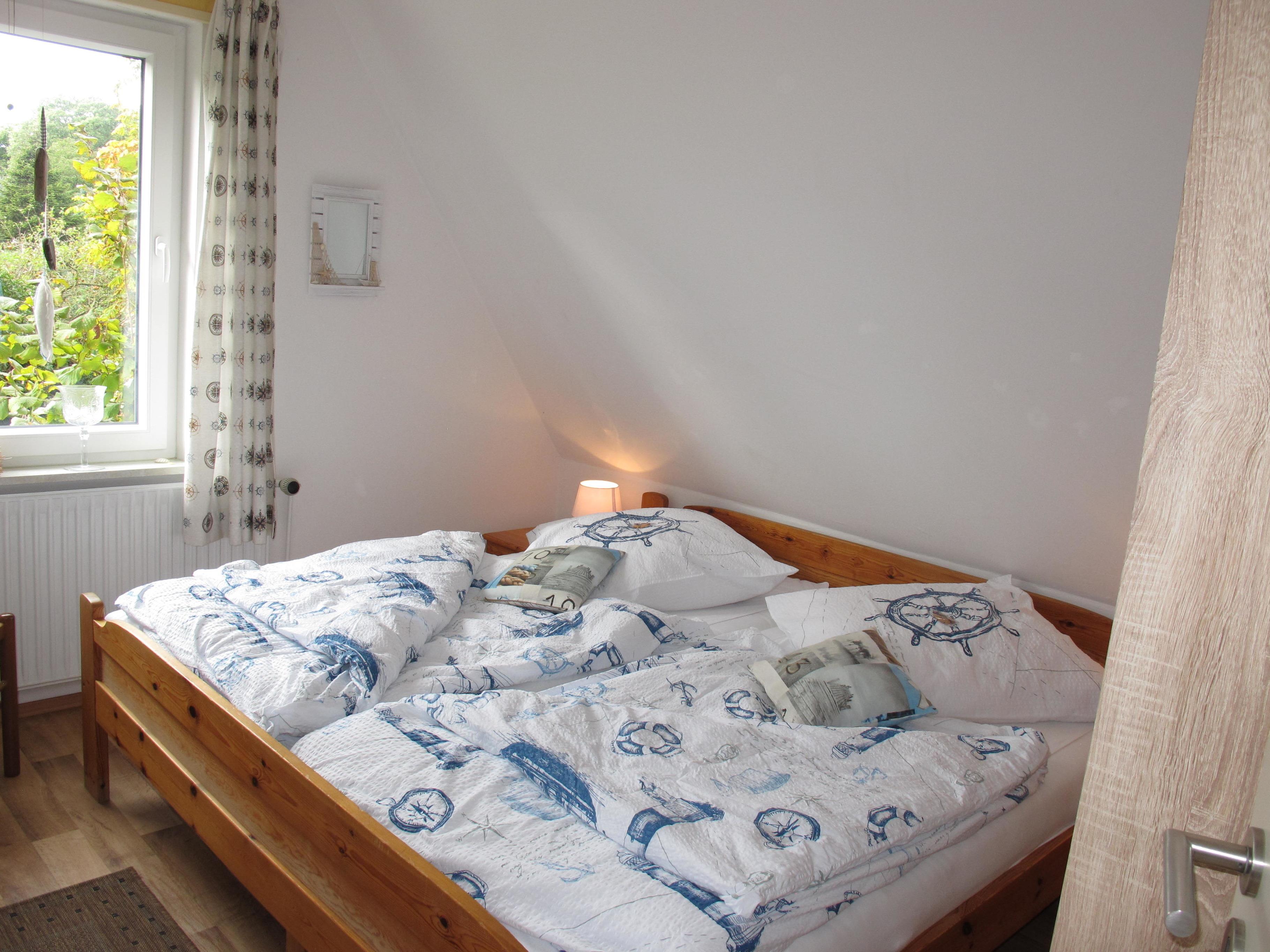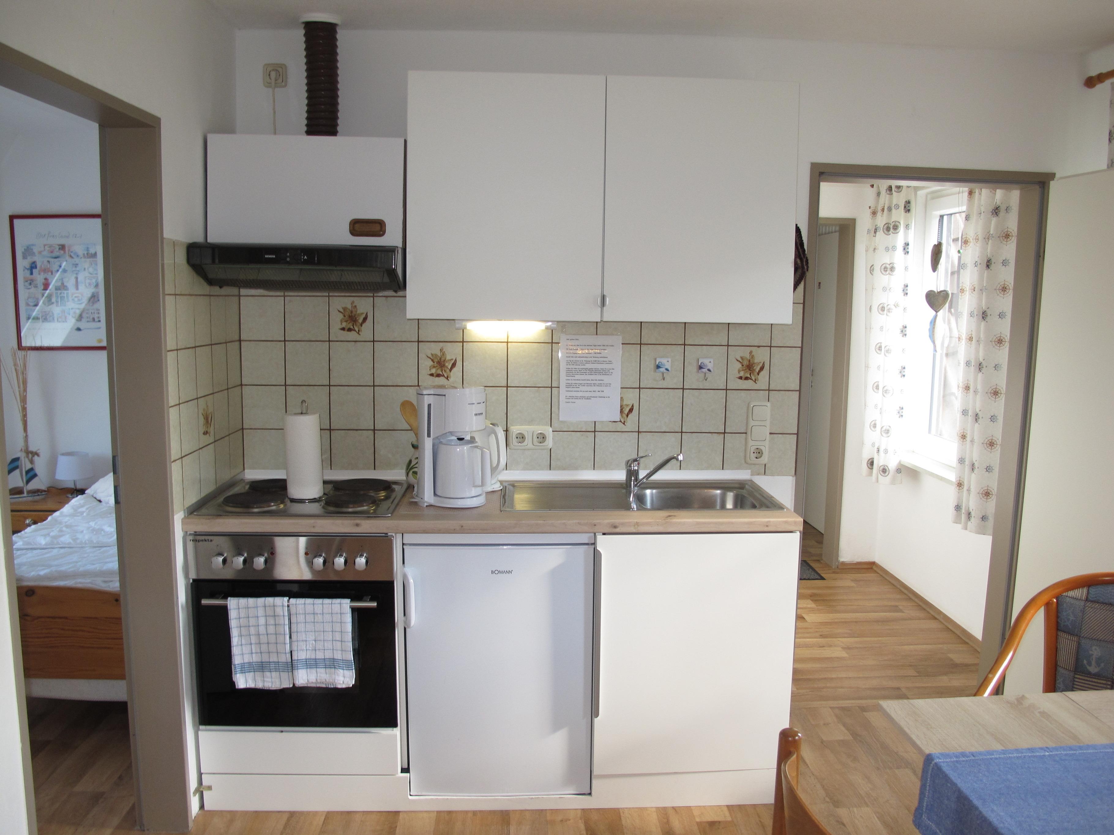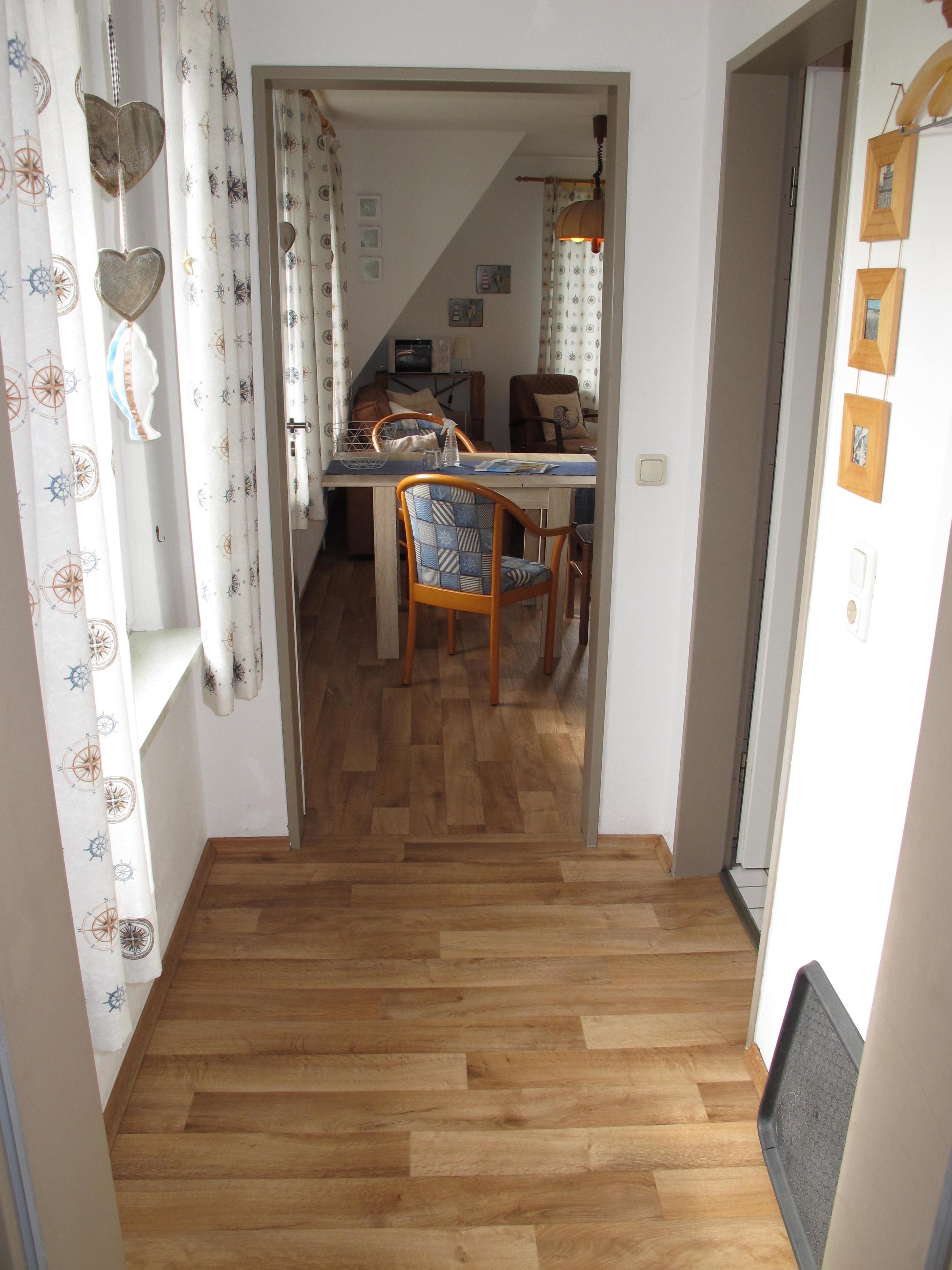 Zugang übers Treppenhaus in die 1. Etage. Separater Zugang in Flur mit Garderobe. Wohnraum mit Sitzgruppe, Eßplatz und einer offenen Küche mit Einbauherd (4 Platten, Backofen), Mikrowelle, Toaster, Kaffeemaschine, Wasserkocher und Kühlschrank. Doppelzimmer. Zweibettzimmer. In 2024 umfassend renovierte Dusche/WC. NICHTRAUCHEROBJEKT