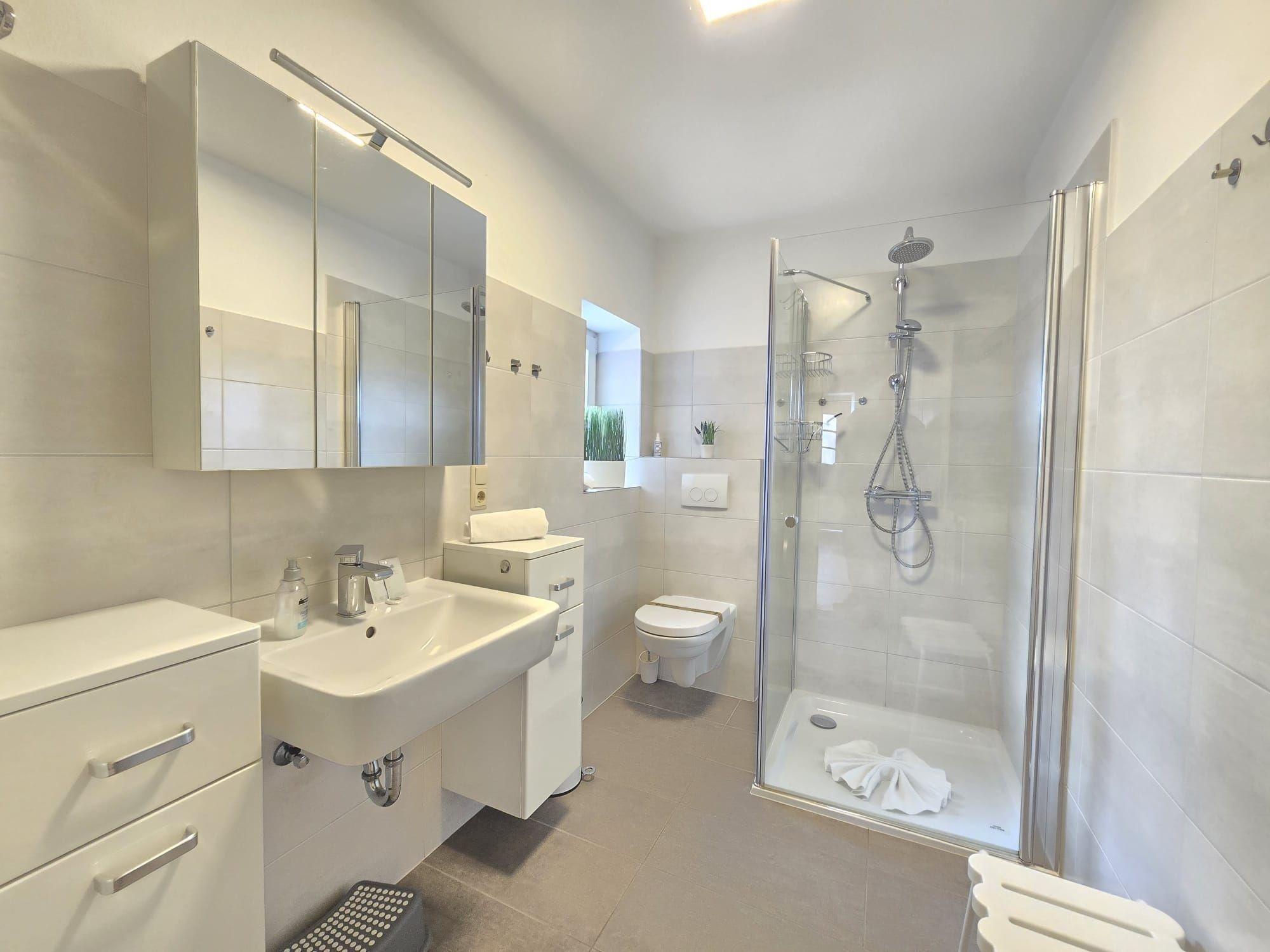 Das Duschbad, ausgestattet mit einem Haartrockner und einem Fenster, sorgt für zusätzlichen Komfort. Zum Entspannen stehen ein Sofa und ein Sessel im Wohnbereich zur Verfügung, während der Esstisch zum gemeinsamen Essen einlädt. WLAN mit 25 MBit/s, ein Fernseher und eine HiFi-Anlage garantieren Unterhaltung. Praktische Annehmlichkeiten wie Waschmaschine, Wäschetrockner und Reinigungsmittel sind ebenfalls vorhanden. Ein Parkplatz und viele Brettspiele runden das Angebot ab. Hier findet jeder Gast eine wohlverdiente Auszeit.