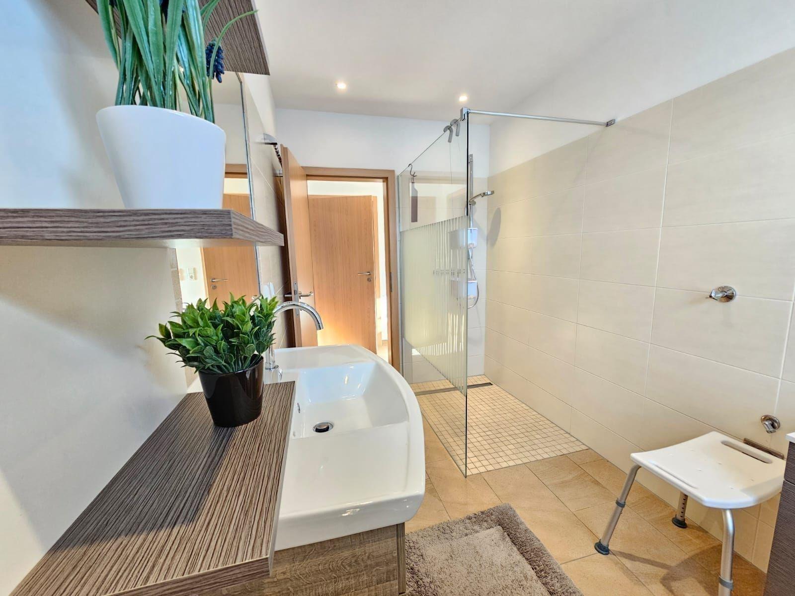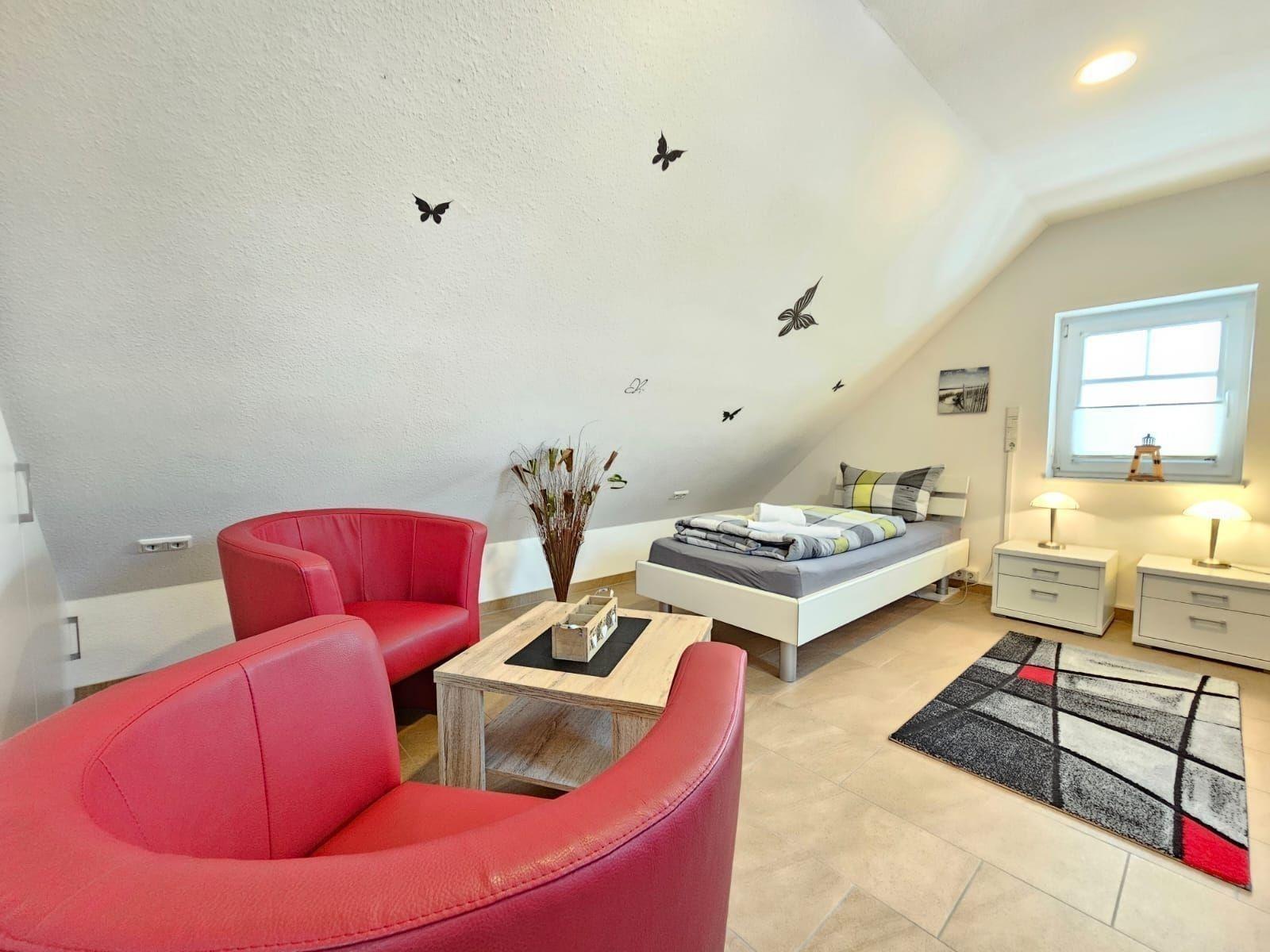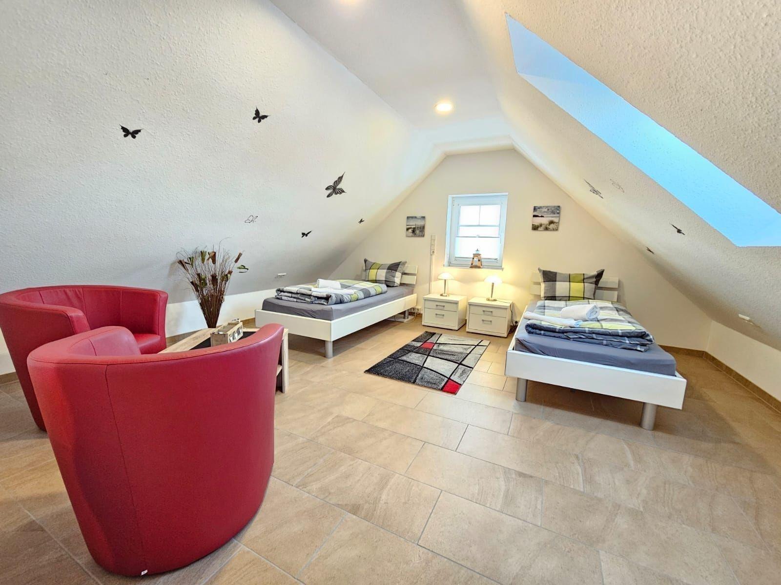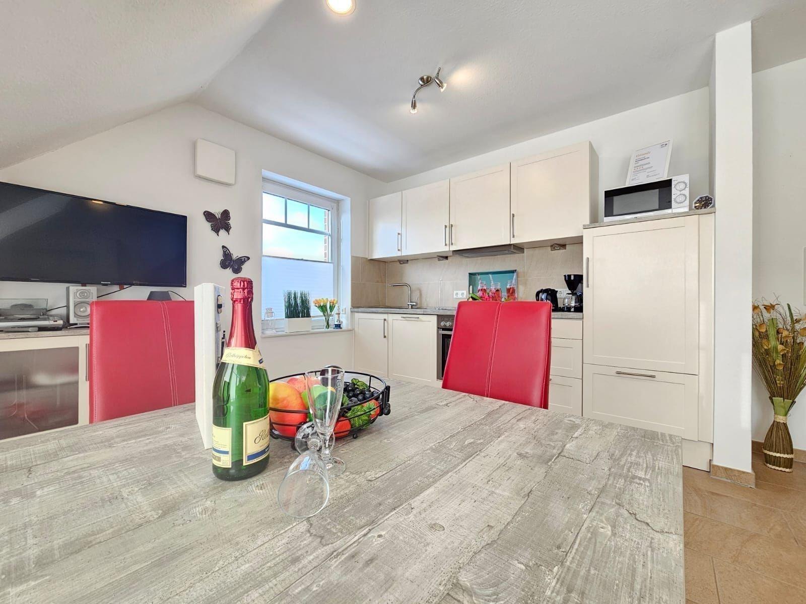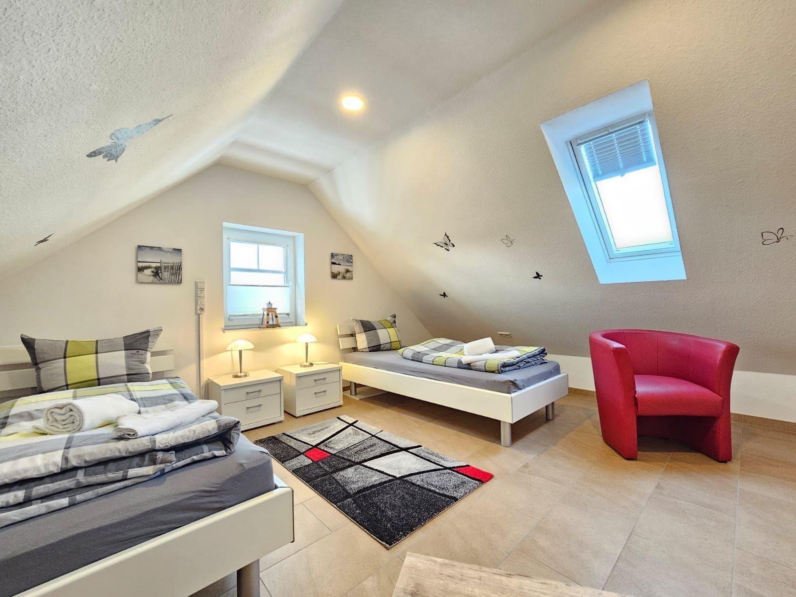 Die Ferienwohnung bietet einen einladenden Rückzugsort, ideal für Familien oder Gruppen. Mit zwei Schlafzimmern, ausgestattet mit einem Doppelbett und zwei Einzelbetten, findet jeder den perfekten Schlafplatz. Die offene Küche ist modern gestaltet und verfügt über einen Elektro-/Gasherd, Geschirrspüler, Backofen, Mikrowelle, Kühlschrank sowie eine Kaffeemaschine und einen Toaster. Für das Wohl der Gäste sorgt die allergikerfreundliche Ausstattung und ein Badezimmer mit Fenster, bodengleicher Dusche sowie einem umfangreichen Starterset. Die helle, freundliche Wohnlandschaft mit Sofa, Sessel und Esstisch lädt zum Verweilen ein. WLAN steht kostenfrei zur Verfügung, und ein Parkplatz ist direkt vor der Tür. Zusätzliche Annehmlichkeiten wie ein Haartrockner, TV, Bügeleisen und Reinigungsmittel runden das Angebot ab. Diese Ferienwohnung ist ein perfekter Ort für entspannte Urlaubstage.