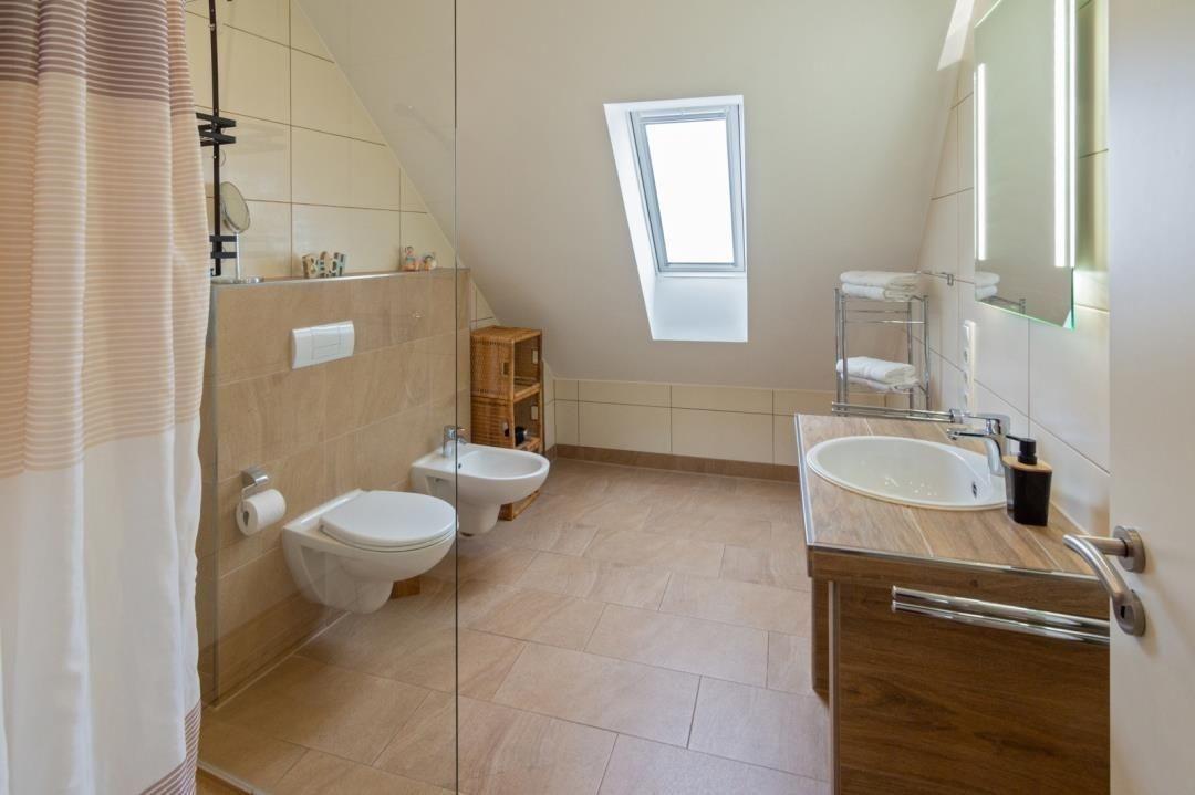 Badezimmer: das moderne Badezimmer bietet eine ebenerdige Dusche mit Glastüren, WC, Bidet und gemauertem Waschtisch – alles farblich abgestimmt.