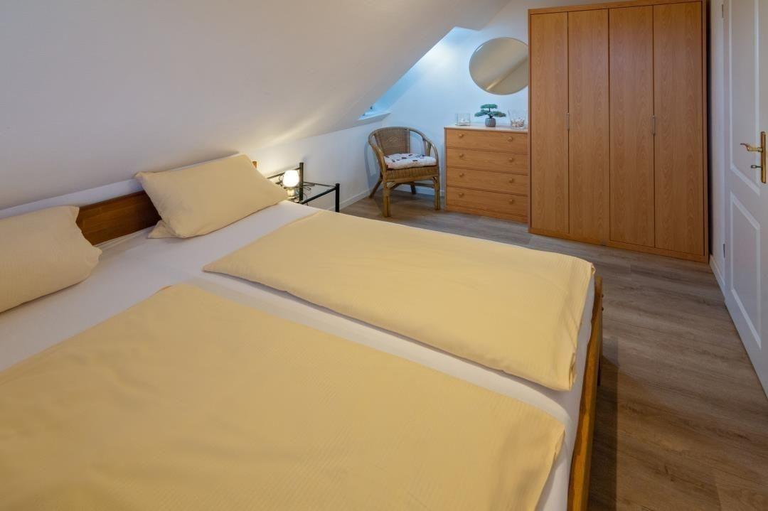 Im Schlafzimmer erwartet dich ein Doppelbett mit hochwertigen, bequemen Matratzen sowie zwei Nachttischen, eine Kommode und ein geräumiger Kleiderschrank. Verdunklungsmöglichkeiten sorgen für ungestörte Nächte. Das Badezimmer ist mit einer Dusche, einem WC, einem Haartrockner, einem Waschbecken, einem Kosmetikspiegel, einem Spiegel, einem Handtuchheizkörper und einem Fenster ausgestattet. Warmes Wasser ist selbstverständlich vorhanden.