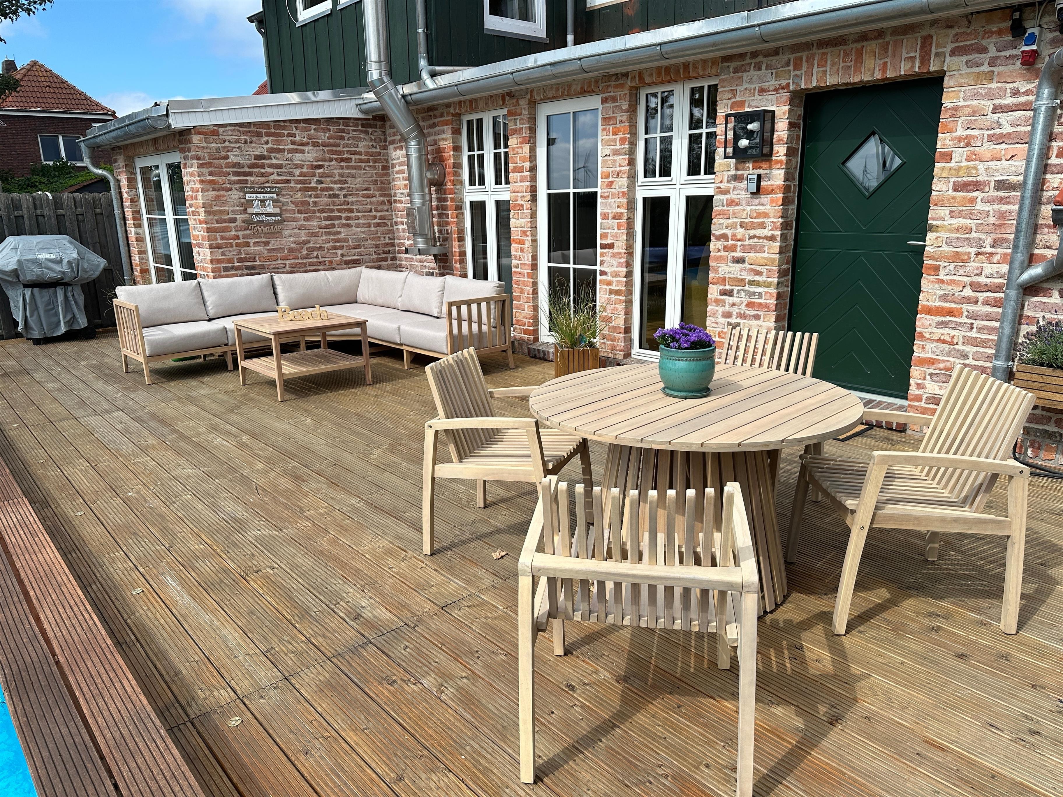 Auf der herrlich großen Holzterrasse haben Sie den ganzen Tag über Sonne.