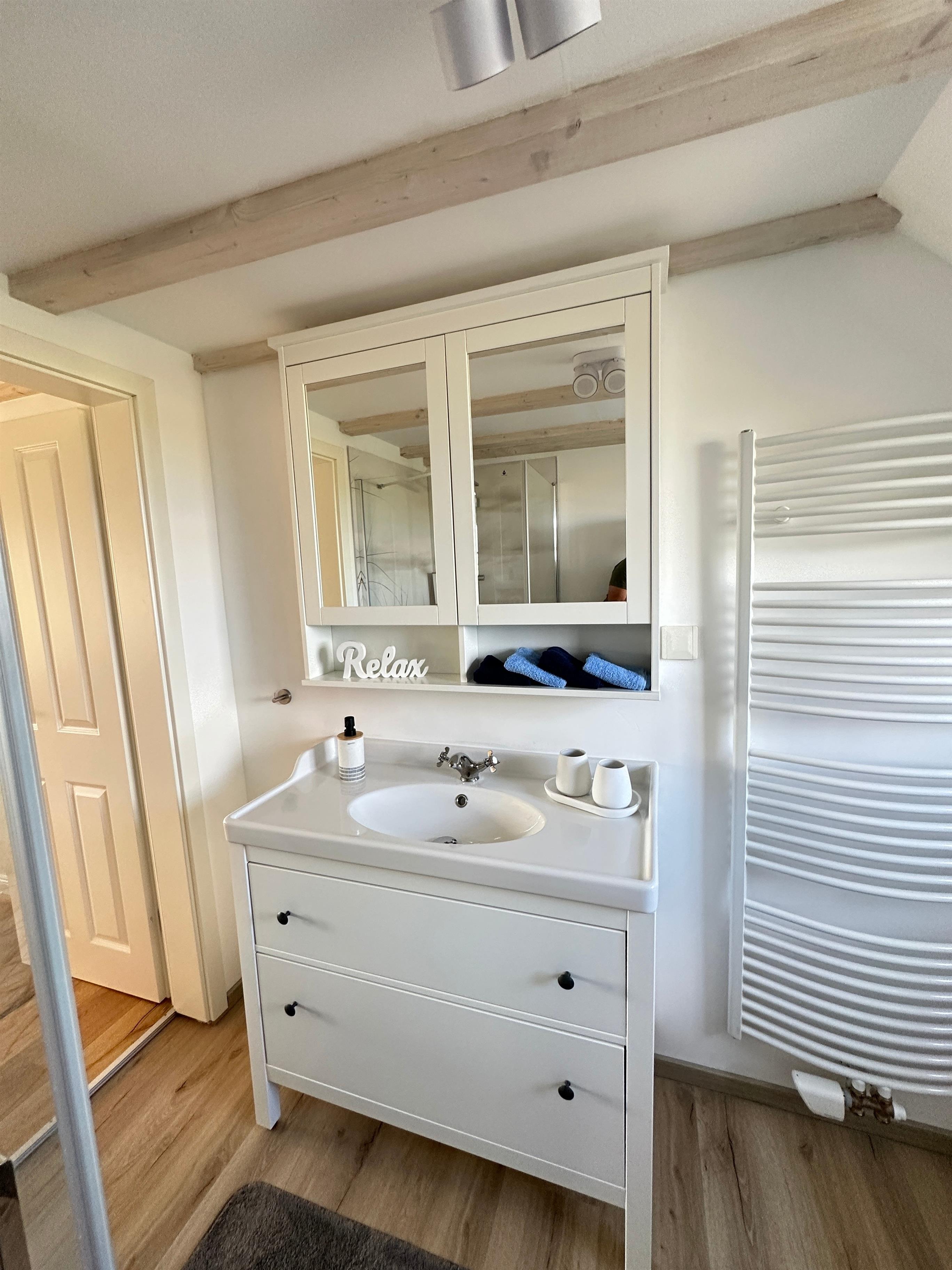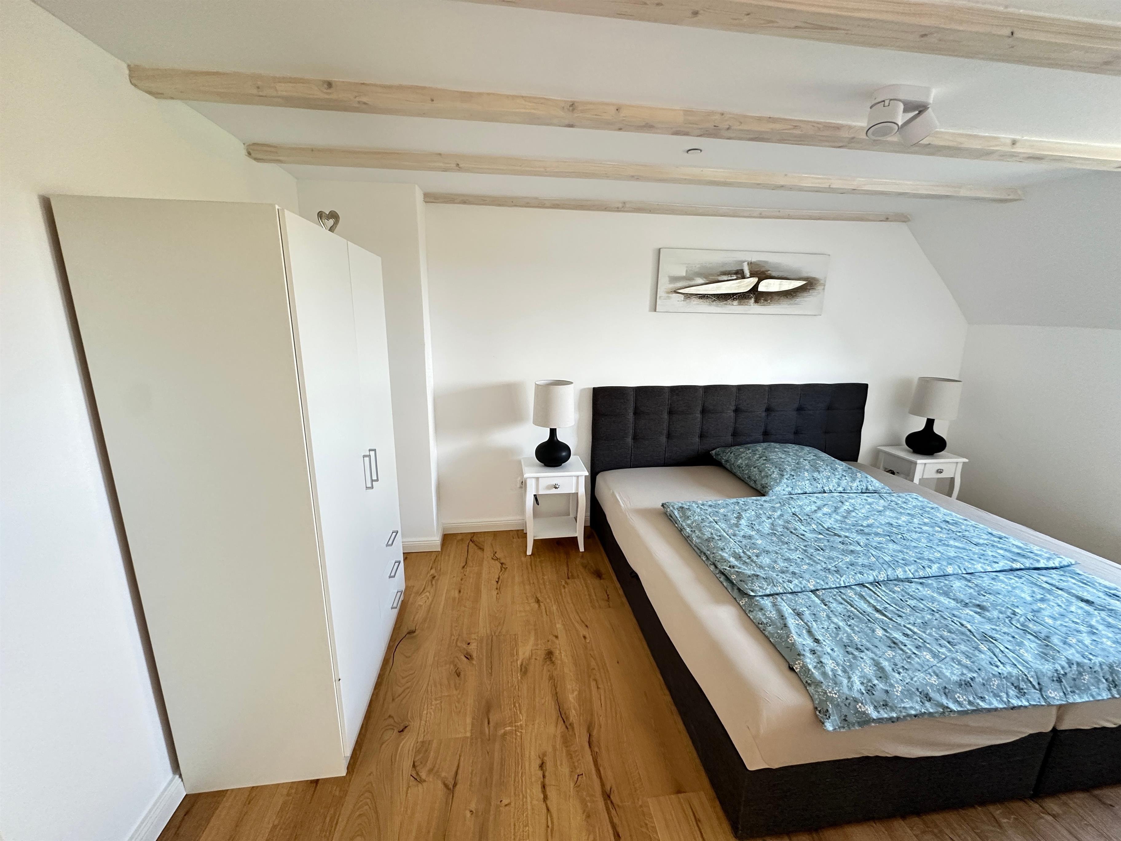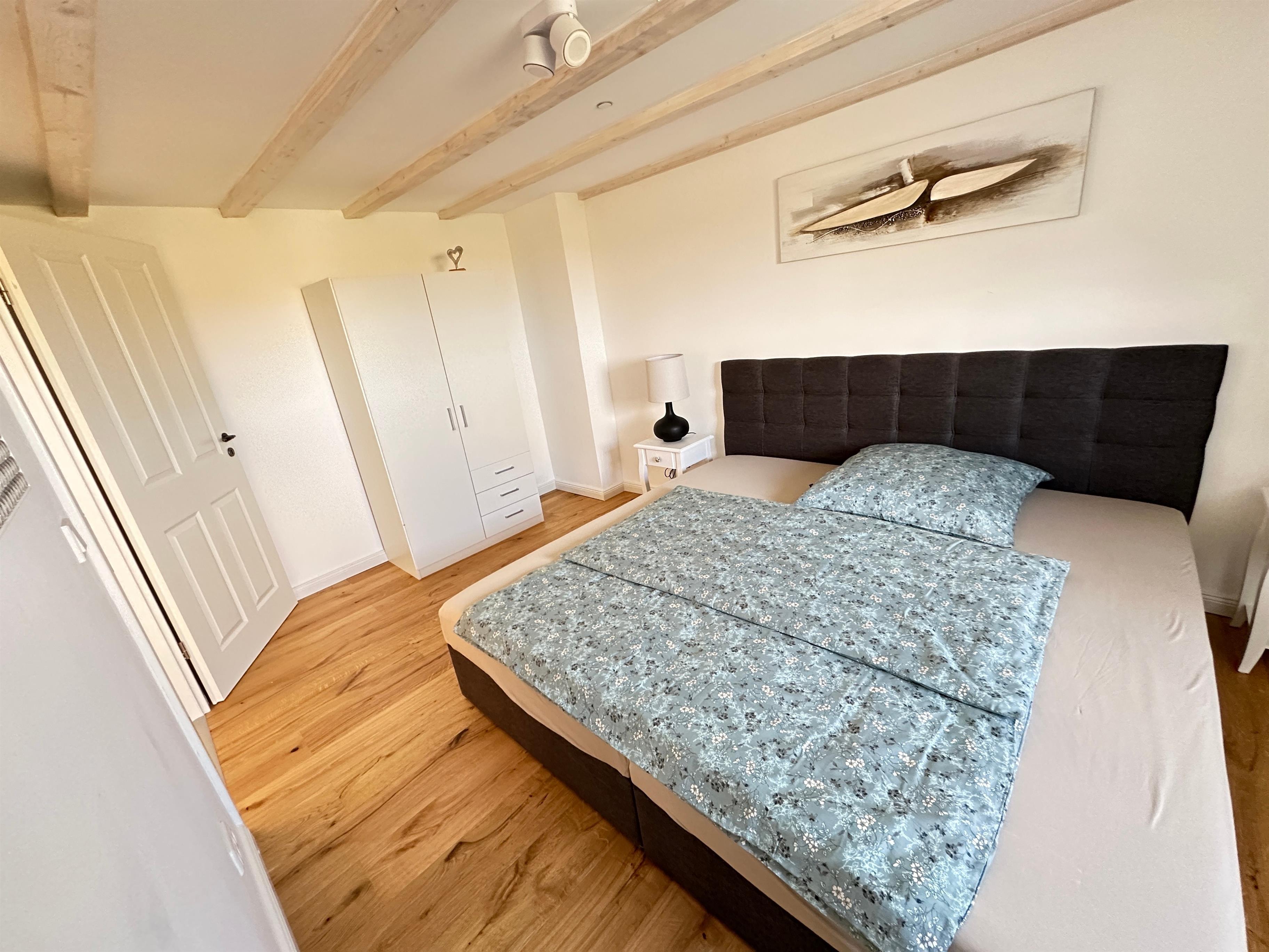 Die beiden Schlafzimmer sind zum einen mit zwei Einzelbetten und einem Regal ausgestattet, das andere mit einem Doppelbett 180x200 und einem Kleiderschrank.