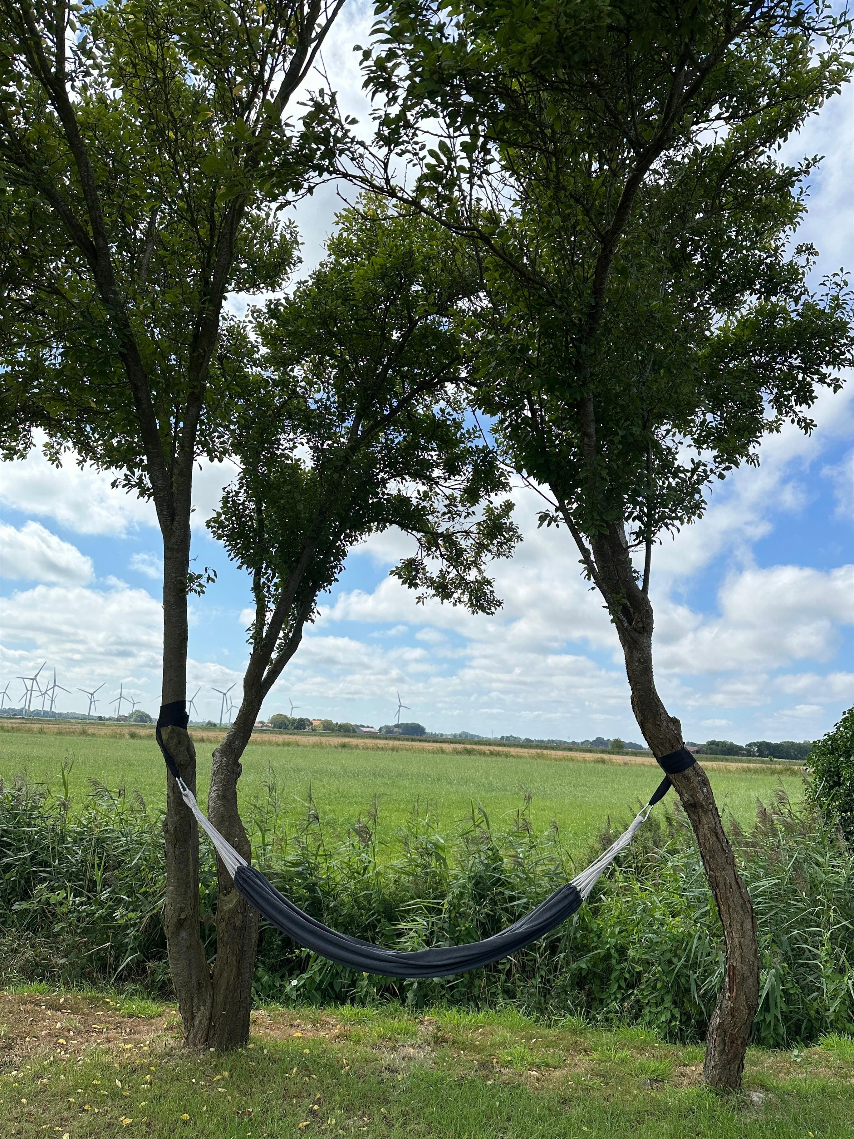 Weiterhin sind zwei Sonnenliegen vorhanden, ein Strandkorb, eine Hängematte und eine Hängebank.