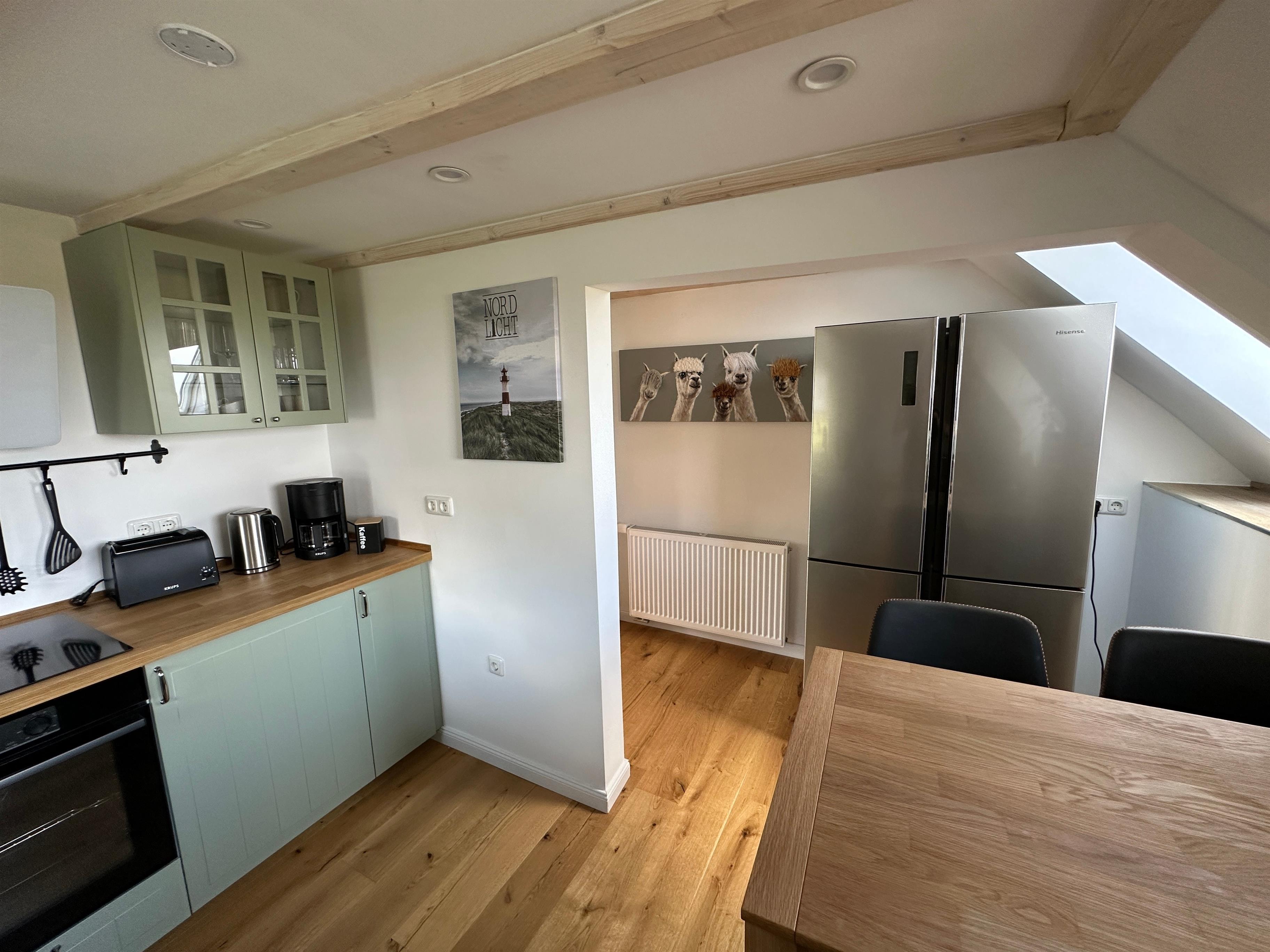 In der Küche essen Sie an einem Hochtisch mit vier Barhockern und können durch die Fenster auf den nahen Deich blicken.