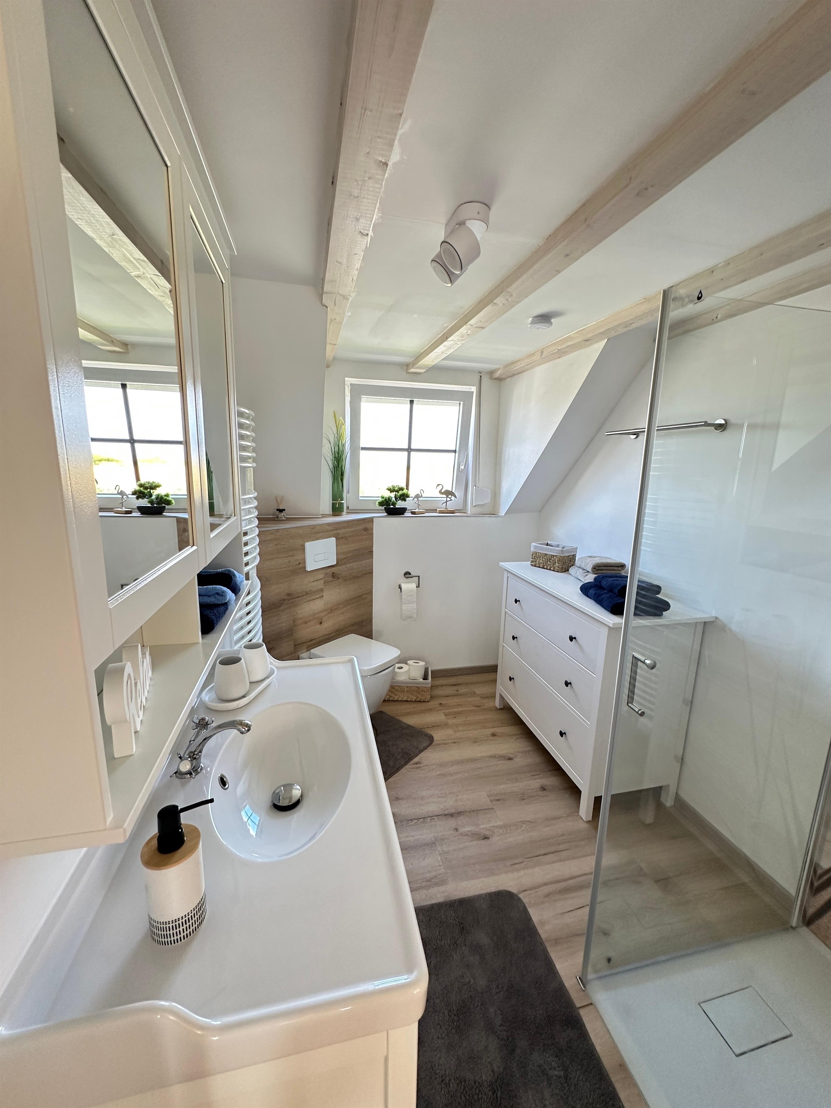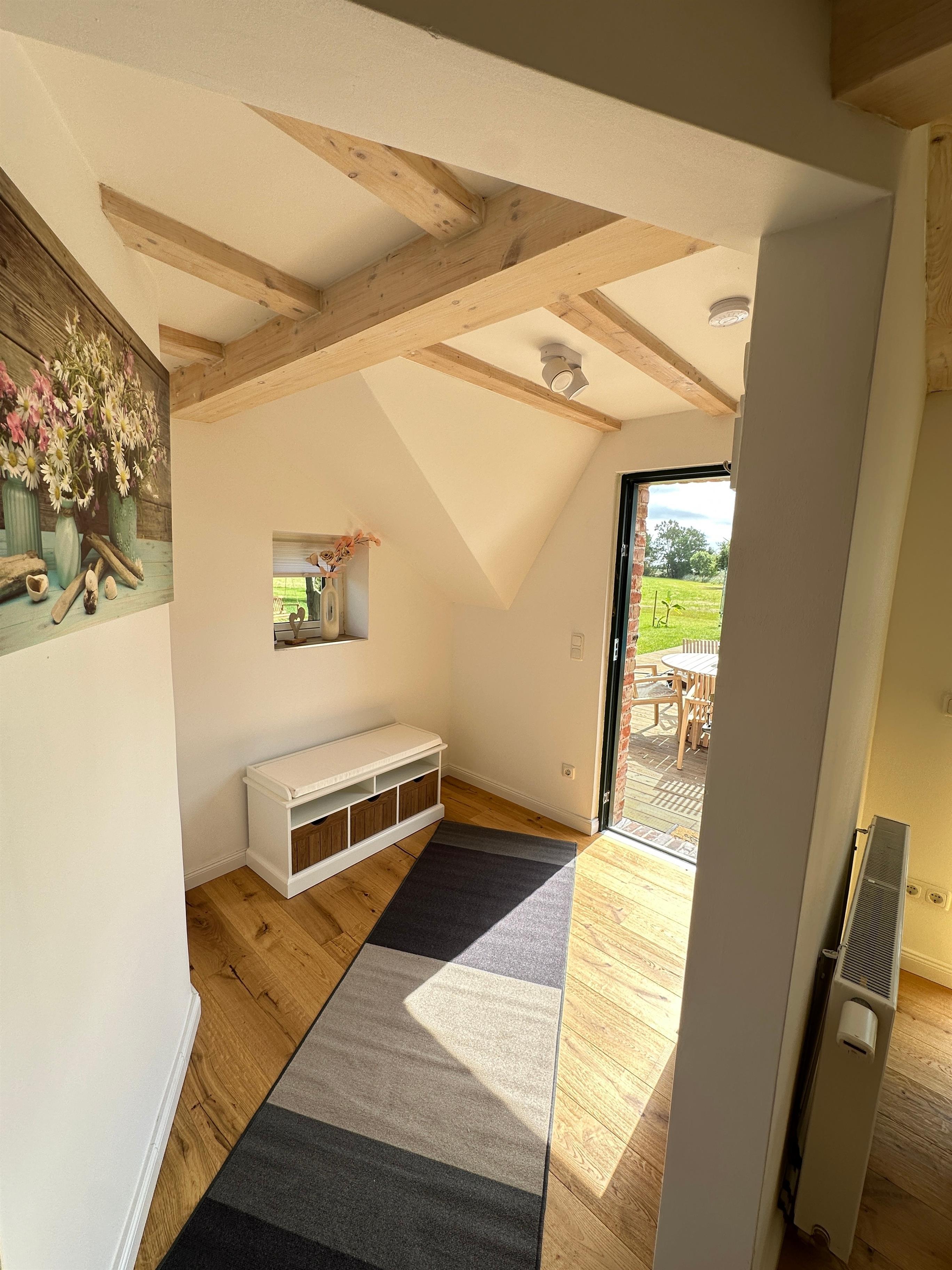Frisch erstellte Ferienwohnung im Erdgeschoss mit ca. 85 m² Wohnfläche, verteilt auf zwei Schlafzimmer, ein Wohnzimmer, ein Bad mit Dusche und WC und eine Küche mit Einbauküche.