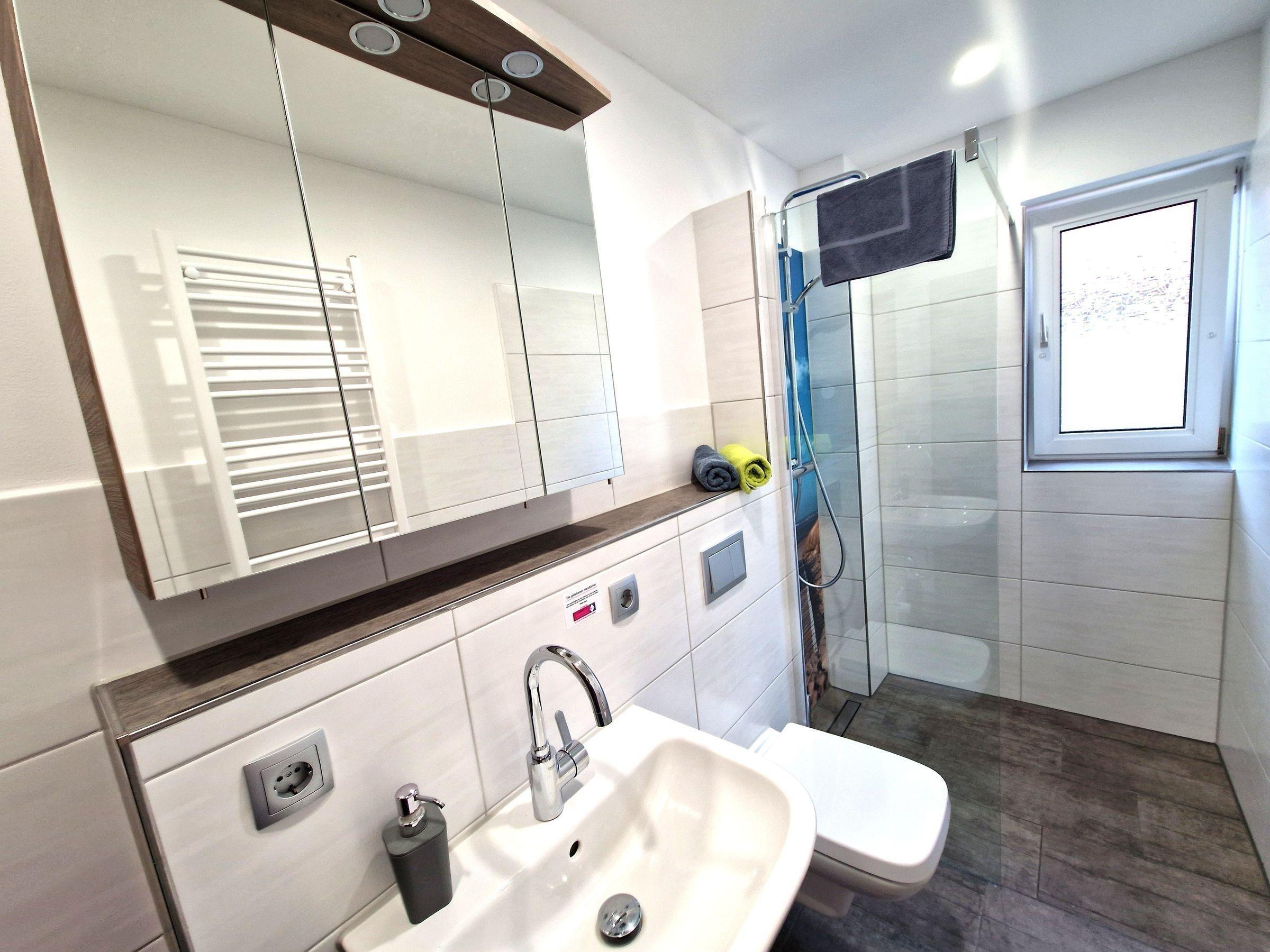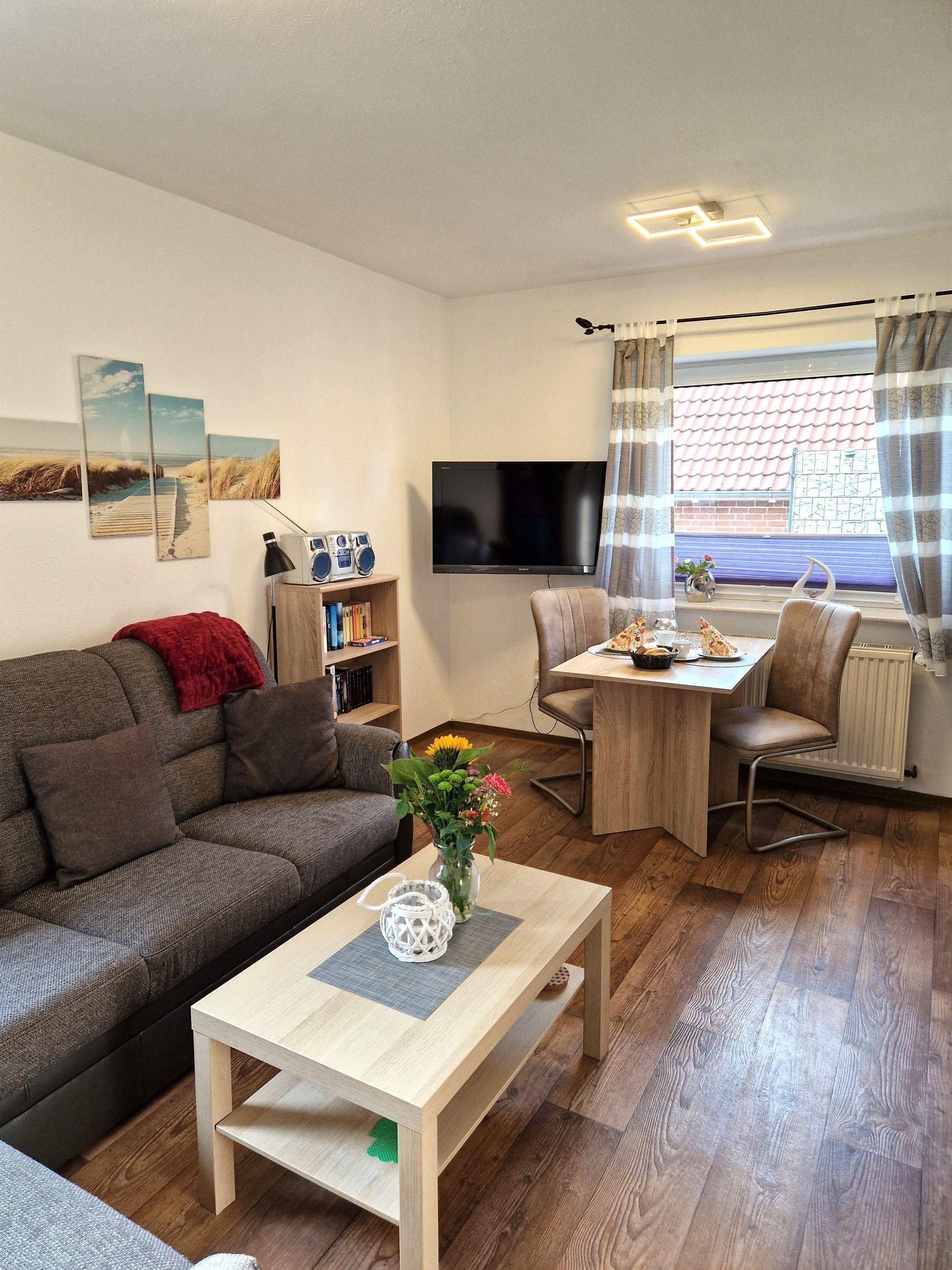 Die gemütliche Ferienwohnung im Erdgeschoss bietet auf etwa 40 m² Platz für 2 Personen und ein Baby. Sie umfasst einen einladenden Wohn-/Essbereich mit bequemer Sofagarnitur und großem Fernseher. Die gut ausgestattete Küchenzeile verfügt über einen Kühlschrank mit Gefrierfach, Backofen, Ceranfeld und Spülmaschine. Ein angrenzendes Schlafzimmer und ein modernes Duschbad ergänzen die Ausstattung.