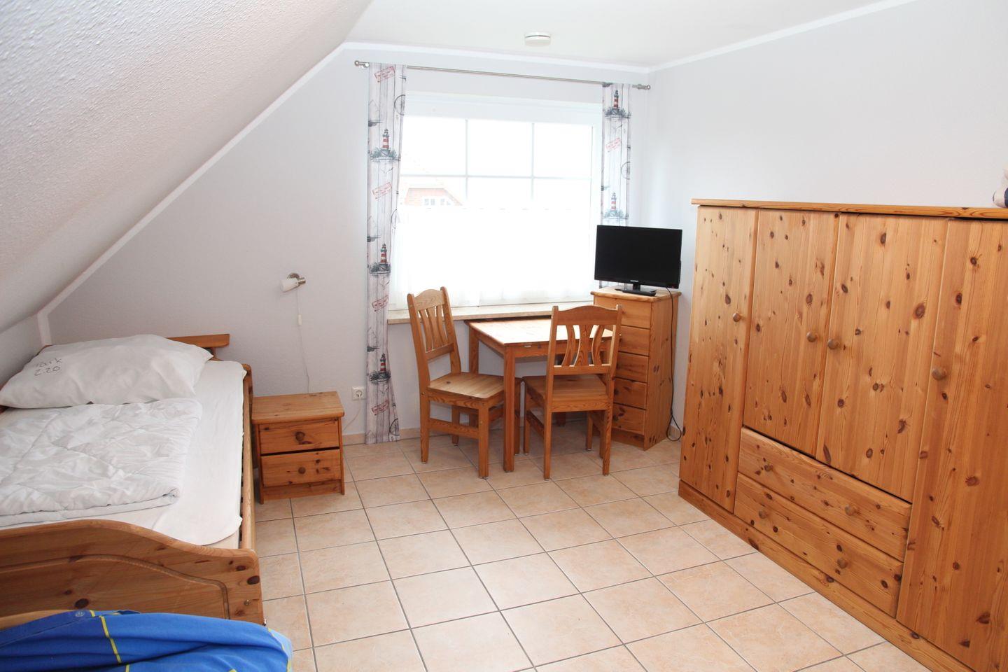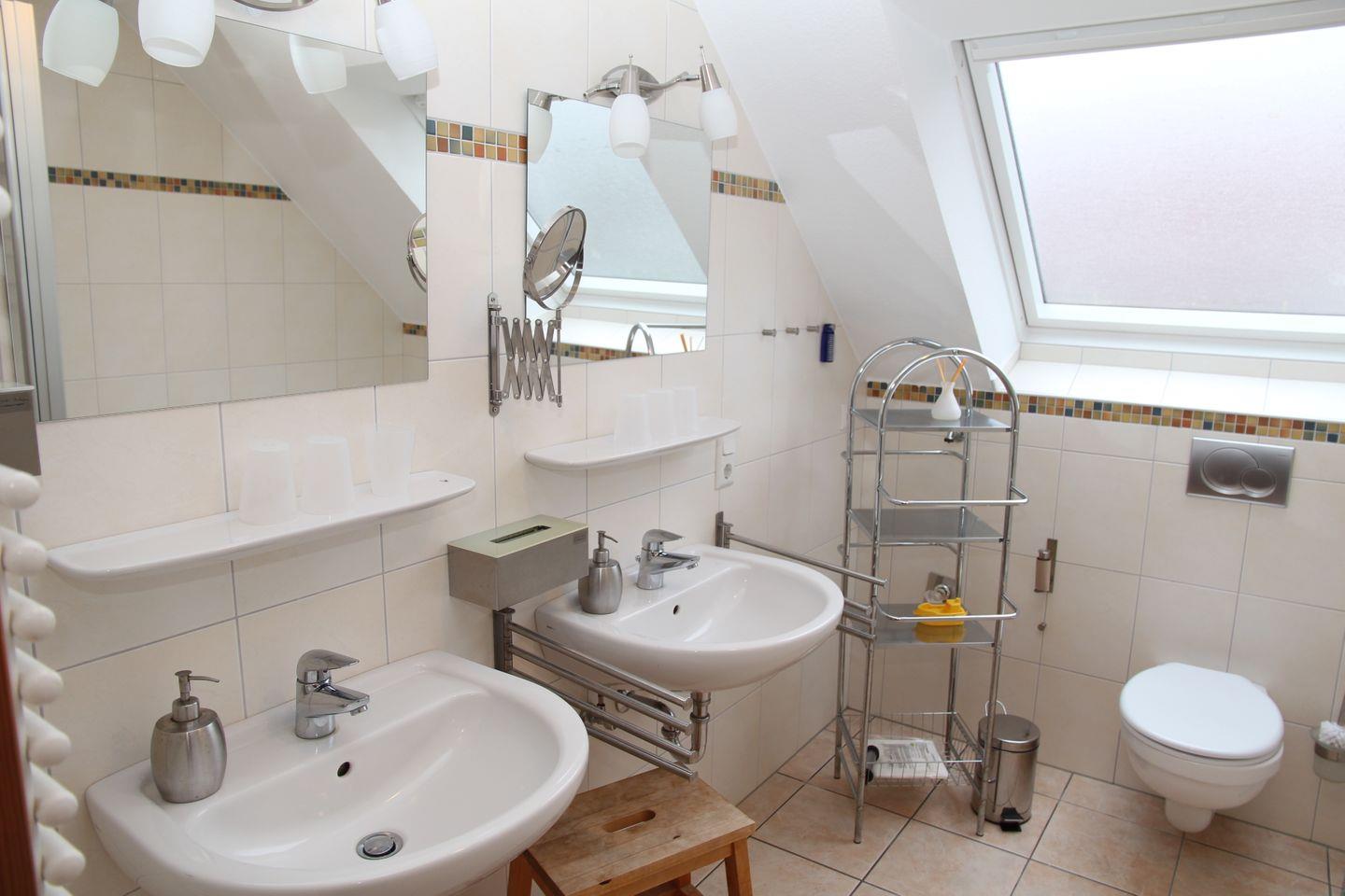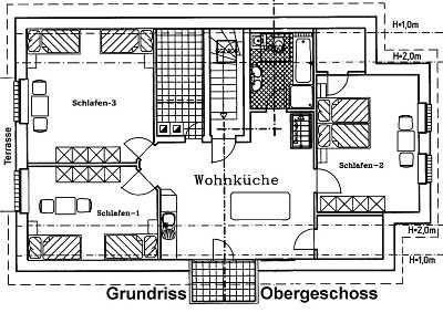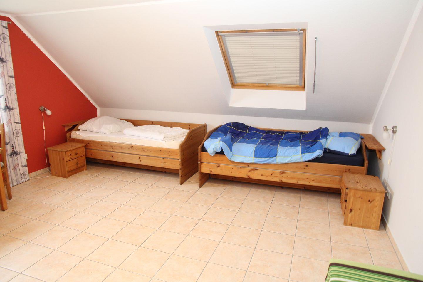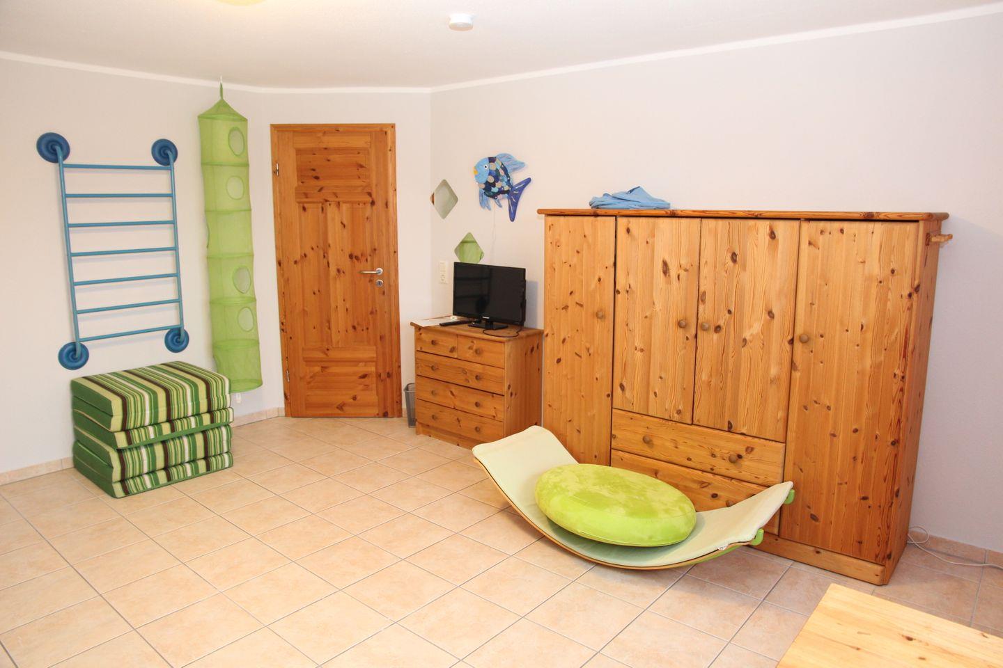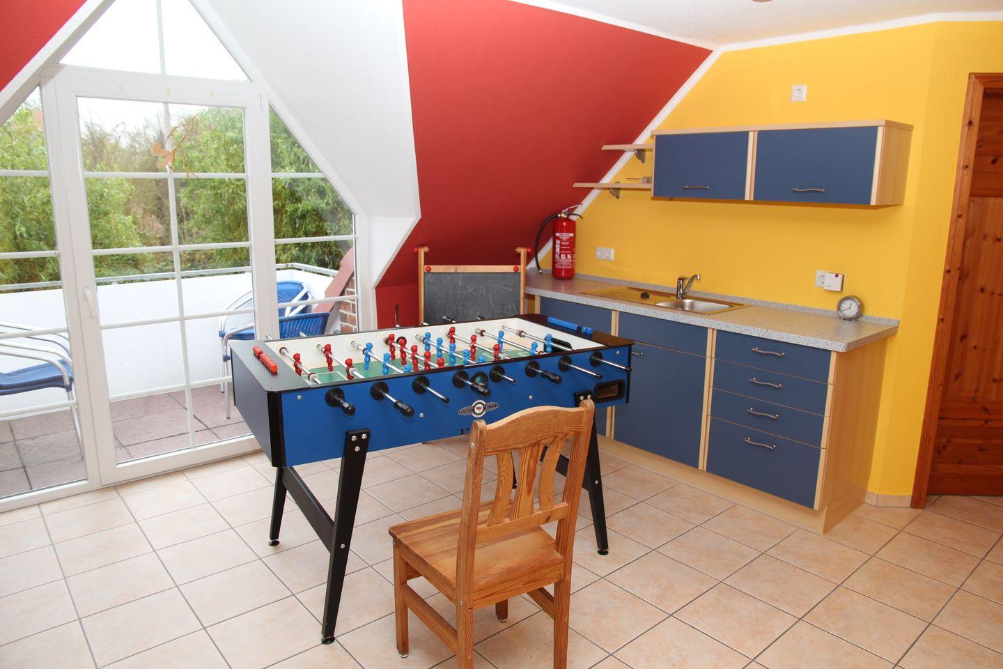 OG: Badezimmer mit 2 Waschtischen, Dusche, Badewanne und WC, 3 Schlafräume (19, 17 und 24 qm groß) jeweils mit Kleiderschrank, Tisch und 2 Stühlen ausgestattet. Diverse Spiel- u. Turngeräte sind an der Wand montiert. Zentraler Wohnbereich (26 qm) mit Miniküche, Spüle, Kühlschrank und Kaffeemaschine, Balkon und Platz für Kicker oder kleine Tischtennisplatte.