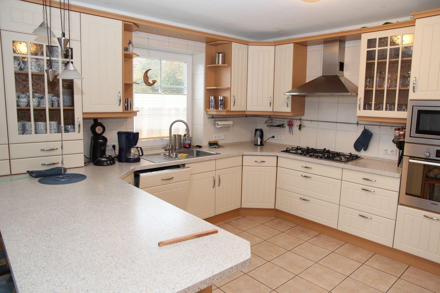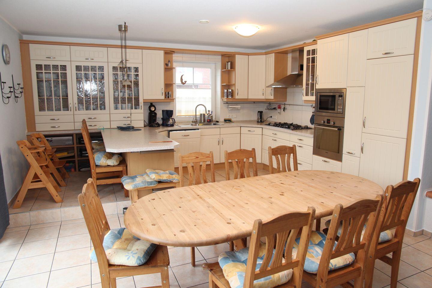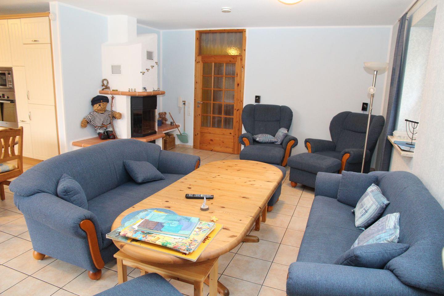 Wohn- Essraum mit integrierter Küche (51 qm), mit Kaminofen, Sitzbereich mit 2 x 3er Sofas, 2 Ohrenbackensessel und Hockern, höhenverstellbarem Couchtisch mit Ausziehplatten, Esstisch mit Ausziehplatten für 12 Personen, große 4**** Küche mit allem erdenklichen Komfort wie 2 Kühlschränke, Gefrierschrank, 5 Flammen-Gaskochfeld mit Wok-Brenner, hoch gesetzem Backofen und Mikrowelle, Spülmaschine, Sitzecke an der Arbeitsfläche und vieles mehr.