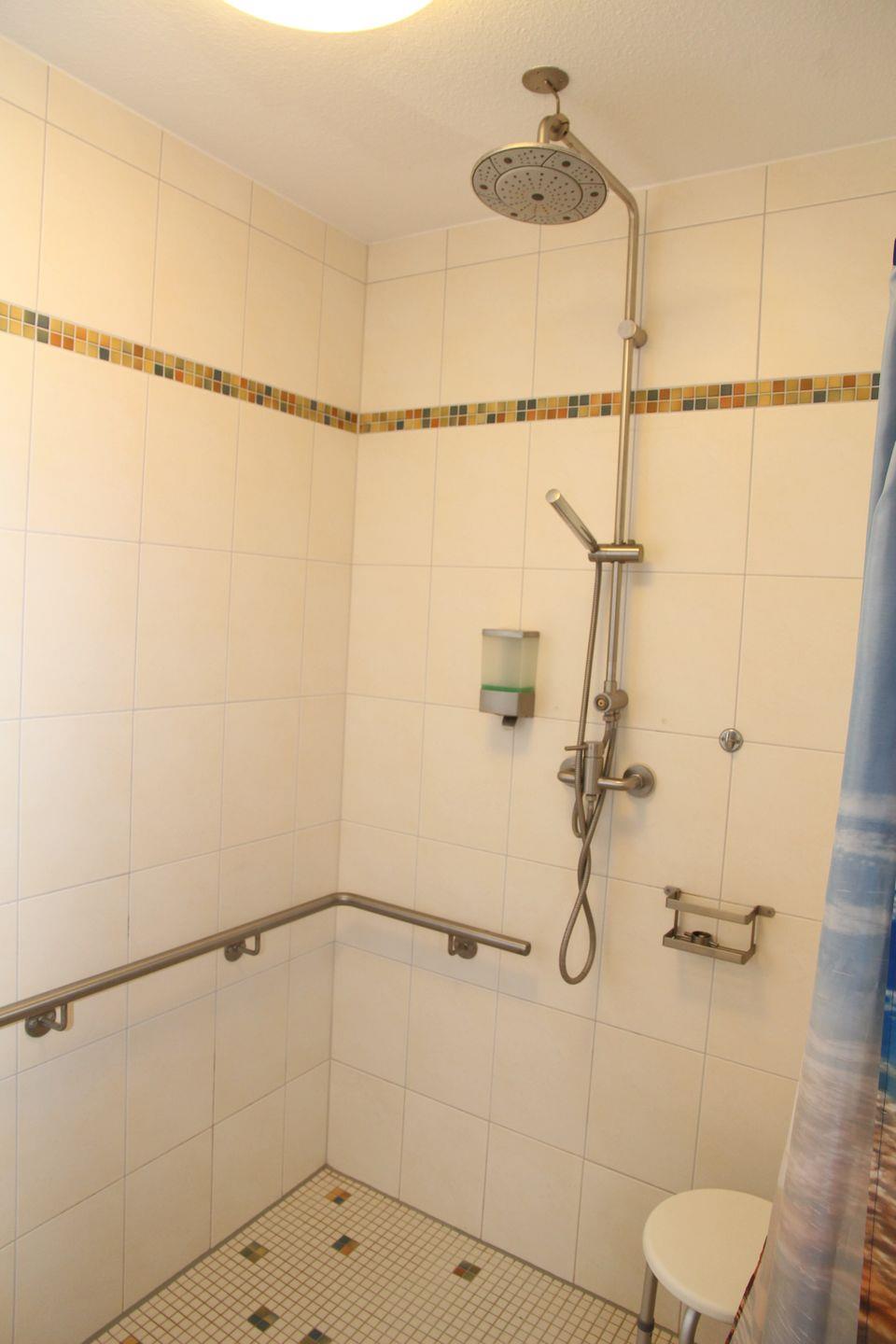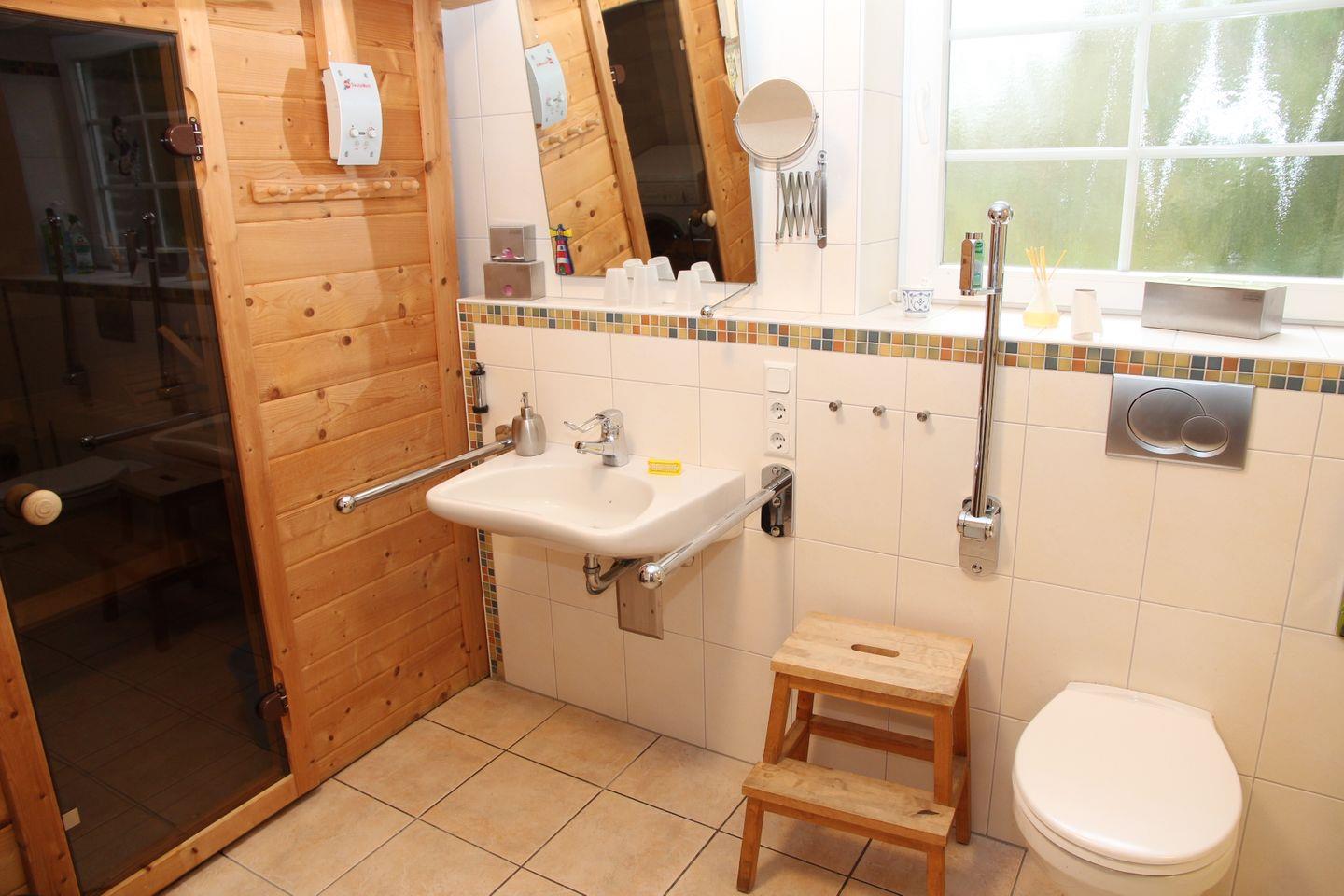 Eingangsbereich: Gäste-WC, Schlafzimmer (20 qm) mit Doppelbett, rollstuhlgeeignet mit Abstellplatz für einen Rollstuhl, Großes Badezimmer (13,5 qm), rollstuhlgeeignet, mit Sauna (2 x 2 m), Waschmaschine und Trockner, Dusche mit allen Einrichtungen für einen Rollstuhl.