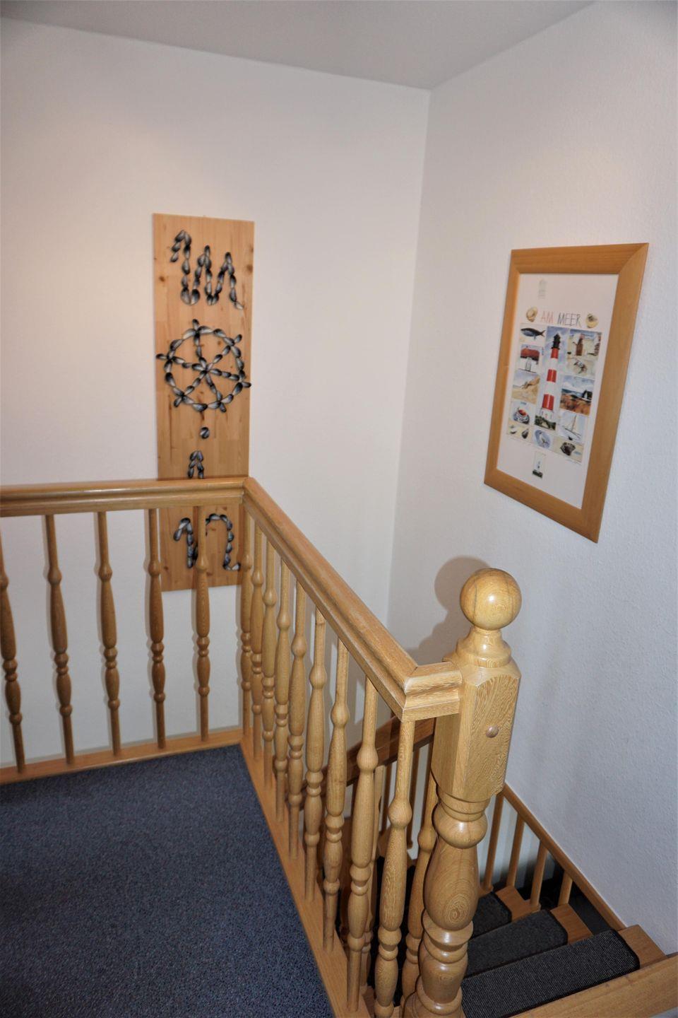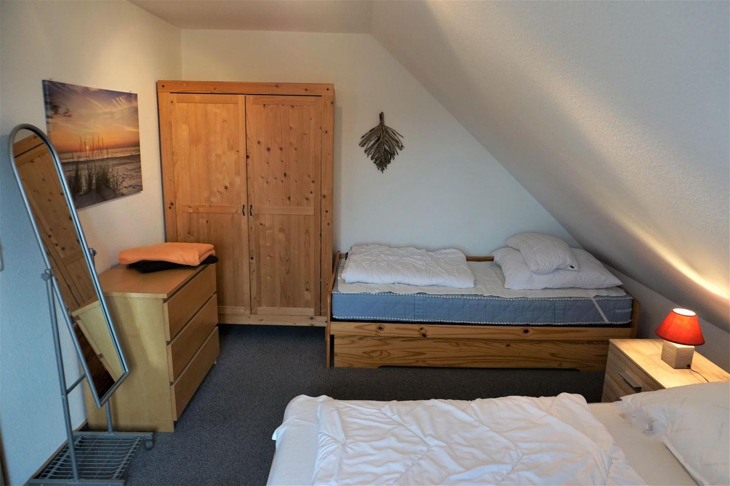 Über die schöne Holztreppe gelangt man in das Obergeschoss mit den zwei Schlafzimmern: Das erste Schlafzimmer ist mit einem Doppel- und einem Einzelbett sowie einem Kleiderschrank ausgestattet. Im zweiten Schlafzimmer finden Sie zwei Einzelbetten, einen weiteren Kleiderschrank, diverse Spielsachen für Kinder und einen Sitzplatz im lichtdurchfluteten Erker. Auch das Duschbad mit Doppelwaschbecken und Waschmaschine befindet sich in dieser Etage.