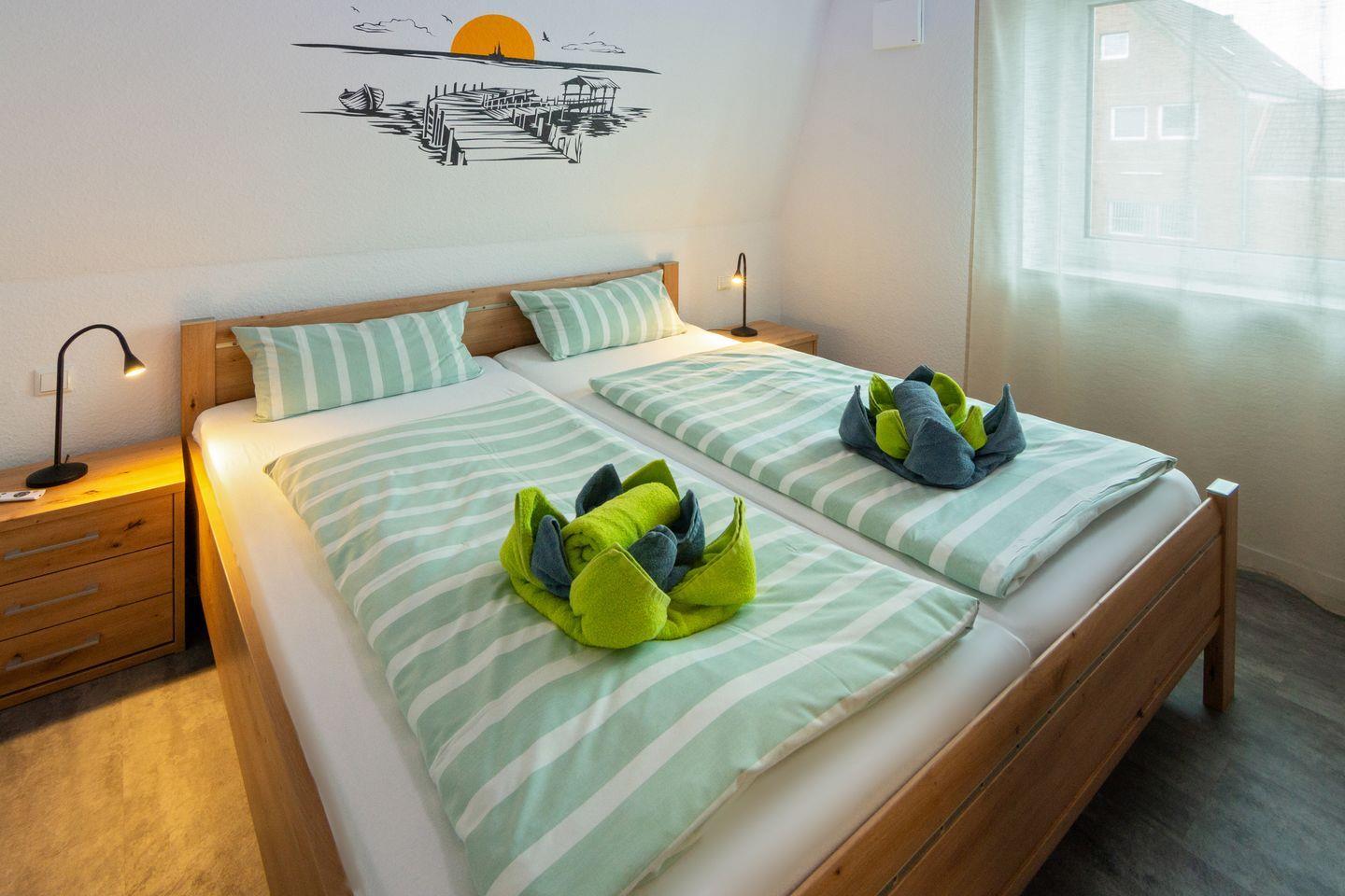 Die Wohnung bietet zwei Schlafzimmer - eins mit einem Doppelbett und ein weiteres mit 2 Einzelbetten.