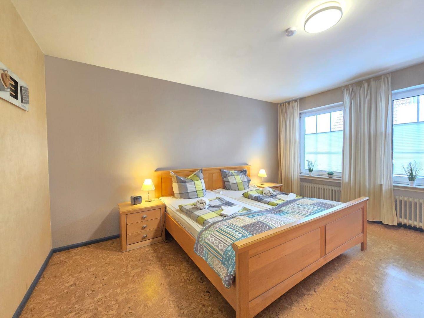 Schlafzimmer: Komfortables Doppelbett für erholsame Nächte. Bettwäsche und Handtücher können gegen Aufpreis hinzugebucht werden.