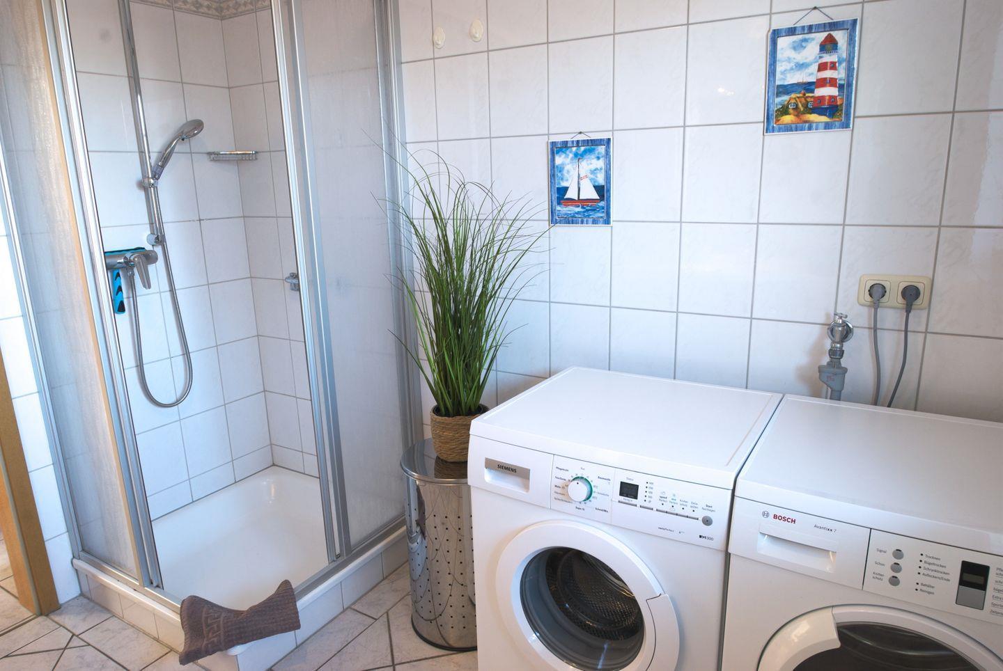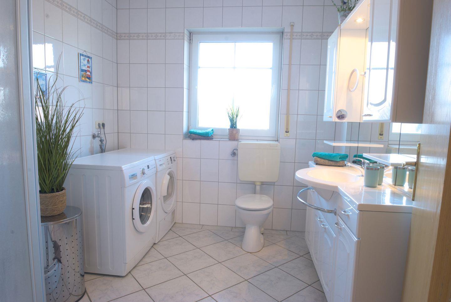 Das Badezimmer ist mit Waschmaschine und Trockner ausgestattet – ideal für längere Aufenthalte.