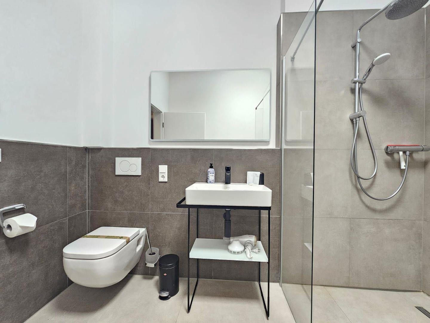 Das elegant gestaltete Badezimmer verfügt über eine komfortable Dusche sowie alle notwendigen Annehmlichkeiten für Ihren Aufenthalt. Die moderne Ausstattung sorgt für ein angenehmes Wohlfühlambiente.