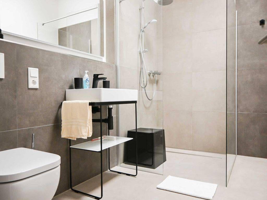 Das moderne Badezimmer verfügt über eine bodengleiche Dusche, ein WC und einen Haartrockner. Die klare, zeitgemäße Gestaltung sorgt für ein gepflegtes Wellnessgefühl.