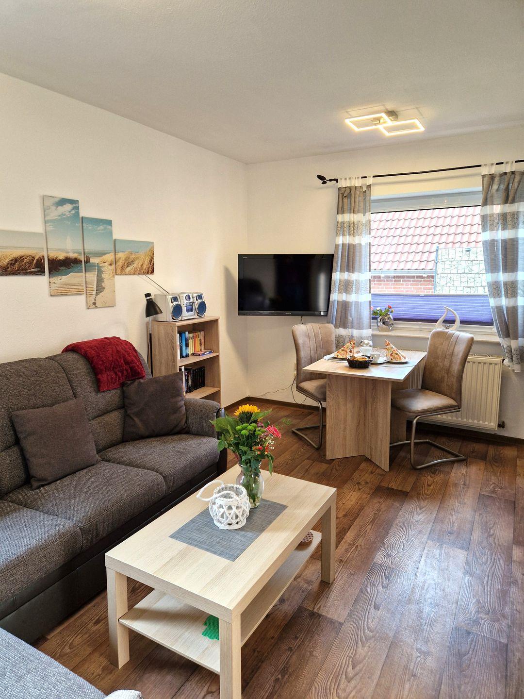 Die Ferienwohnung verfügt über einen Wohn/Essbereich mit einer bequemen Sofagarnitur und einem großen Fernseher.