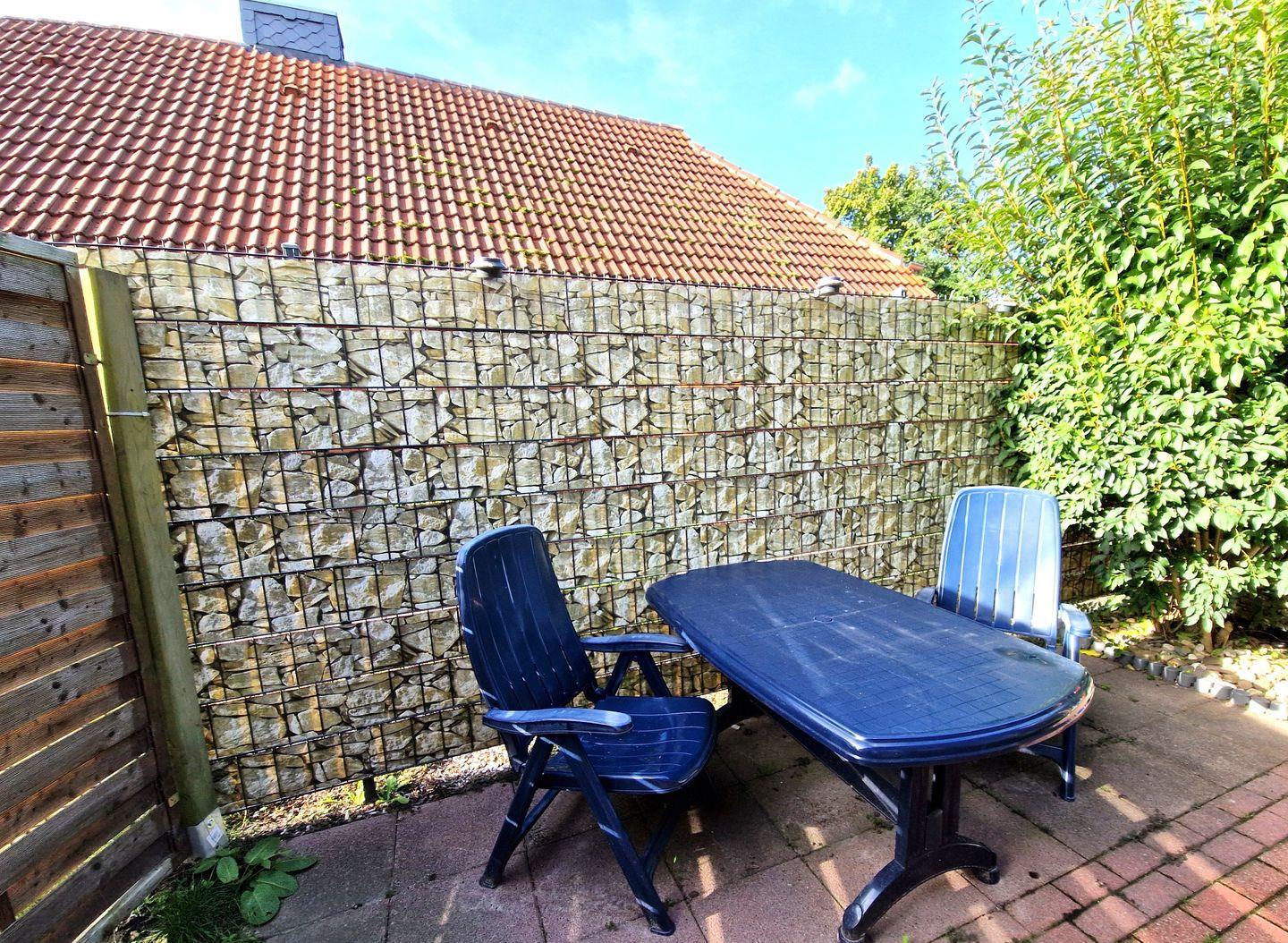 Seitlich vom Haus ist die Terrasse. Dort können Sie bei einem gemütlichen Glas Wein den Tag ausklingen lassen .
