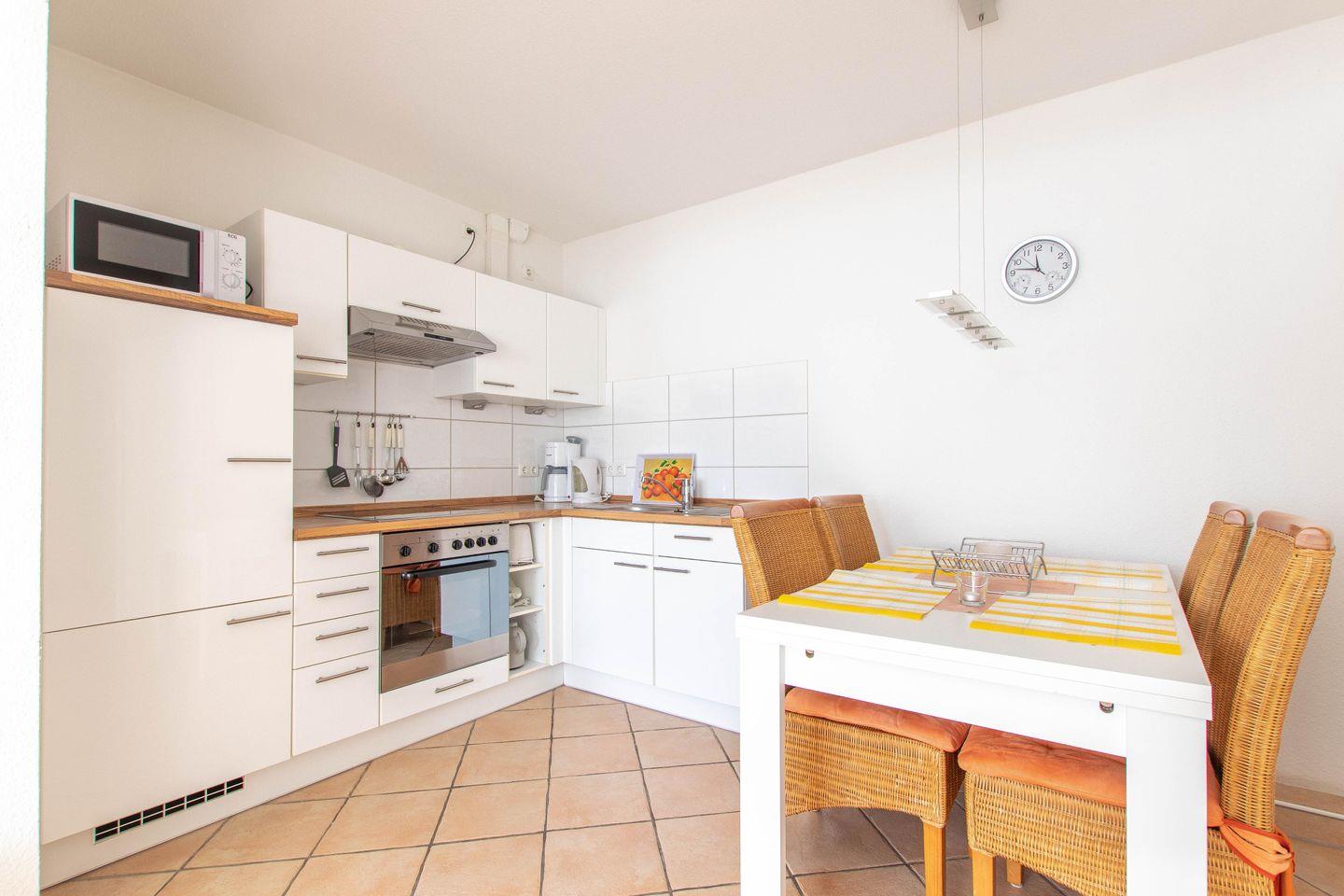 In der modernen Wohnung stehen Ihnen unter anderem eine Kaffeemaschine (Filter) sowie eine Mikrowelle zur Verfügung. Die Nichtraucherwohnung verfügt außerdem über eine Küchenzeile und eine offene Wohnküche. Auf der gemeinschaftlich genutzten Terrasse und im Garten können Sie die Nordseeluft genießen.
