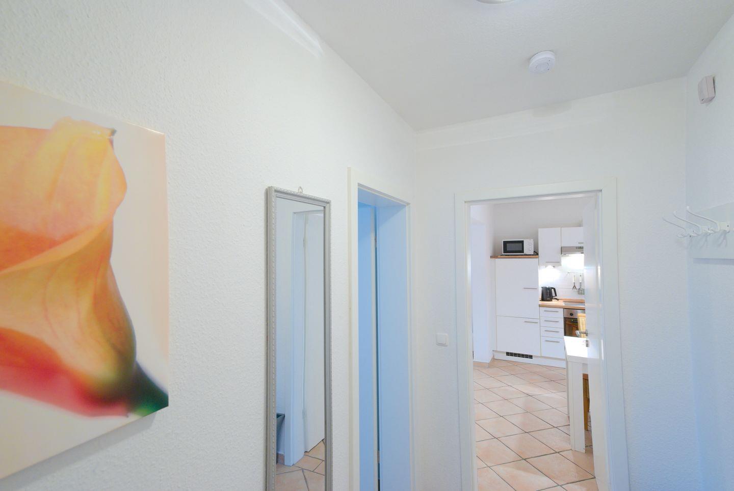 Die Wohnung Möwe 1 befindet sich im Erdgeschoss eines ruhig gelegenen Wohnhauses. Die Wohnung ist freundlich hell eingerichtet und verfügt über ein Schlafzimmer mit Doppelbett und Kleiderschrank.